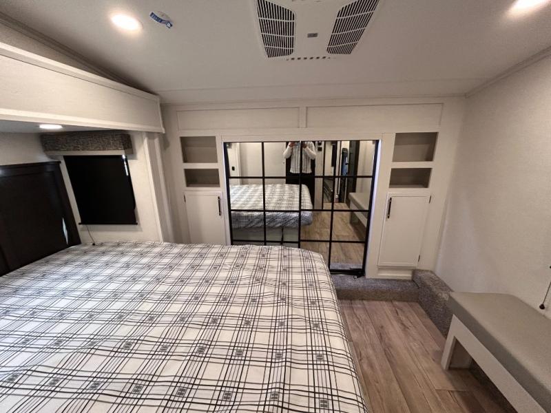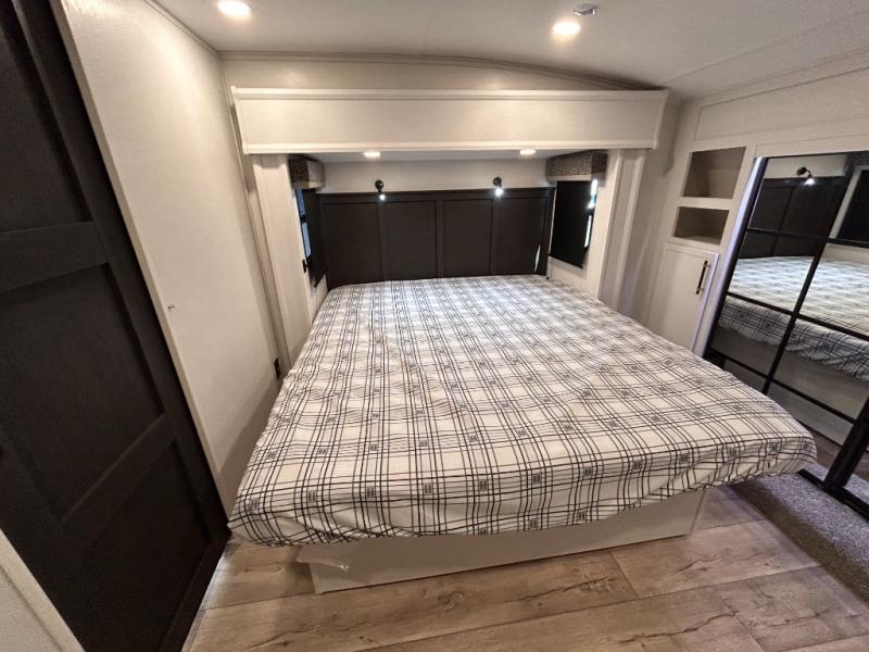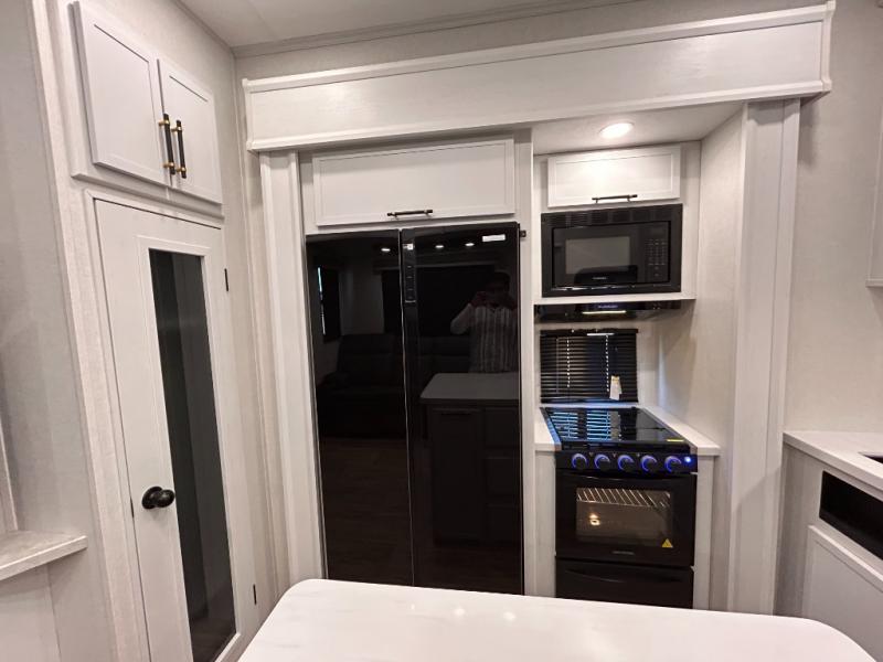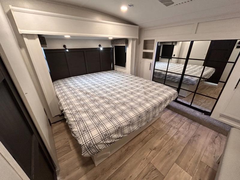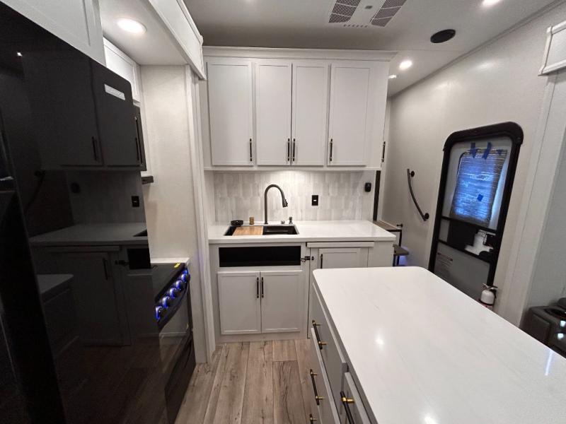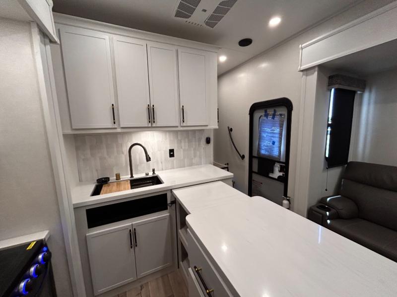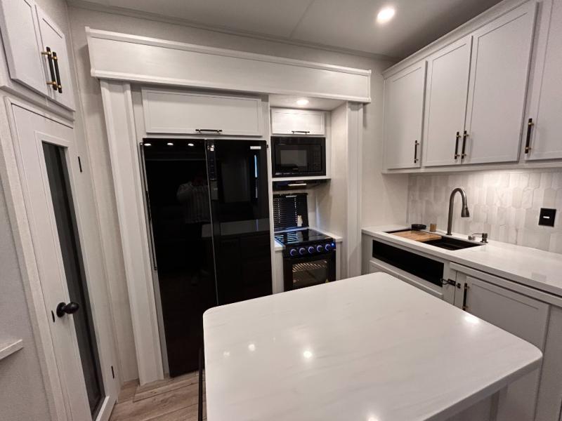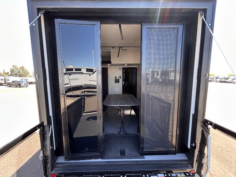 14FT CARAGE / 5.5K GENERATOR /Automatic Leveling System/ 3 AC's / Slide Toppers/Two Bathrooms/ 3 SEASON DOOR