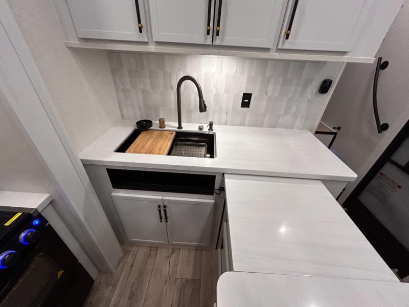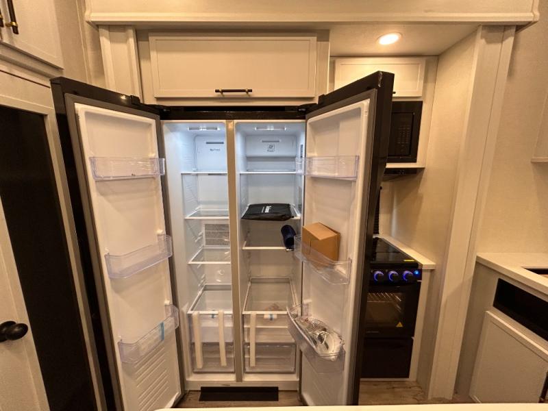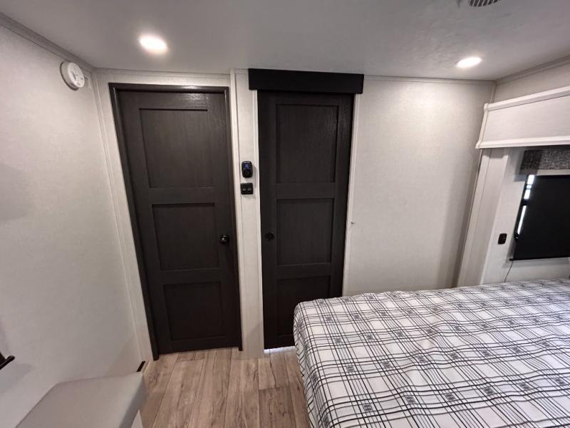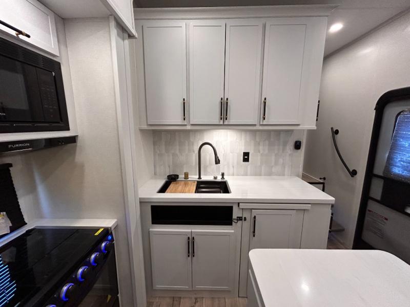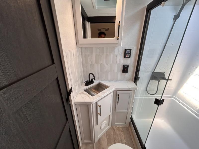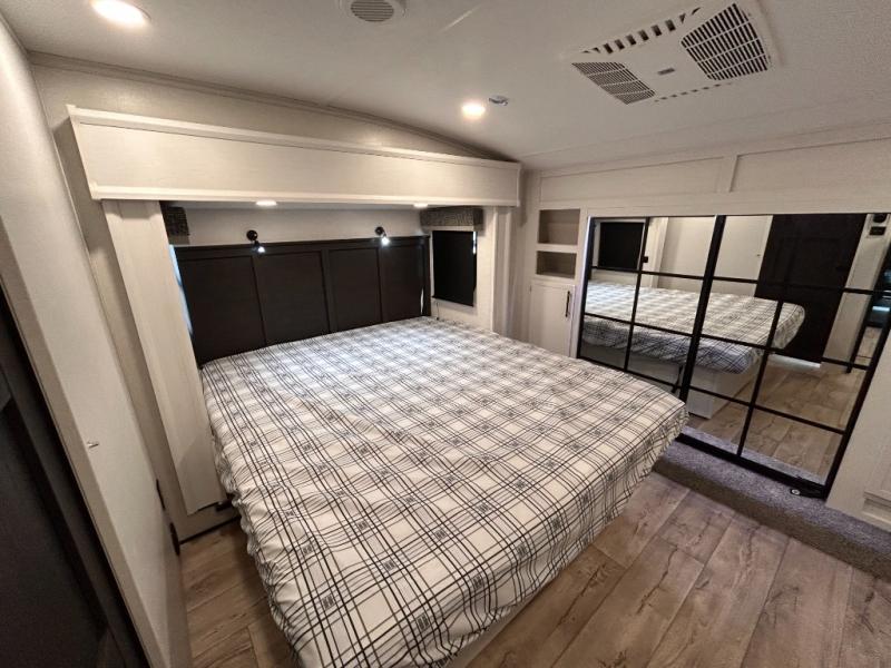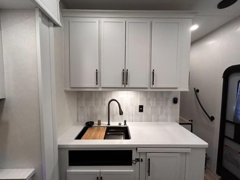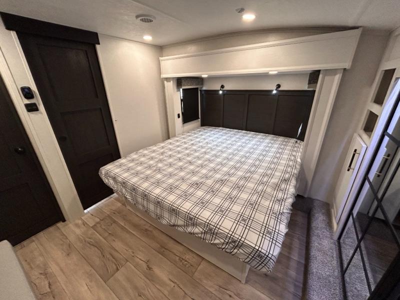 14FT CARAGE / 5.5K GENERATOR /Automatic Leveling System/ 3 AC's / Slide Toppers/Two Bathrooms/ 3 SEASON DOOR