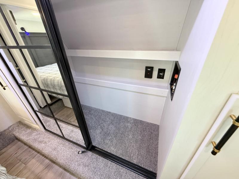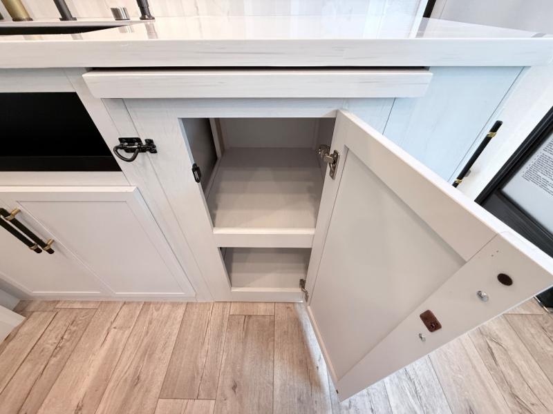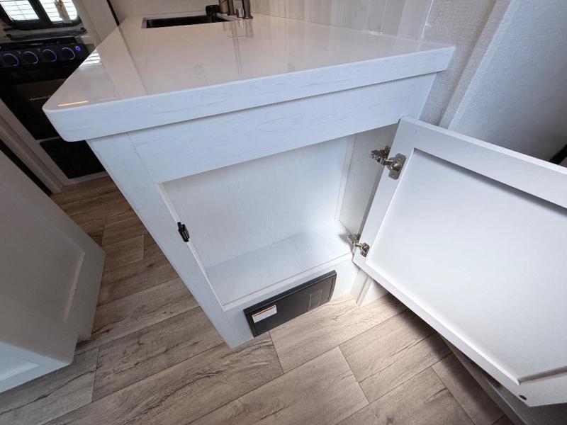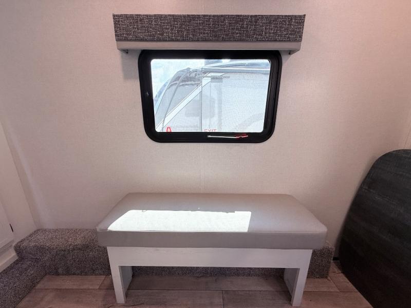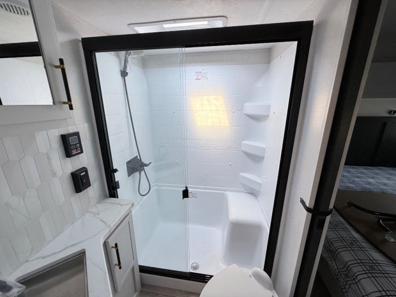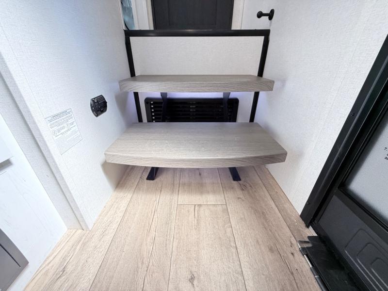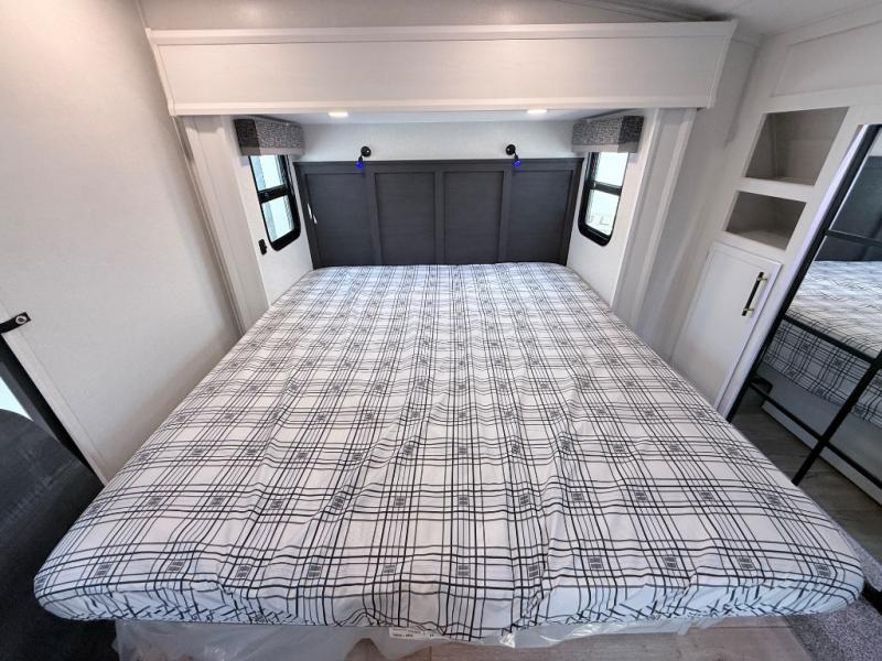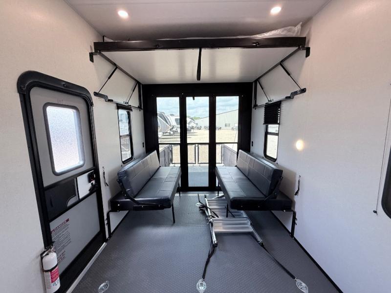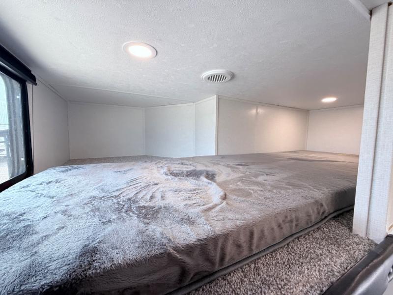 This toy hauler includes dual entry doors for a smooth flow of traffic, a bath and a half for hassle-free camping, plus a 14' separate garage for your favorite toys! The garage also includes a bed lift system and lay-flat Happi Jack seating plus a loft bed for more sleeping space. You'll find your own space up front in the private bedroom, complete with a king bed slide out and a large front closet to keep your things organized. And the full bath with a walk-in shower is close by for easy nighttime use! Everyone can meet in the middle kitchen and living room to enjoy the reclining sofa with a footrest and 50" TV while the chef whips up dinner on the three burner cooktop! There is also a kitchen island for more counter space plus a pantry and 16 cu. ft. 12V refrigerator for food storage!
