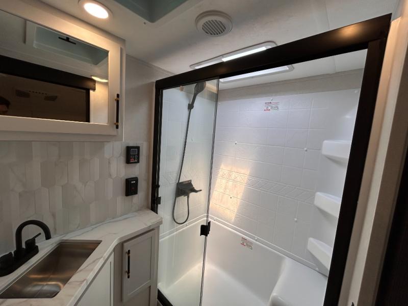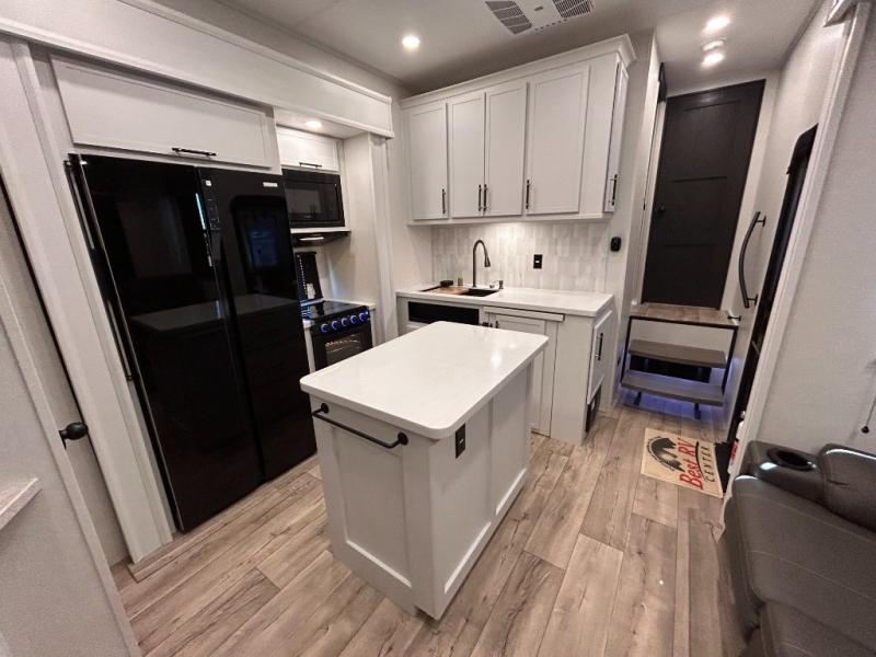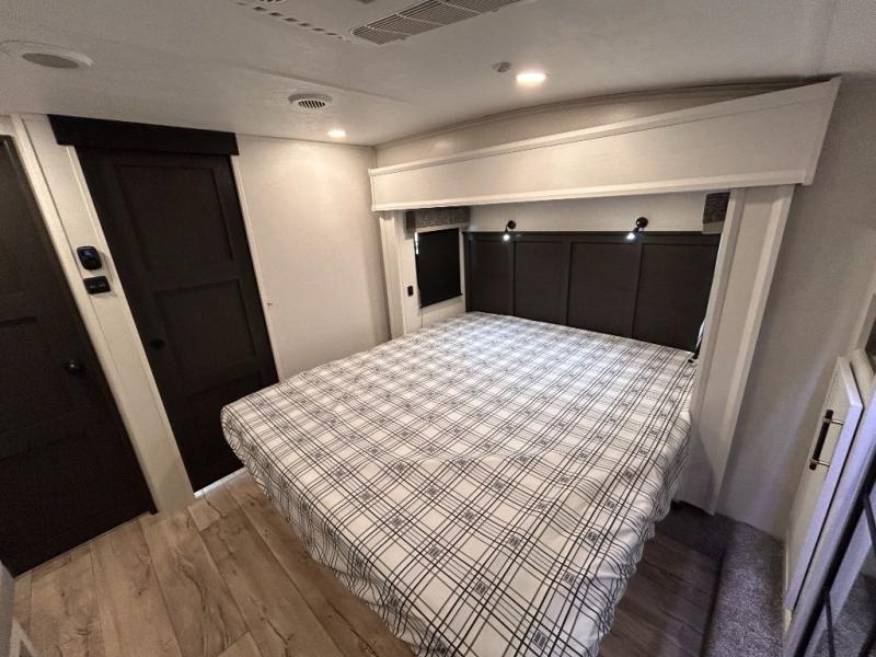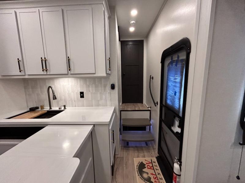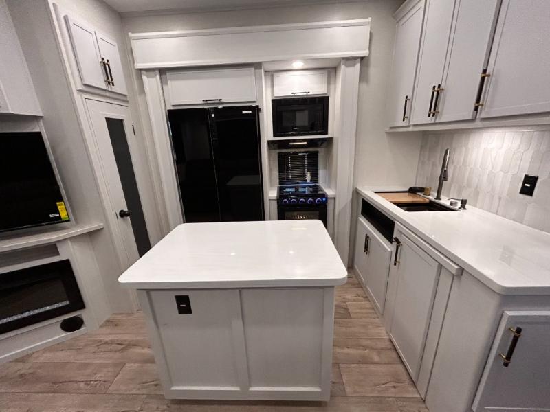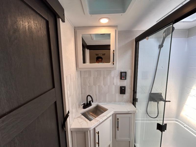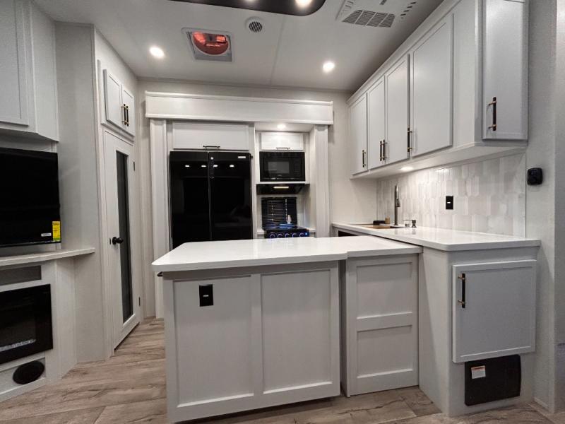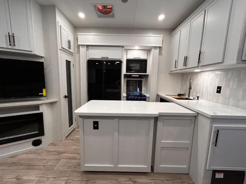 14FT CARAGE / 5.5K GENERATOR /Automatic Leveling System/ 3 AC's / Slide Toppers/Two Bathrooms/ 3 SEASON DOOR