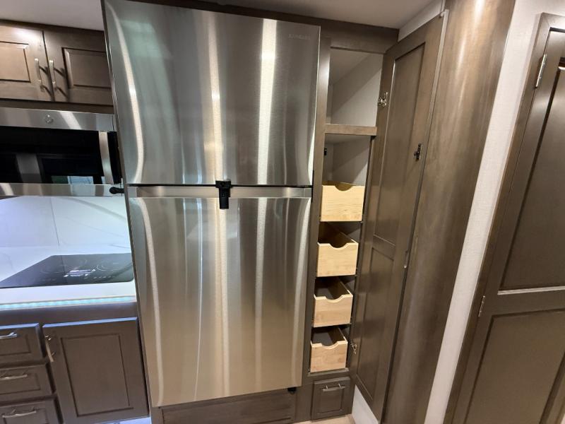 Check out the fabulous features found in this DX3 Super C diesel motorhome! As you spend your nights relaxing in the rear private bedroom, you will appreciate having a 32" LED Smart TV to watch before drifting off to sleep. The Solid Surface Shower Surround with glass door and skylight will be wonderful to see in the morning, and the Oxygenics Body Spa shower head will deliver an enjoyable experience. Step foot into the kitchen and be amazed by the home-like conveniences that have been included, like the residential refrigerator, the convection microwave, the pantry, and the under-cabinet lighting.
