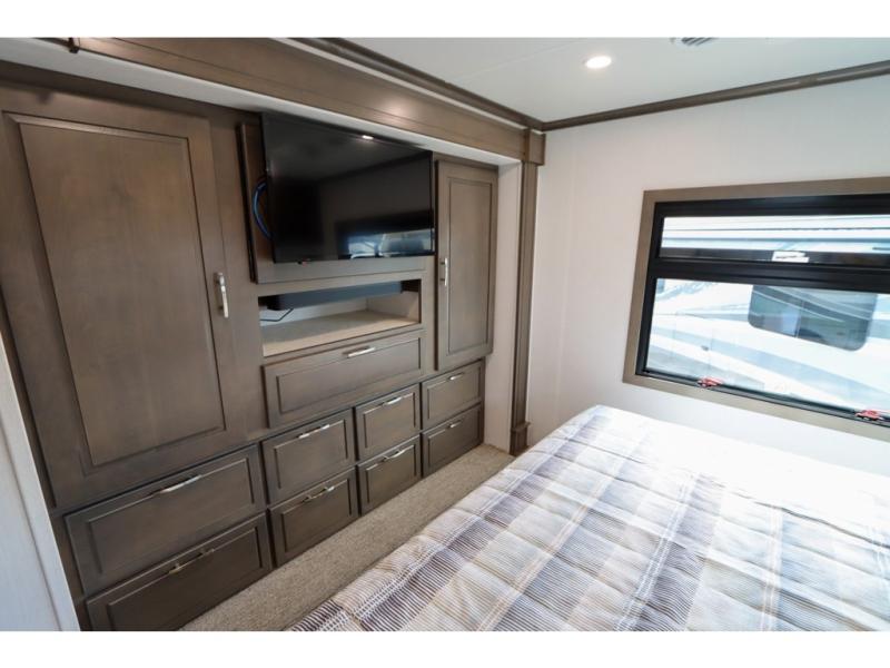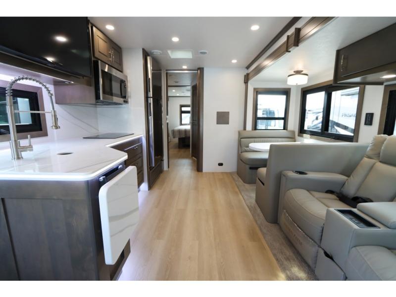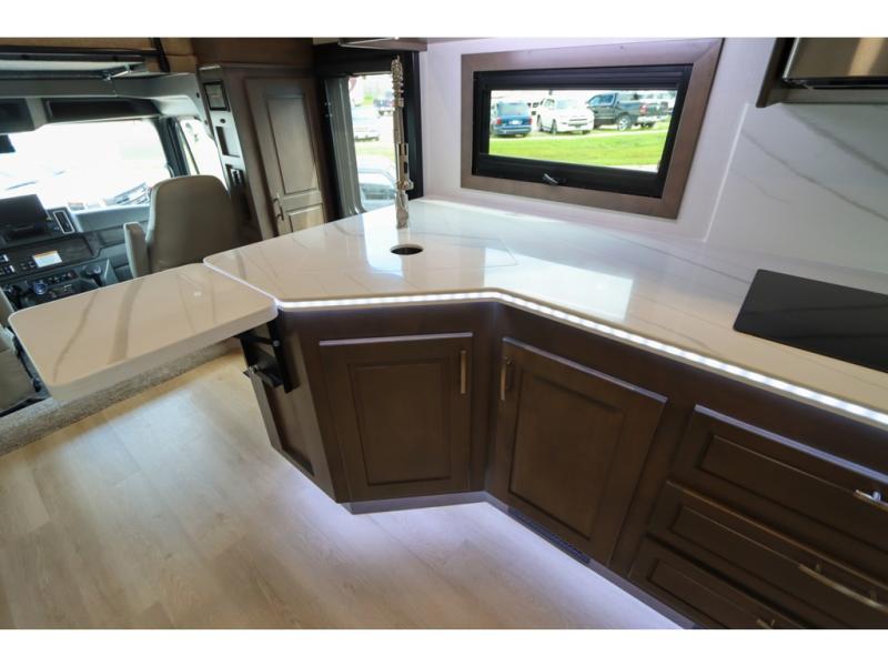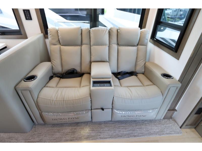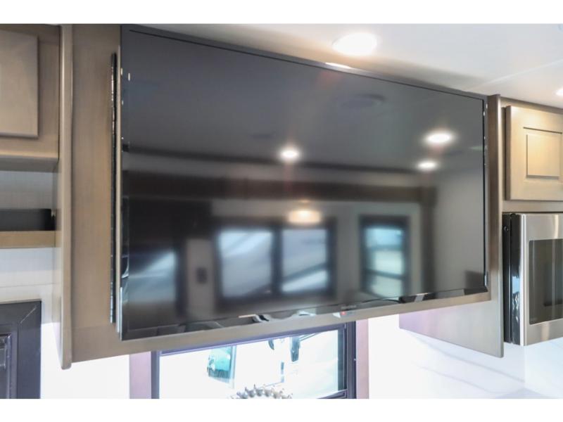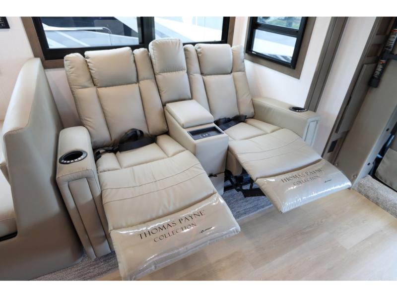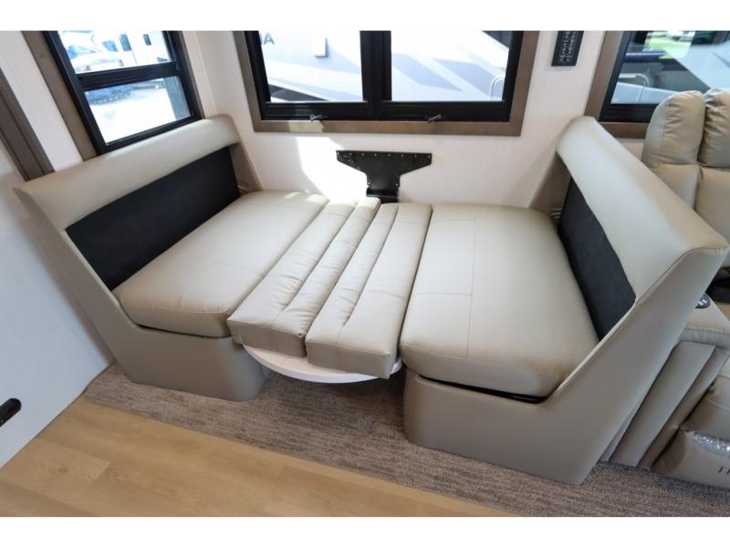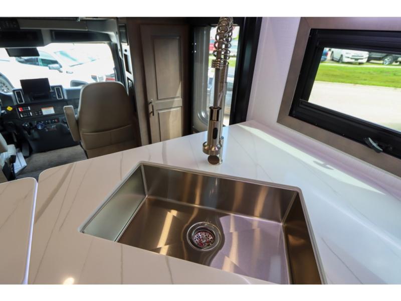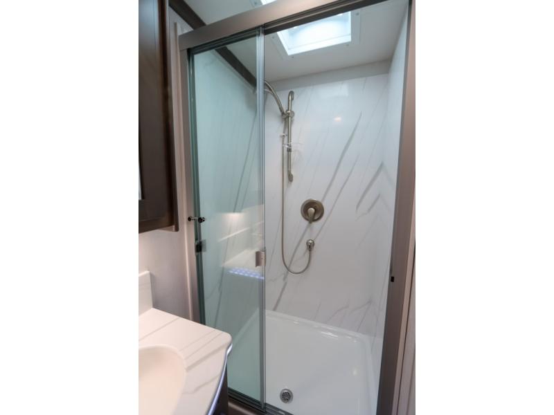 This DX3 Super C diesel motorhome is quite a beast! This coach has excellent sleeping accommodations with its king-size bed, set of bunk beds, Dream Dinette, and sleeper sofa. You can even add more sleeping space to this coach by selecting the optional bunk over cab. As you rest your tired body on the sofa, you'll be able to watch the 39" LED TV directly across from you. The kitchen is also right across from the sofa so that you can still chop veggies on the countertop extension while you enjoy the company of those resting on the furniture. The bathroom is another feature that will grab your attention. This space has a fiberglass shower, a shower skylight, a glass shower door, and an Oxygenics Body Spa RV shower head.
