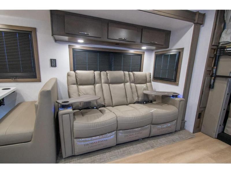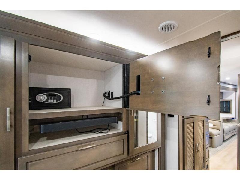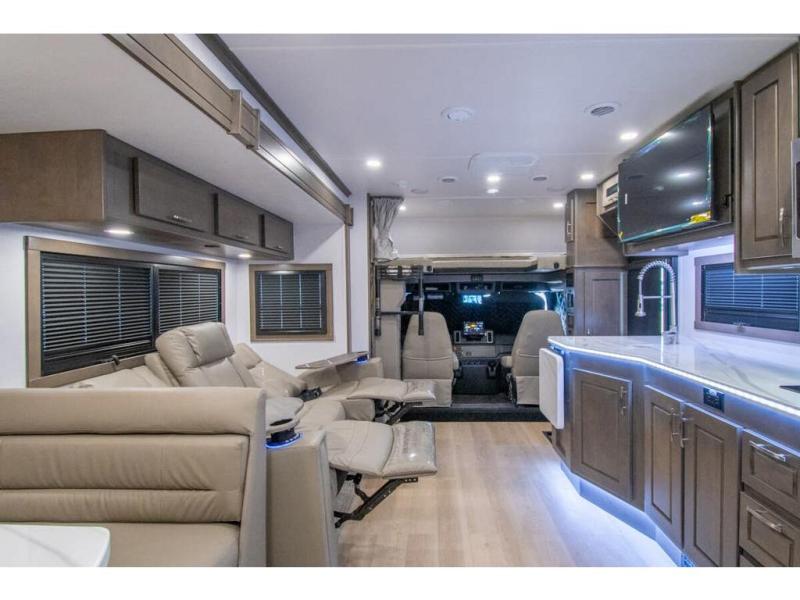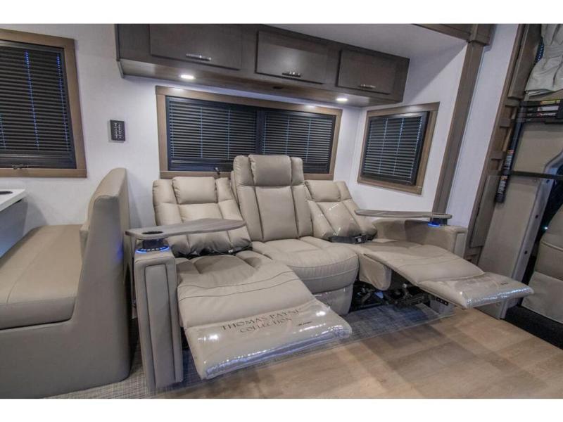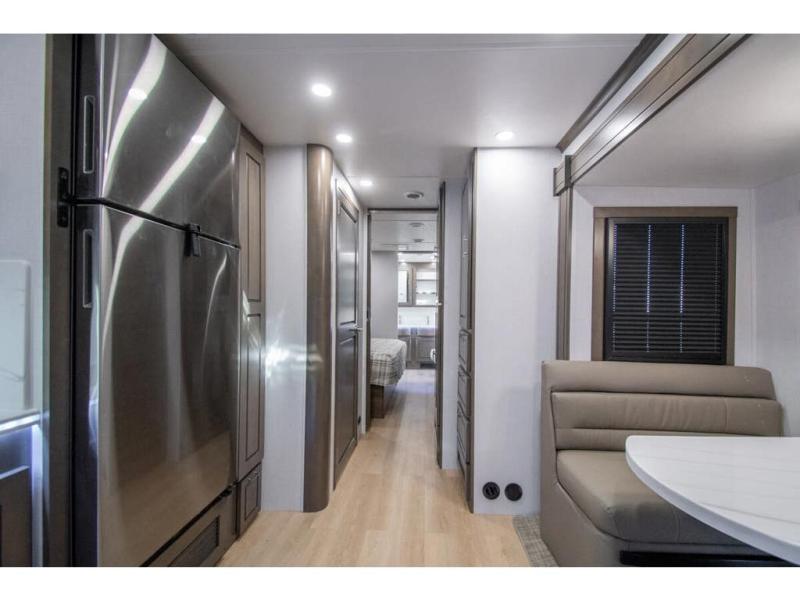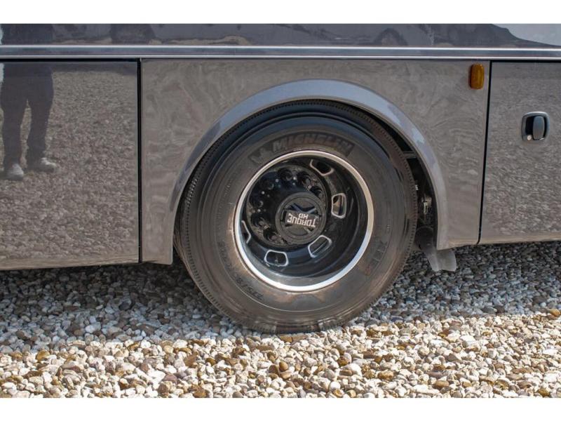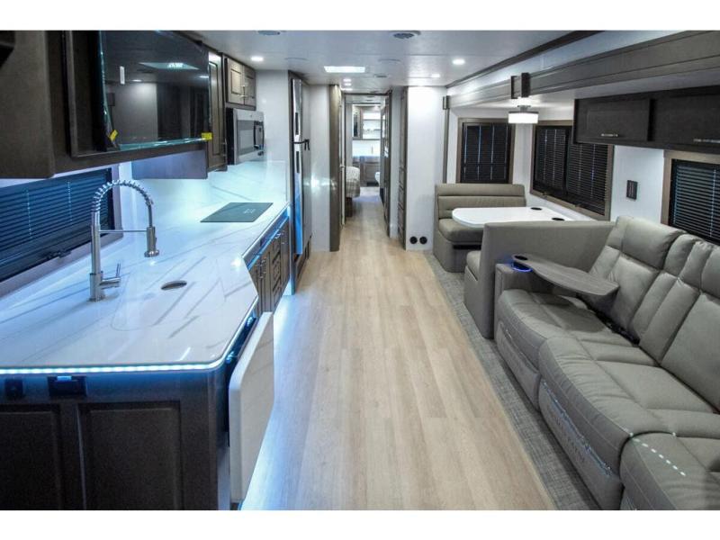This RV is approximately 40 feet 9 inch in length with 3 slides, bath and a half and the new plus chassis with redesigned dash, Cummins L9 turbo diesel engine making 360HP & 1,150 ft.-lbs of torque, air brakes & C-Brake by Jacobs with high/medium/low braking dash switch.