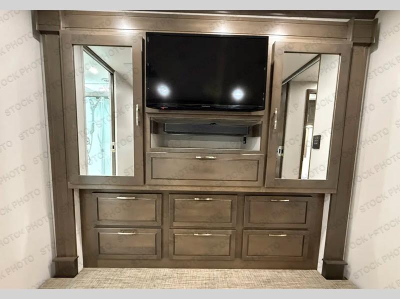 This fabulous DX3 Super C diesel motorhome gives you the feeling of home! You will all love spending the cool summer evenings outside underneath the 18' armless awning with LED lights and wind sensor as you watch a late-night movie on the exterior LED TV. Head inside and grab some snacks from the kitchen pantry or heat up some popcorn in the convection microwave. You can also lounge on the tri-fold sleeper sofa and enjoy the TV inside as well; the sofa also adds more sleeping space for guests. The dream dinette also can be used to sleep or for everyone to gather and enjoy meals or board games. After the day is over, you'll certainly look forward to snuggling up in the king-size bed with night stands at either side, and you´ll be able to store your essentials and camp gear with ease using the two wardrobes along with the drawers, there is also a 32"TV to enjoy series. The rear bathroom has two sinks allowing for two to get ready for the camp day at the same time.