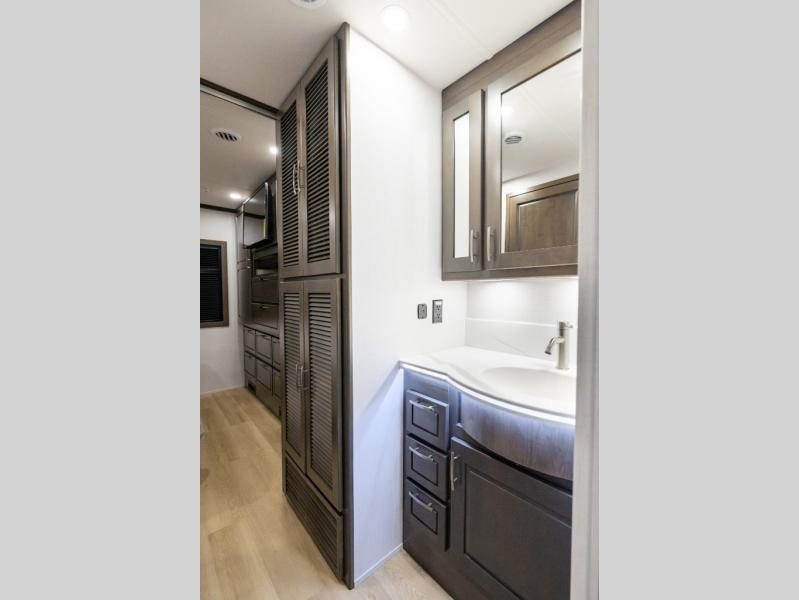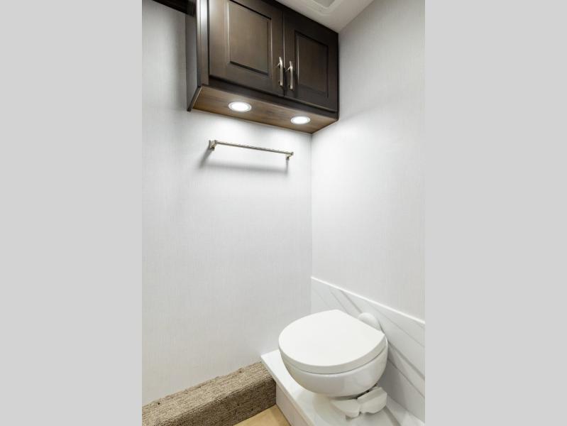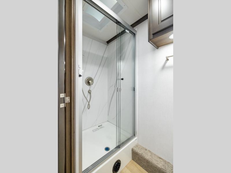 Nothing will stop you from experiencing first-class adventures with this DX3 Super C diesel motorhome! The king-size bed in the rear private bedroom will deliver the ultimate relaxation each night, and the 32" LED TV will let you watch your favorite movie before bed. Step foot into the Solid Surface Shower Surround with a glass shower door each morning and welcome the morning sunlight through the shower skylight above. After you are all ready for the day, you can grab a quick breakfast from the pantry or spend a little more time preparing a full meal on the three-burner range. You can enjoy your meal in the dream dinette across in the slide out, or lounge back in the Tri-Fold sleeper sofa, that can also be additional sleeping space for guests if needed.