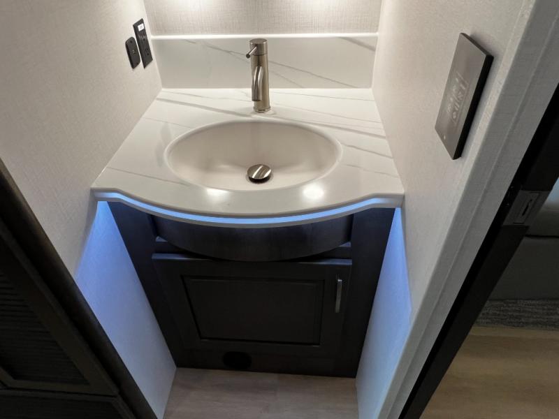 Take the party outside with the exterior entertainment center, featuring a 32" TV under a power armless awning with LED lighting. Whether it's game day or movie night, you're always in the action.