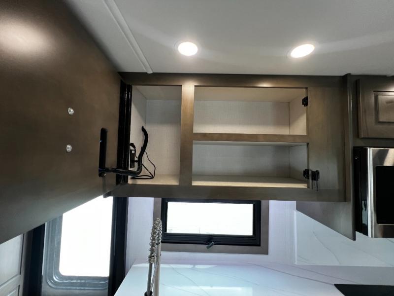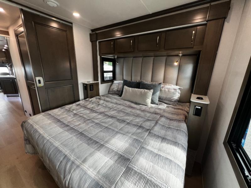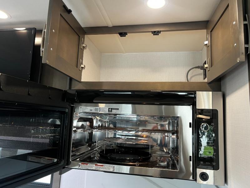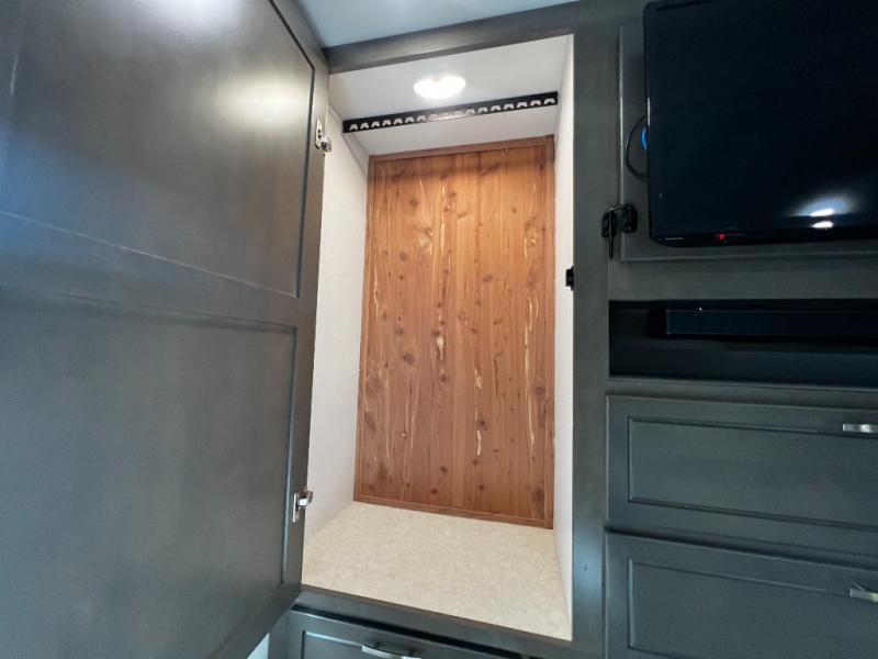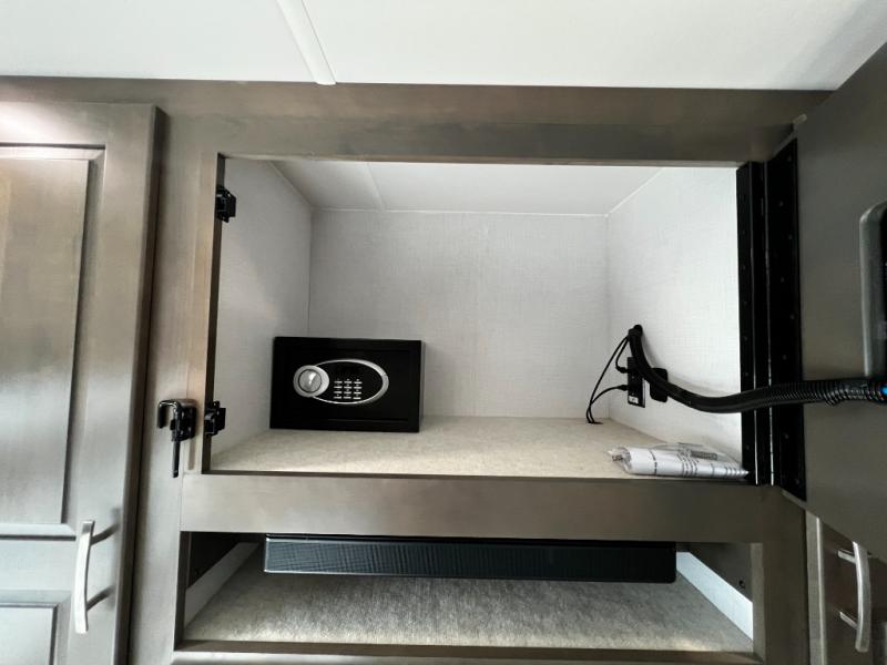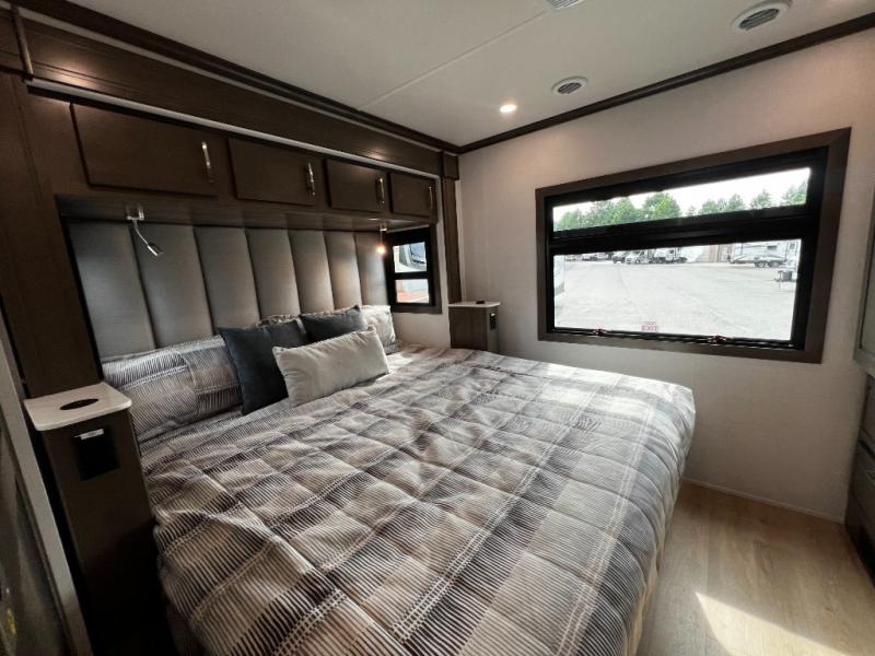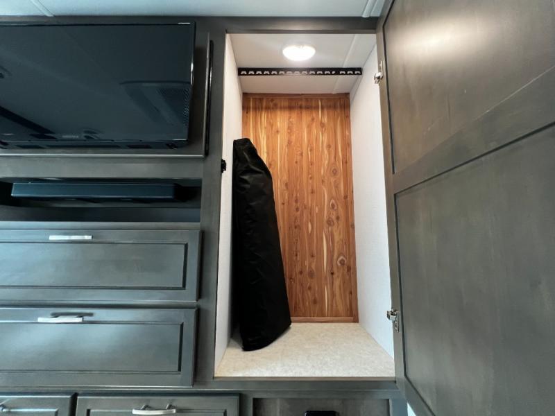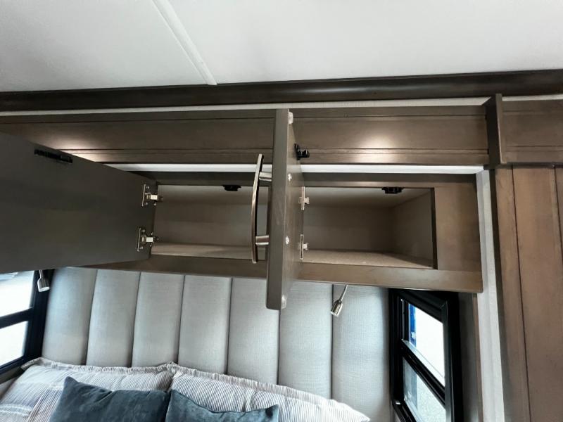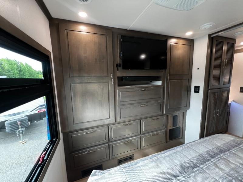 The rear private bedroom offers a true escape after a day on the road. Stretch out on the king-size bed, unwind with your favorite show on the 32" LED TV, and enjoy plenty of storage in dual wardrobes and a dresser.