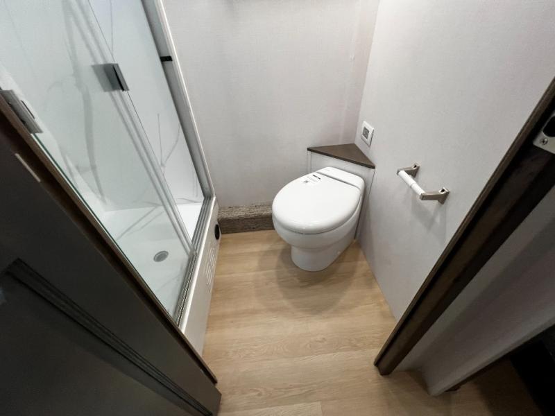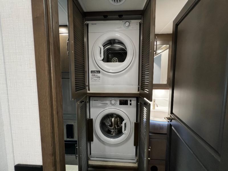 The split bathroom design means no waiting – one person can use the radius shower and toilet while another freshens up at the vanity outside. And no need to go to the laundromat, included washer and dryer