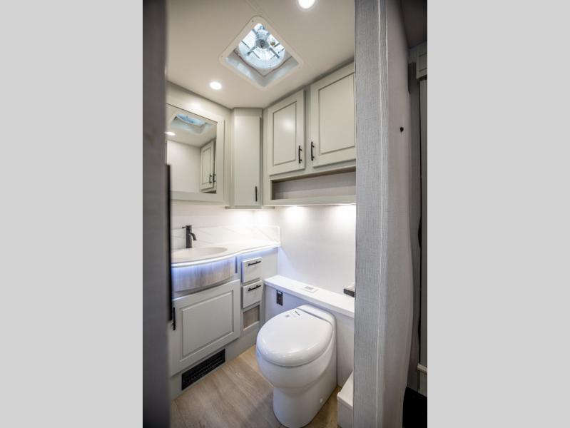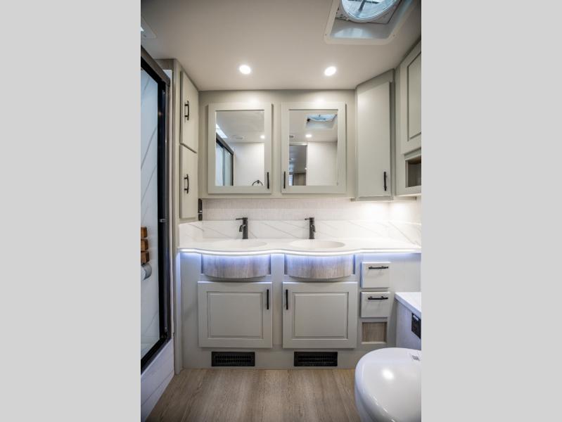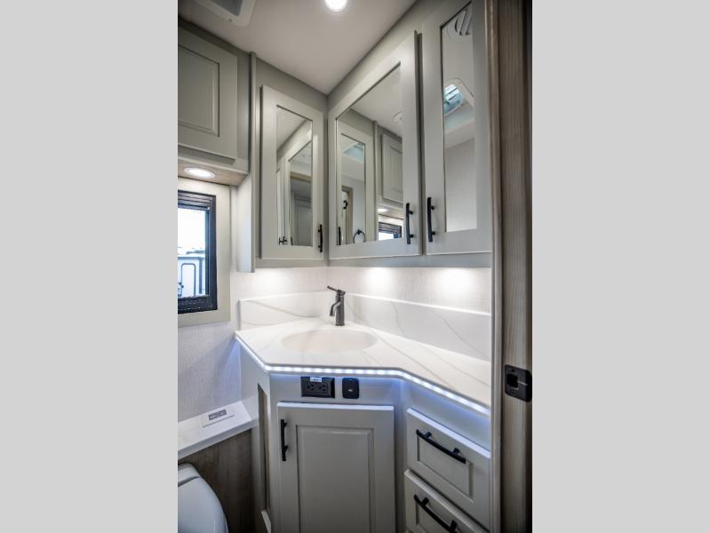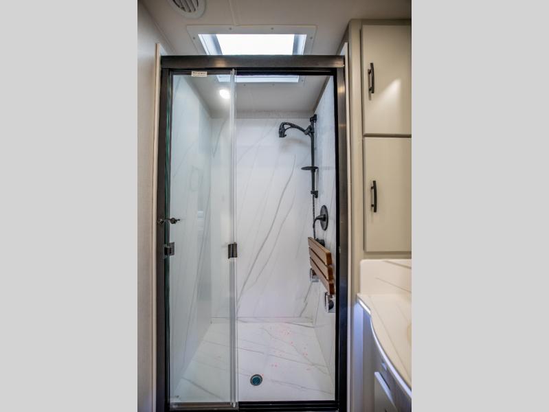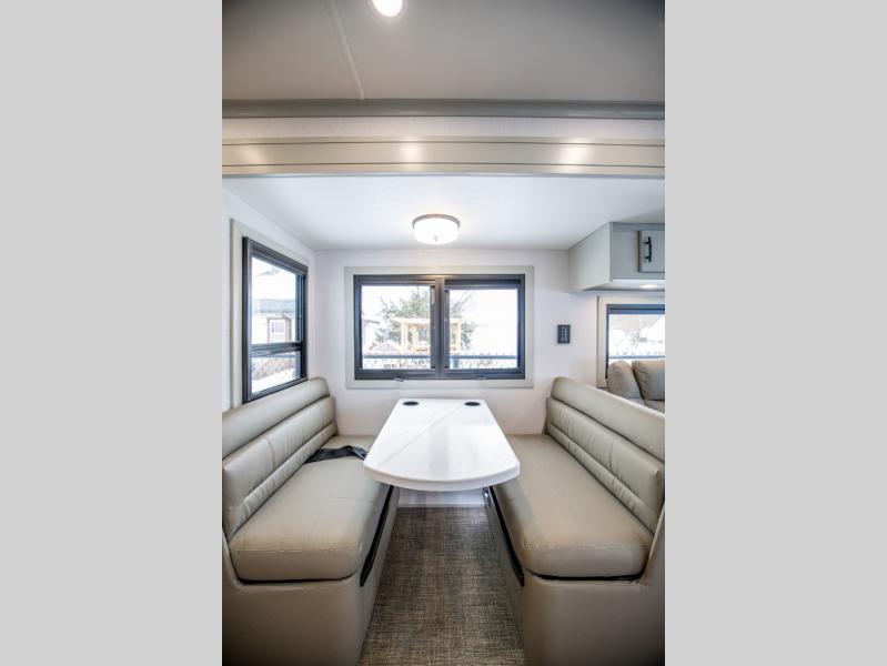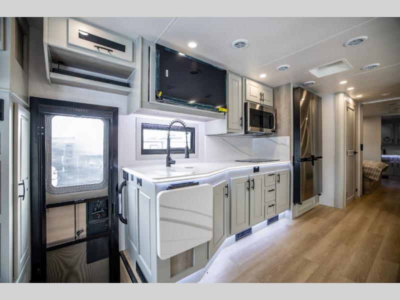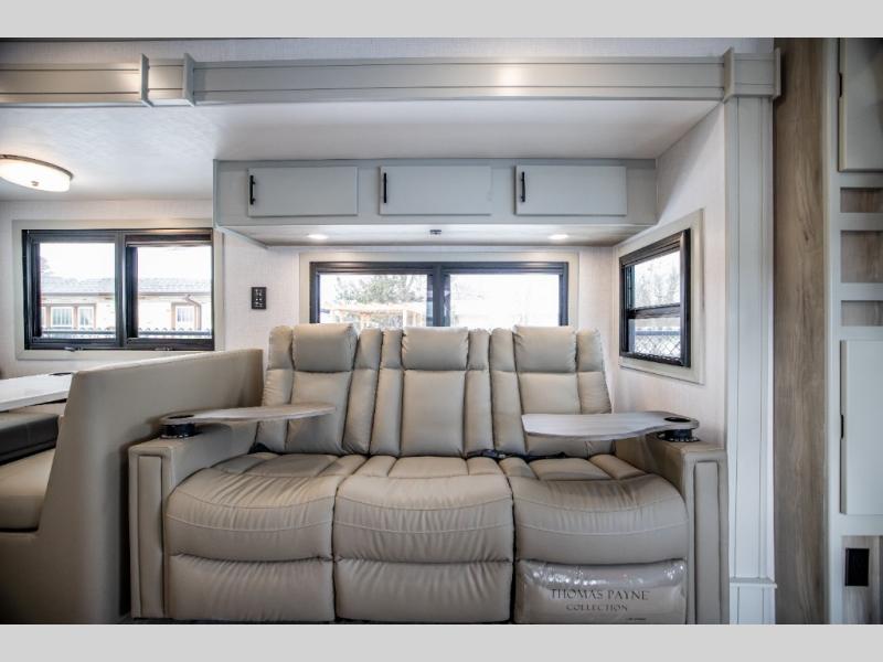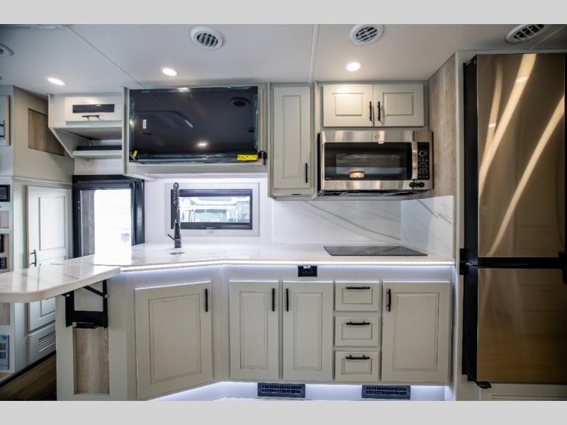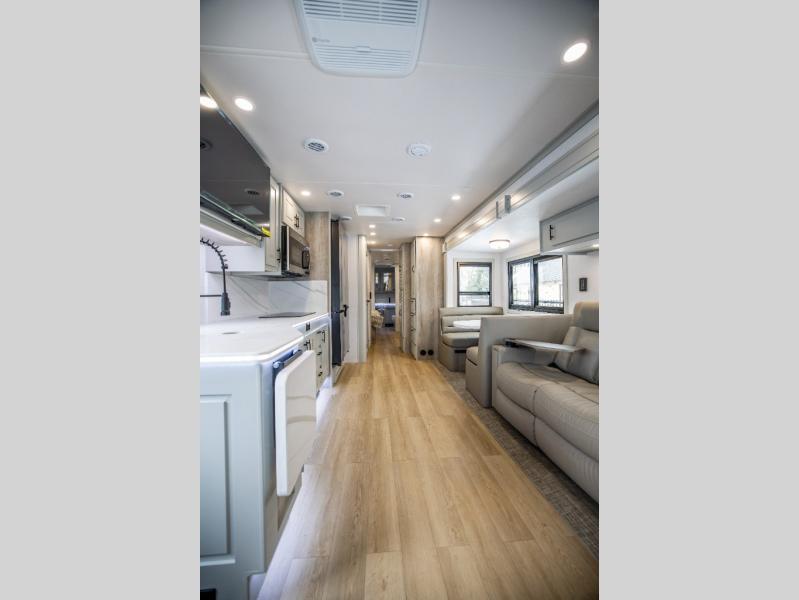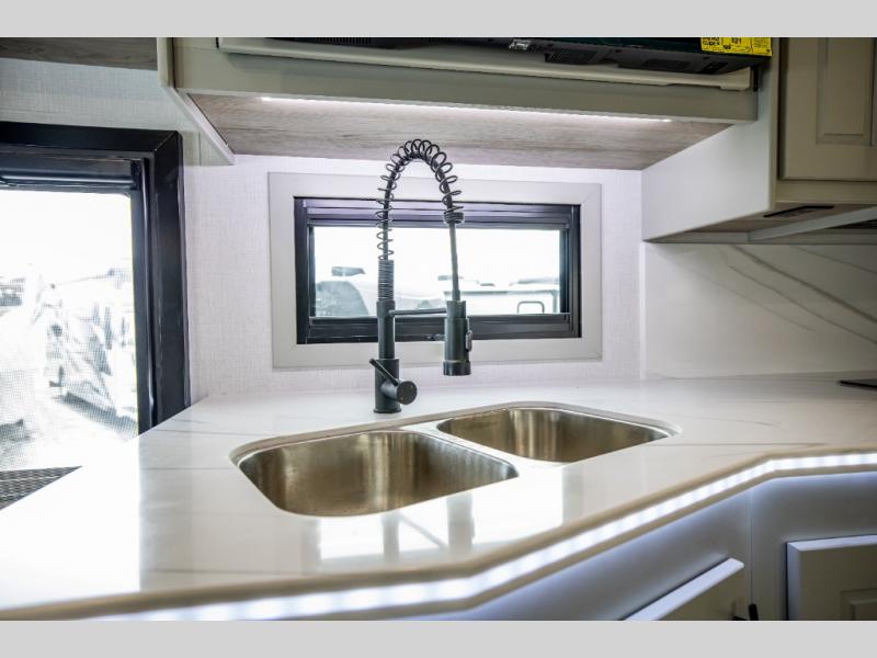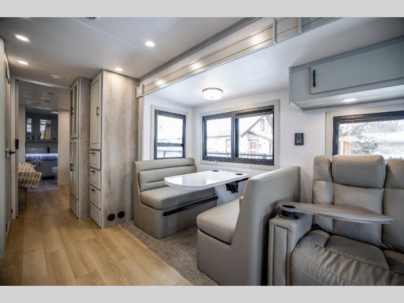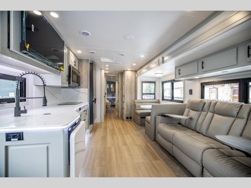 It's a clean decision with a bath and a half to take this motorhome on your next trip! The full rear bathroom has a radius shower to freshen up in, a closet to keep your towels close, and a dual sink vanity for two to get ready at once. It also creates a master suite with a king bed slide across from a dresser with a 32" TV and wardrobes on either side of it. Across from the half bathroom is a closet that is prepped to add an optional washer and dryer for clean clothes throughout your entire trip. You will have everything you need to prepare your best meals including a countertop extension. Enjoy your meals, play card games, and even transform into a sleeping space all with the Dream Dinette. The tri-fold sofa sleeper not only has seatbelts for traveling, but also can transform into a sleeping space too. You can also choose to add the optional bunk over cab for more sleeping space or switch out the sofa for the optional theaters seats!