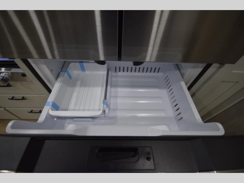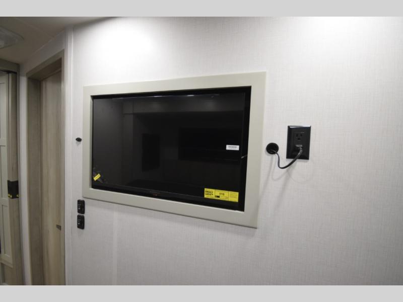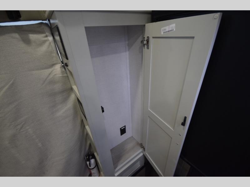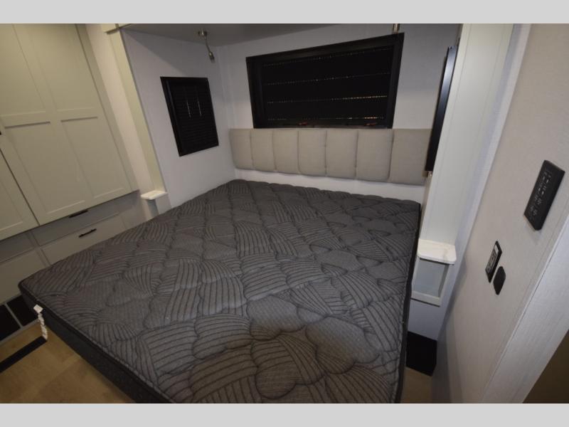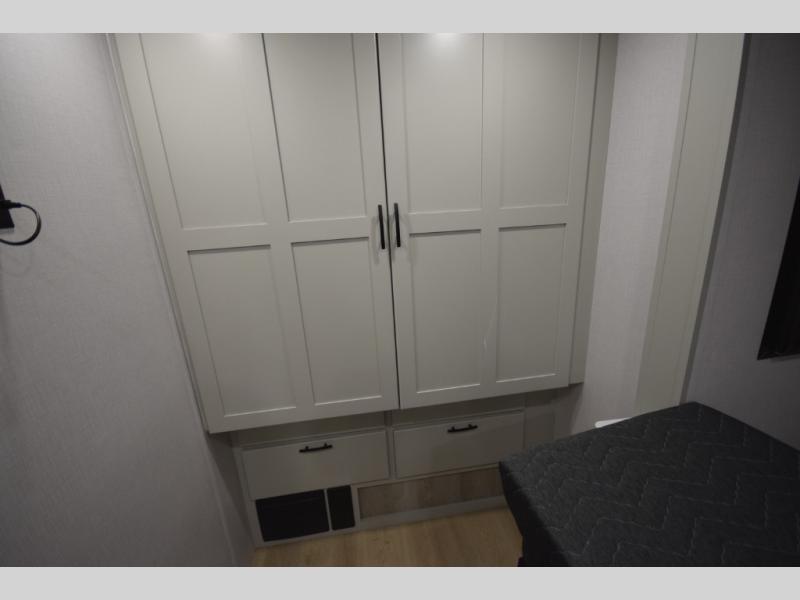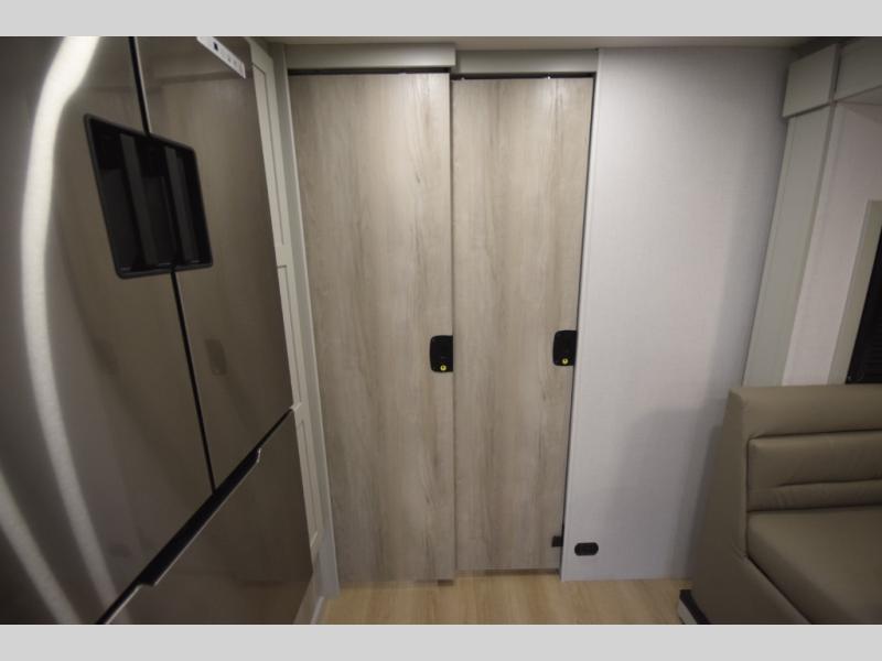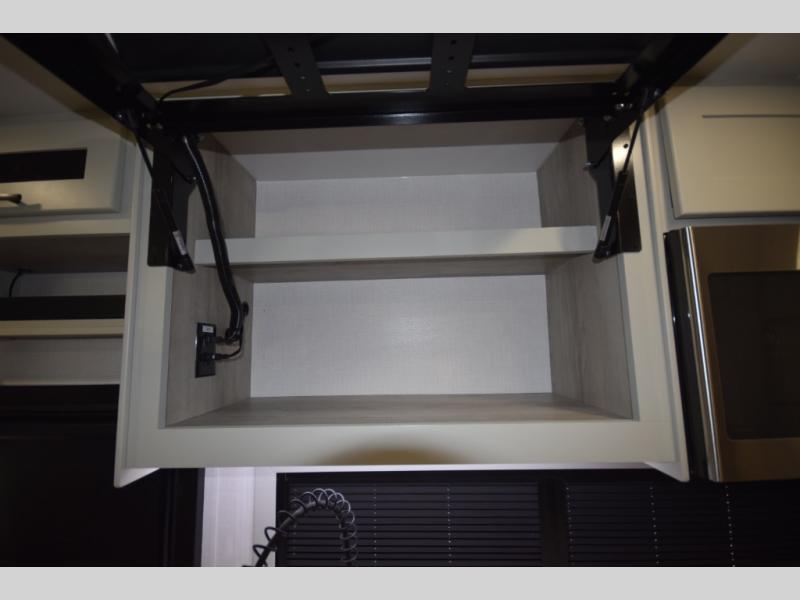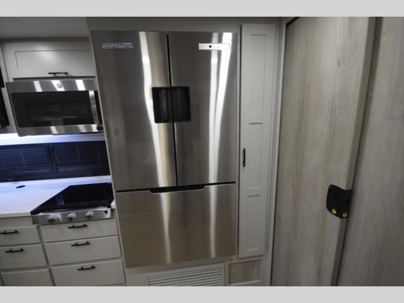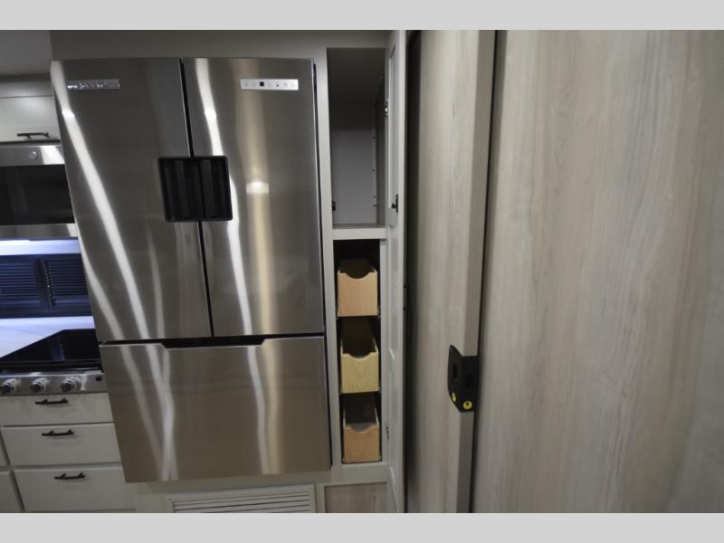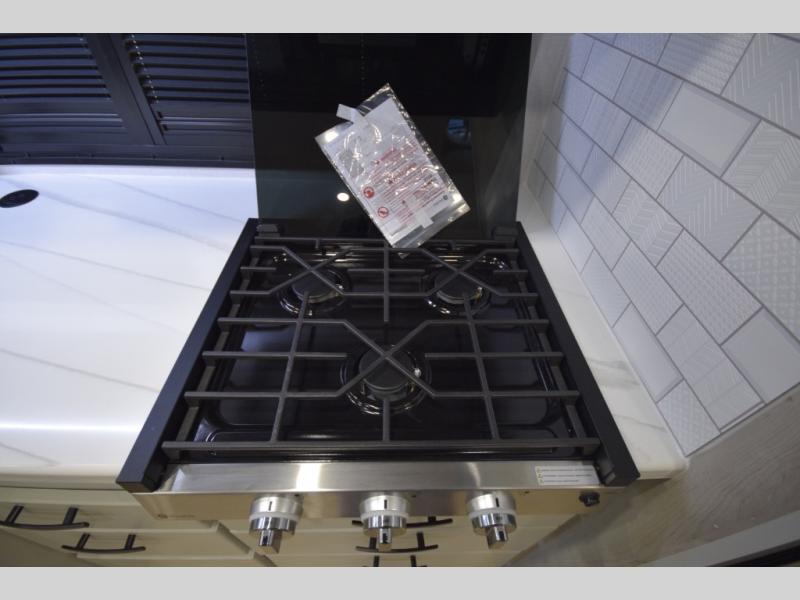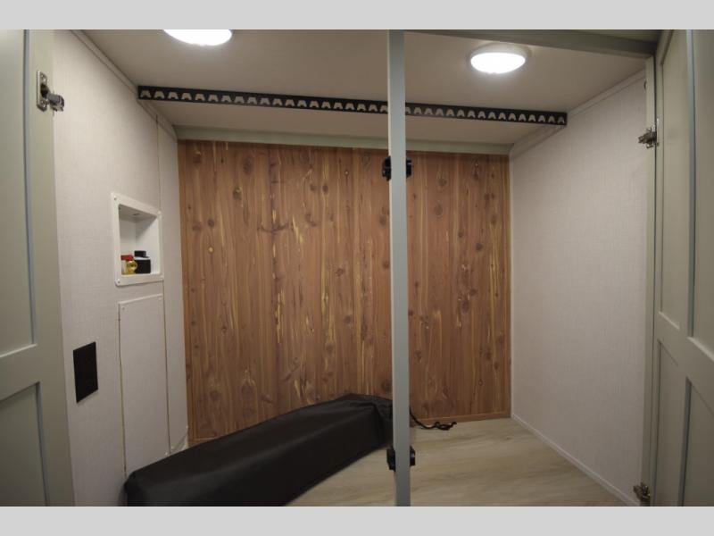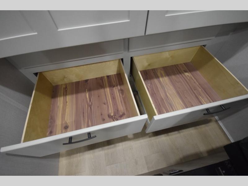 The fully equipped kitchen makes cooking on the road a pleasure. Enjoy the sealed gas range, convection microwave, and a roomy 16 cu. ft. residential refrigerator with an ice maker—perfect for storing ingredients for memorable meals. When it’s time to rest, retreat to the private rear master suite featuring a king bed slide out, a 32" LED Smart TV, and a cedar-lined wardrobe designed for extended adventures. LED reading lights, USB ports, and the optional cab-over bunk add comfort and flexibility for additional travelers.