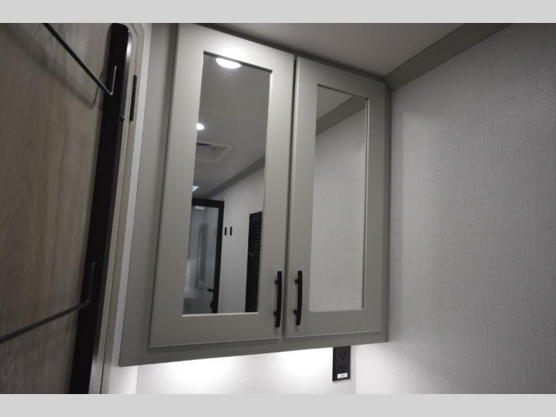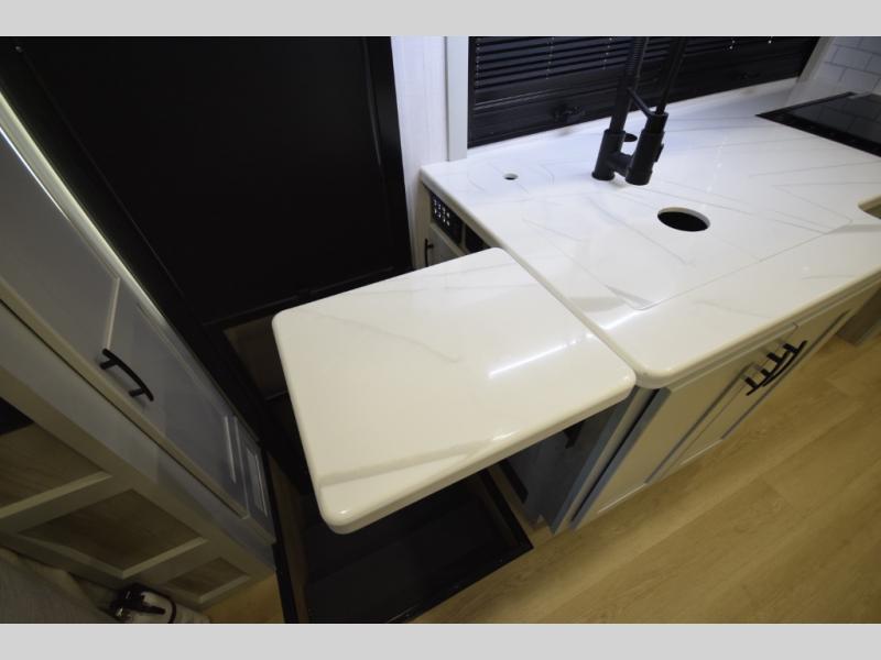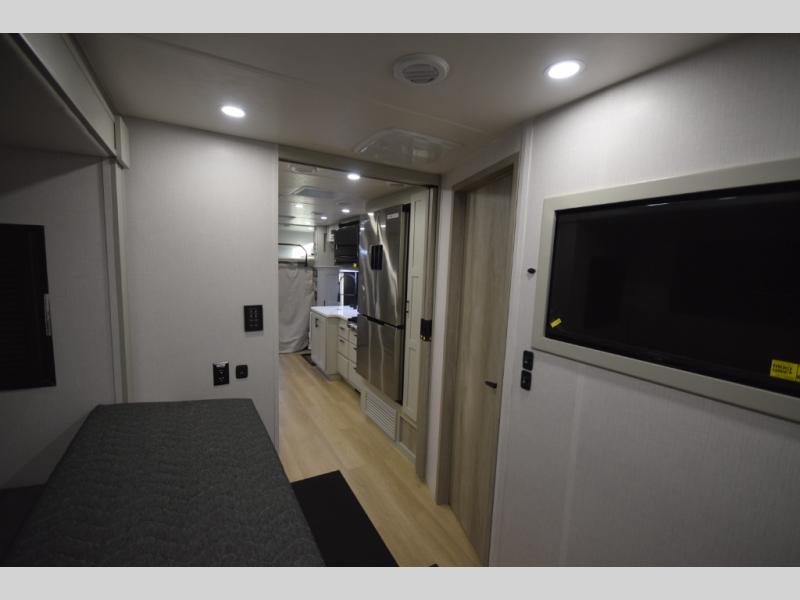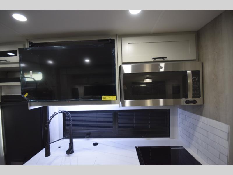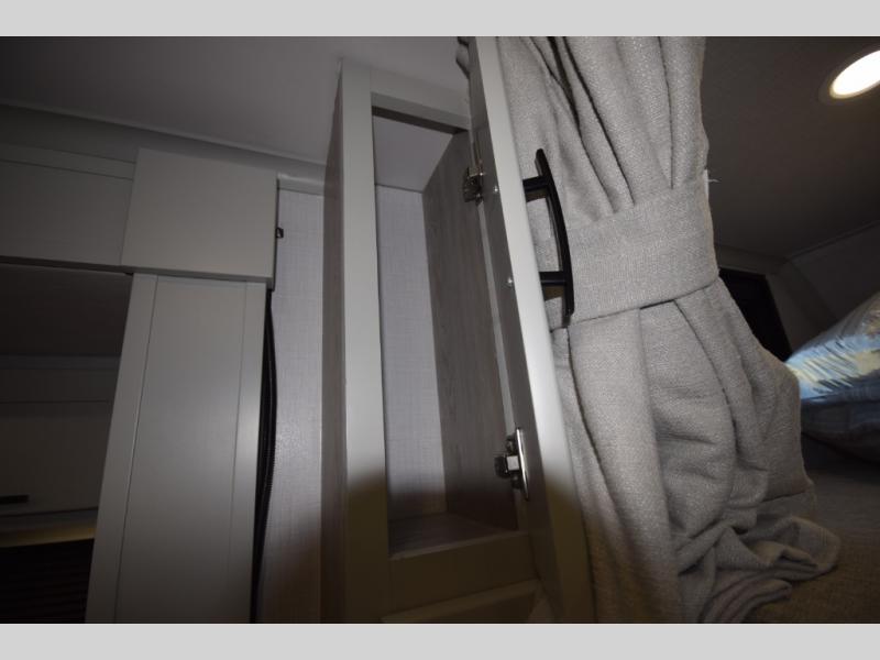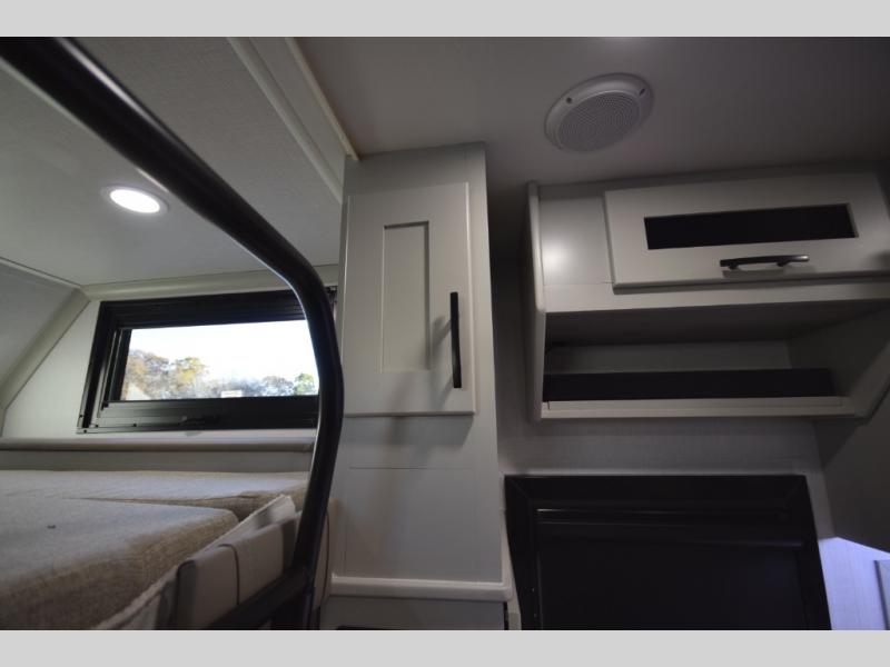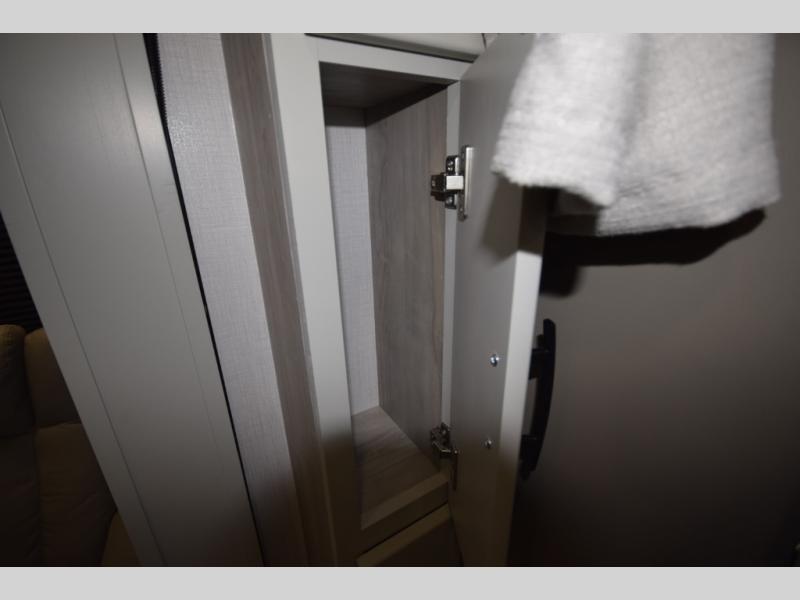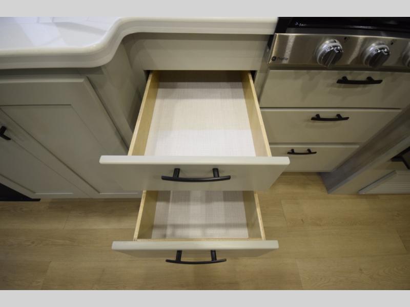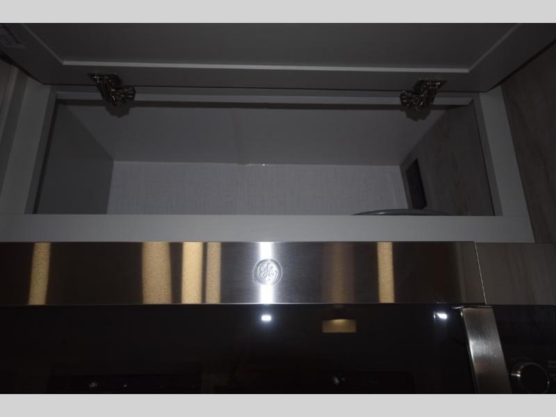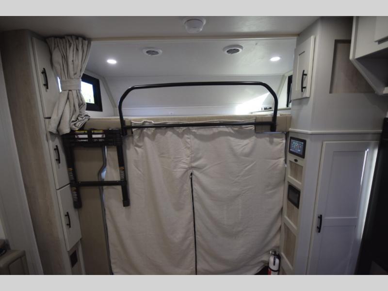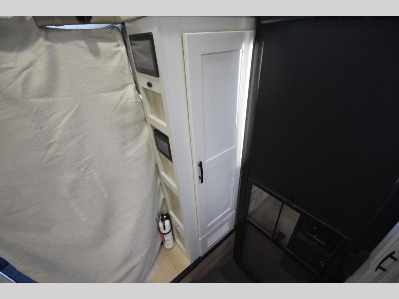 The fully equipped kitchen makes cooking on the road a pleasure. Enjoy the sealed gas range, convection microwave, and a roomy 16 cu. ft. residential refrigerator with an ice maker—perfect for storing ingredients for memorable meals. When it’s time to rest, retreat to the private rear master suite featuring a king bed slide out, a 32" LED Smart TV, and a cedar-lined wardrobe designed for extended adventures. LED reading lights, USB ports, and the optional cab-over bunk add comfort and flexibility for additional travelers.