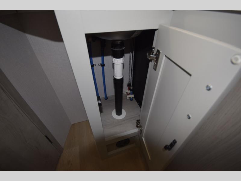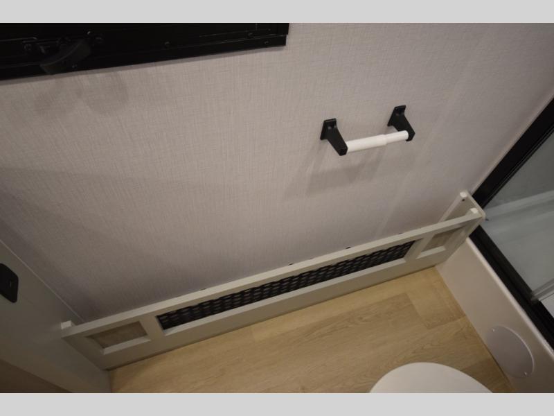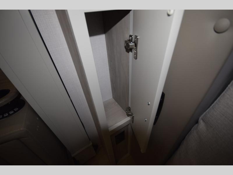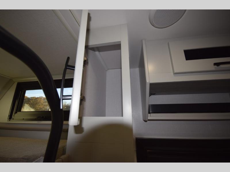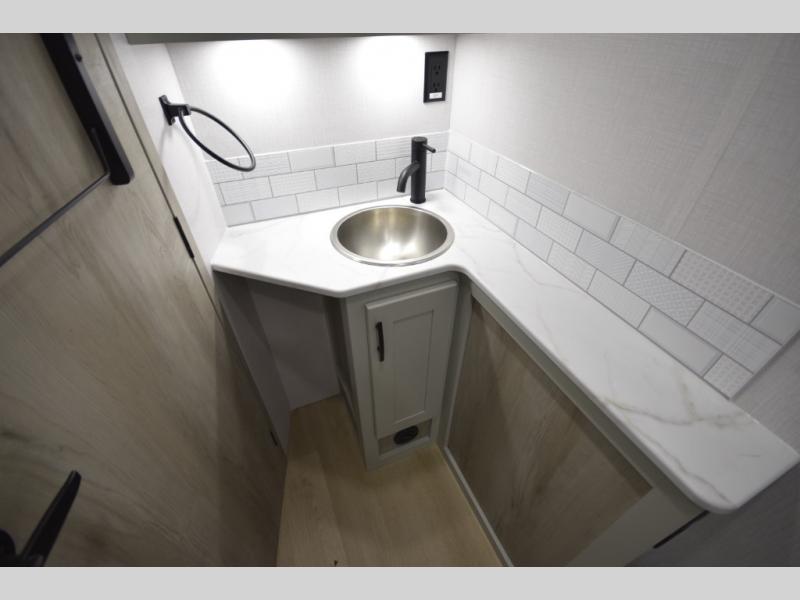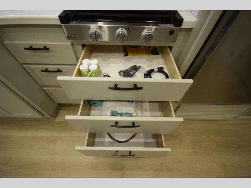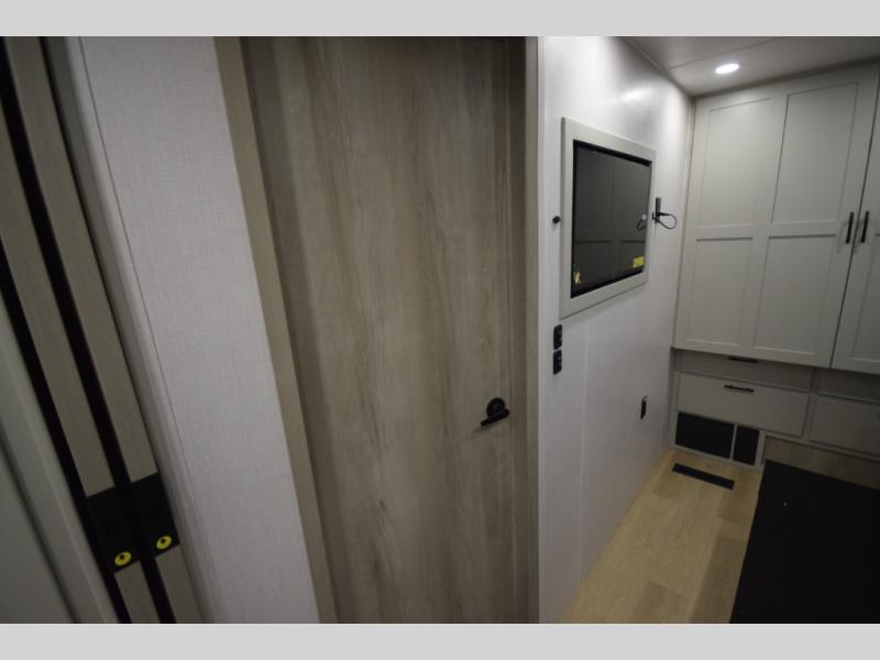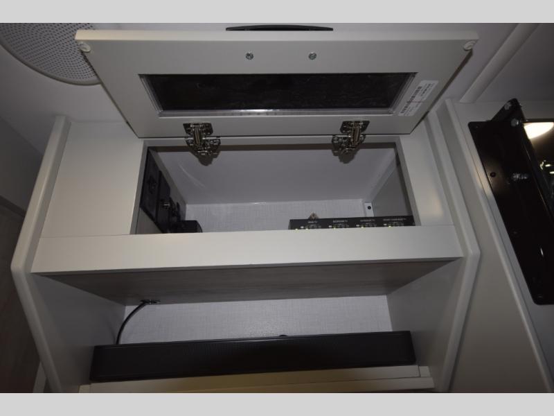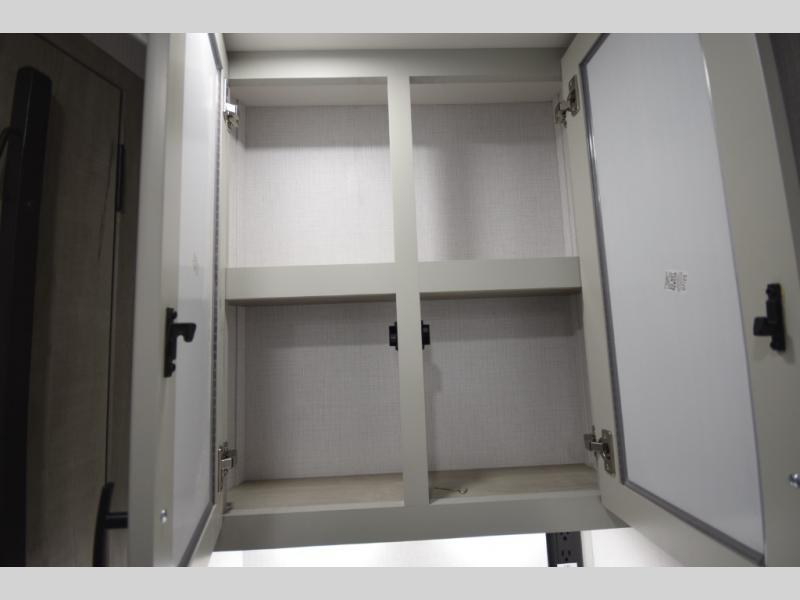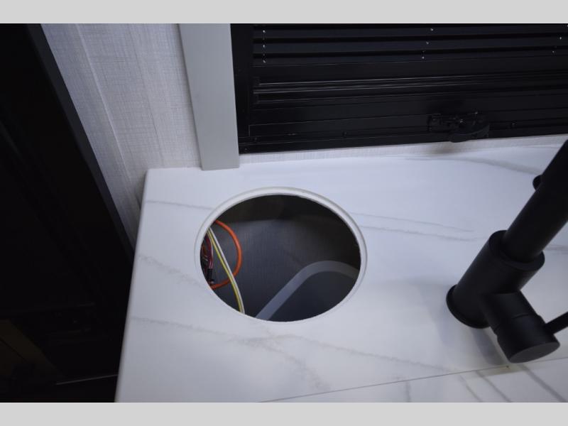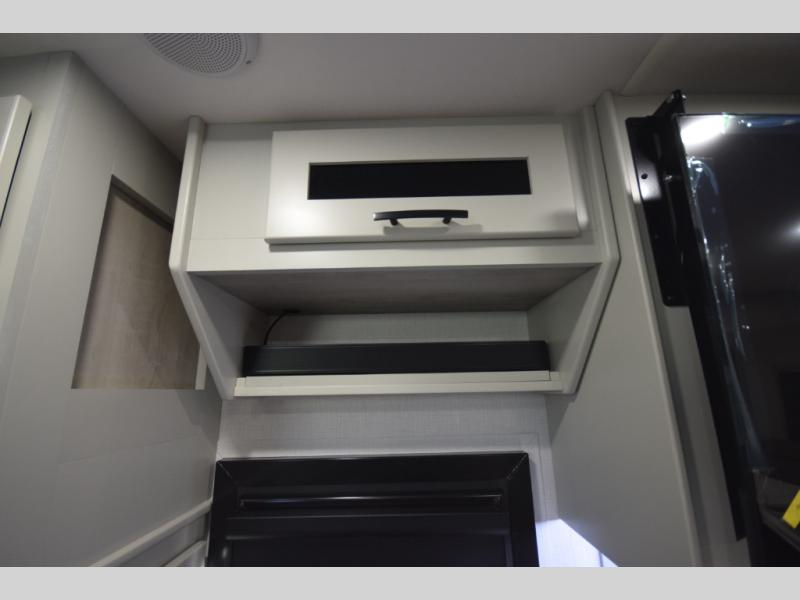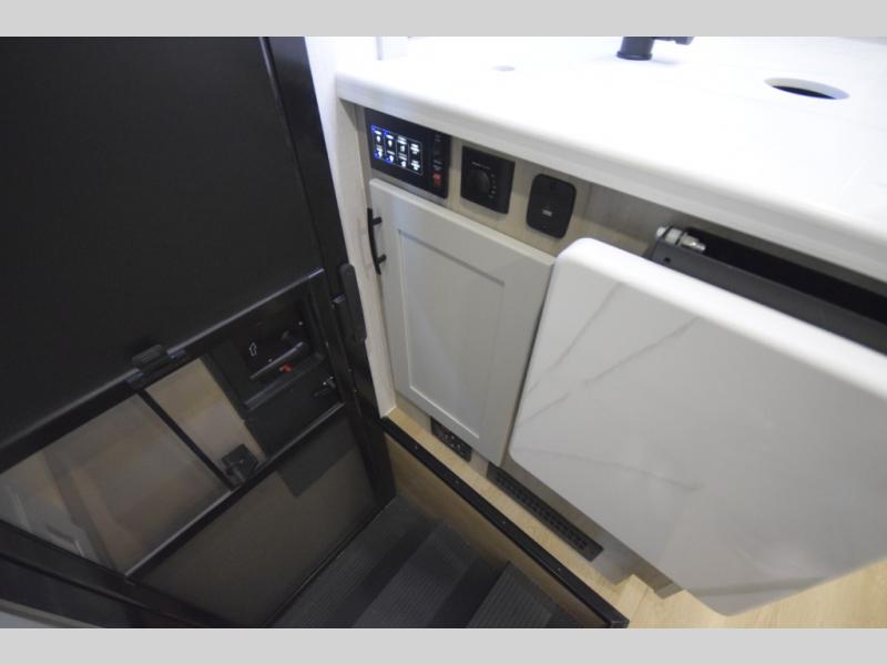 The fully equipped kitchen makes cooking on the road a pleasure. Enjoy the sealed gas range, convection microwave, and a roomy 16 cu. ft. residential refrigerator with an ice maker—perfect for storing ingredients for memorable meals. When it’s time to rest, retreat to the private rear master suite featuring a king bed slide out, a 32" LED Smart TV, and a cedar-lined wardrobe designed for extended adventures. LED reading lights, USB ports, and the optional cab-over bunk add comfort and flexibility for additional travelers.