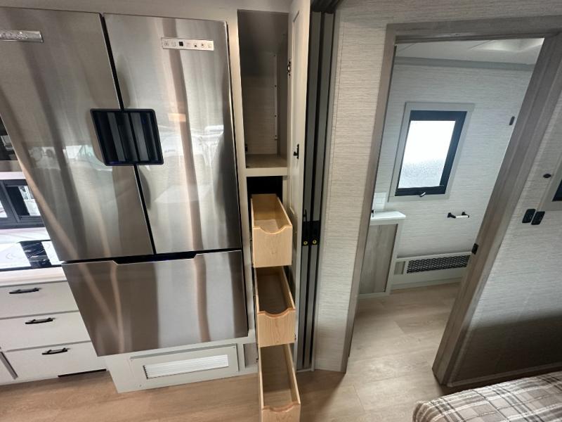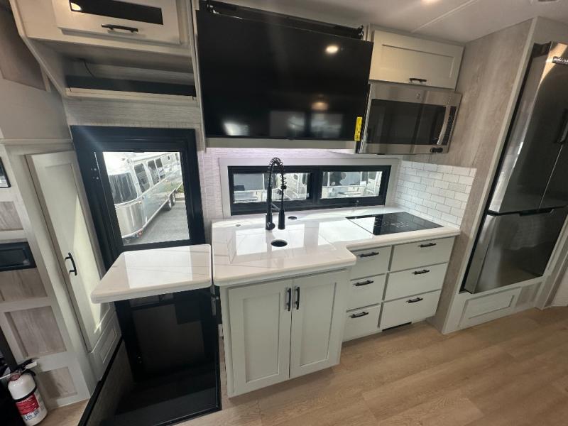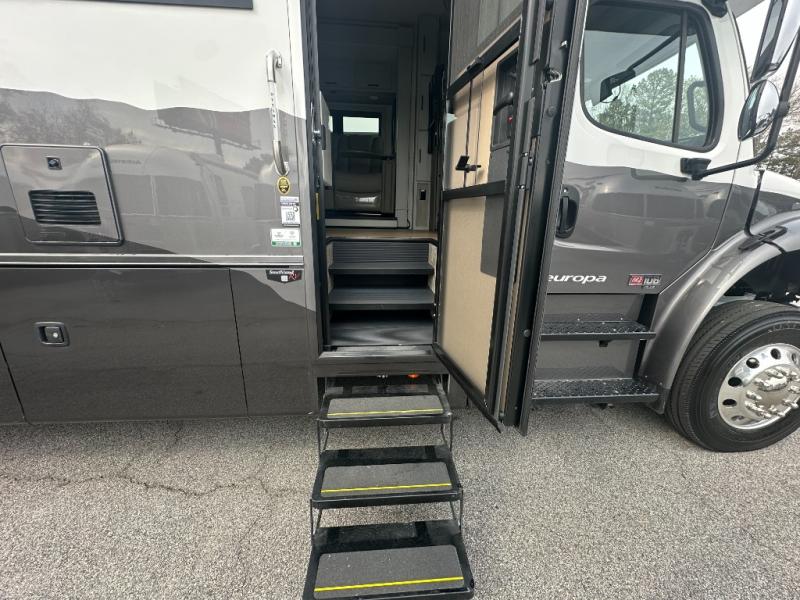 Trips across the state or country are made luxurious in this double slide out coach. The captain's seats can become a part of the living area once you are parked, and your guests can relax on the sofa sleeper or play a game at the booth dinette. There is also a 39" LED Smart TV across from the sofa for easy viewing. You will enjoy cooking in the kitchen on the sealed gas range or in the convection microwave, plus there is a 16 cu. ft. residential refrigerator with an ice maker for perishables. This Europa also features a rear master suite with a king bed slide out, a 32" LED Smart TV, and a large cedar-lined wardrobe. There are even LED reading lights and USB ports for added convenience. And you may want to add the cab-over bunk option to sleep more guests!