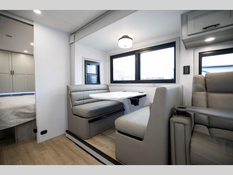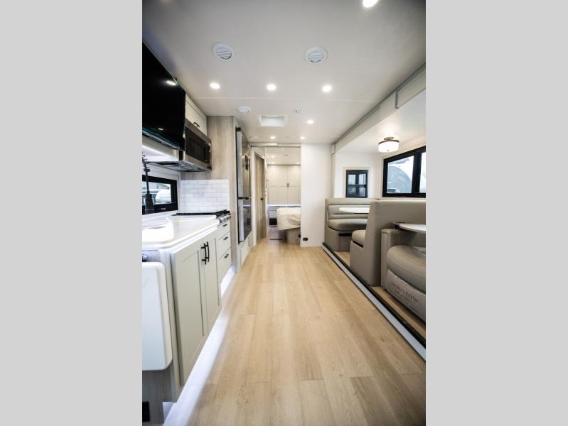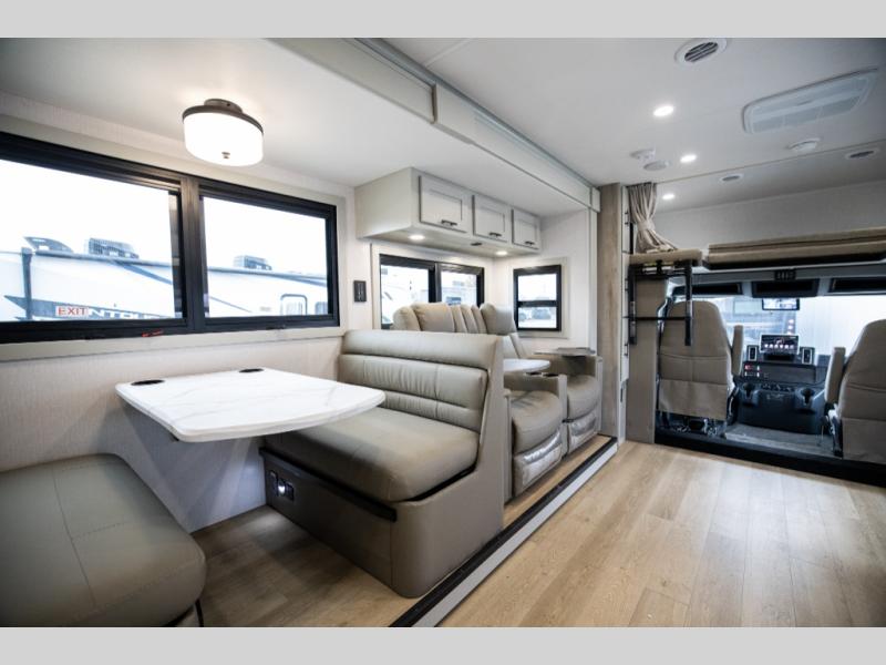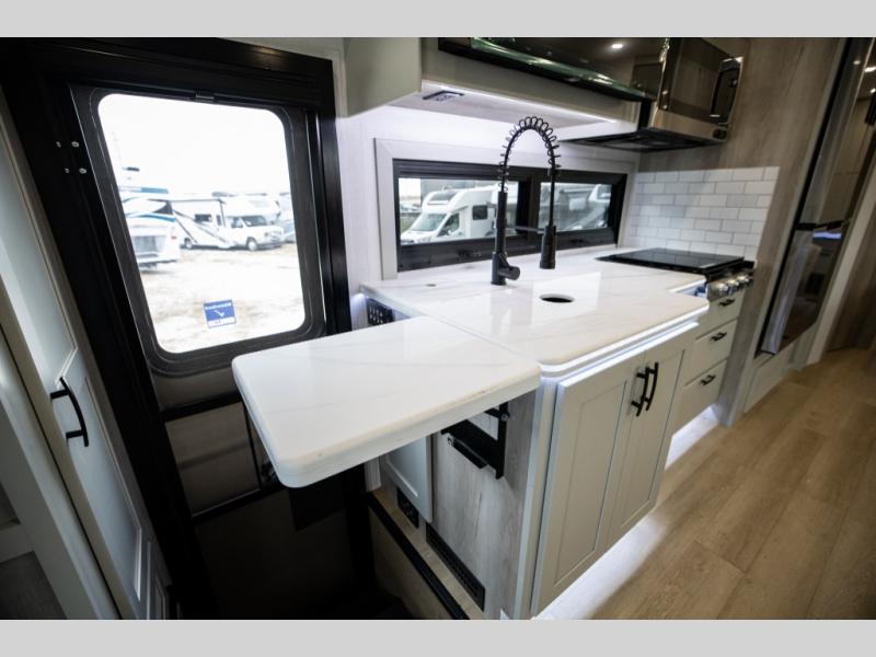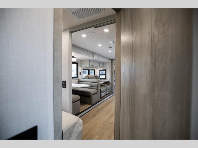 The Europa Super C diesel motorhome by Dynamax is coming to you with all the power, durability, and luxury you need for your adventurous lifestyle. You will love the solid surface countertop with LED edge lighting in the kitchen, the premium vinyl flooring throughout, and the clean, contemporary styling. The on-demand water heater is a luxury you won't want to travel without, and the multiplex wiring with a touch screen command center includes switch panels, and Bluetooth Smart Phone app control for ease of use. There are dual 12V 8D AGM deep-cycle maintenance-free house batteries and a single 200-watt solar panel to go off-grid if you choose, and the 12,000 lb. trailer hitch will allow you to bring along the off-road toys. Some of the exterior features that make this coach great are the armless patio awning with LED lighting, the automatic four-point hydraulic leveling jacks, and the eye-catching custom full-body paint package!