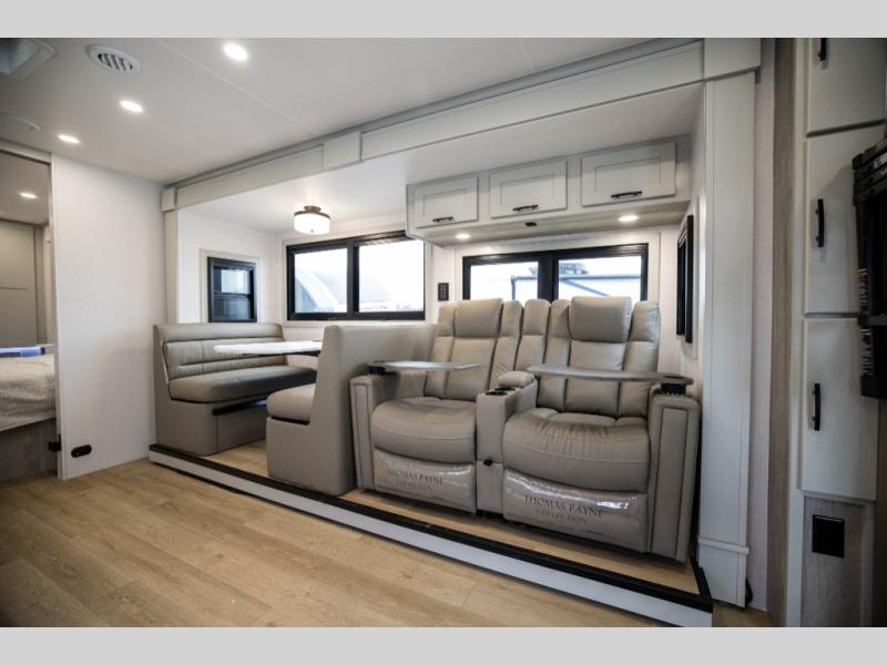 Trips across the state or country are made luxurious in this double slide out coach. The captain's seats can become a part of the living area once you are parked, and your guests can relax on the sofa sleeper or play a game at the booth dinette. There is also a 39" LED Smart TV across from the sofa for easy viewing. You will enjoy cooking in the kitchen on the sealed gas range or in the convection microwave, plus there is a 16 cu. ft. residential refrigerator with an ice maker for perishables. This Europa also features a rear master suite with a king bed slide out, a 32" LED Smart TV, and a large cedar-lined wardrobe. There are even LED reading lights and USB ports for added convenience. And you may want to add the cab-over bunk option to sleep more guests!