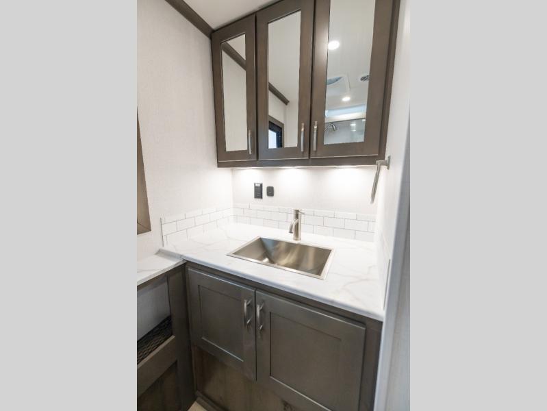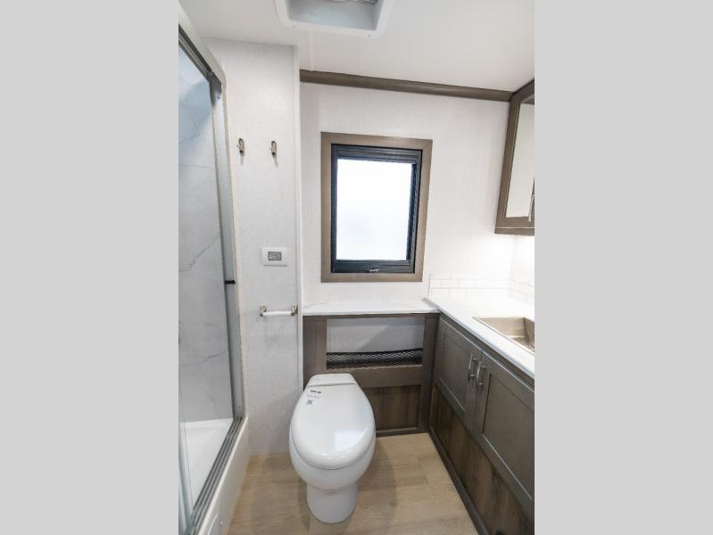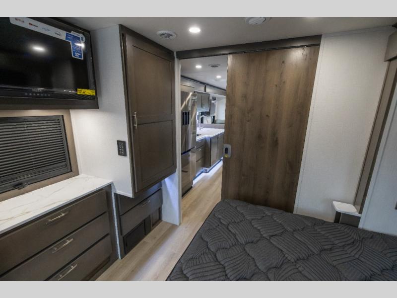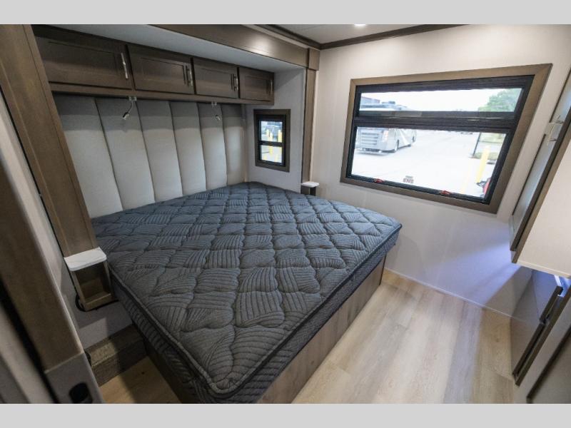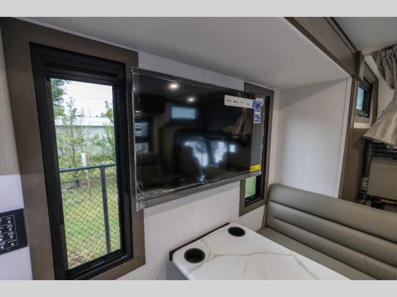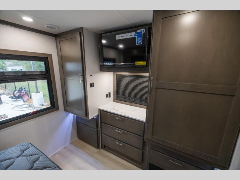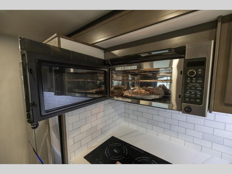 Whether you plan to go near or far, you'll stay comfortable in this spacious coach! There is a king bed slide out in the rear bedroom, plus dual wardrobes, dual nightstands, and your own 32" TV. Each morning, you can freshen up in the full bath that includes a glass shower door, then head to the kitchen for breakfast. There is a convection microwave, a gas range, plus a 16 cu. ft. residential refrigerator with an ice maker for convenience. The 64" sofa sleeper and Dream Dinette provide a place to dine, relax, and sleep additional guest, and you might want to add the cab-over bunk option for the little ones. Spend your evenings outdoors under the armless patio awning with LED lighting and watch a movie on the exterior 32" TV!