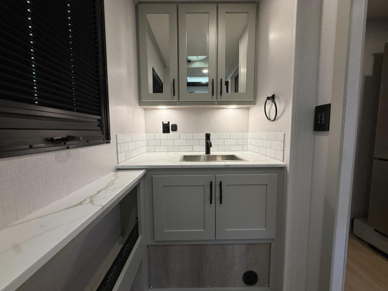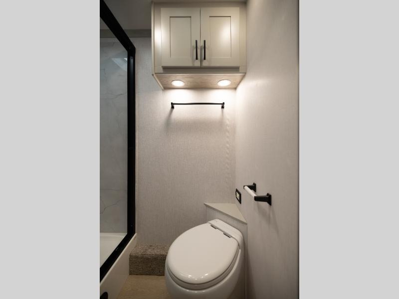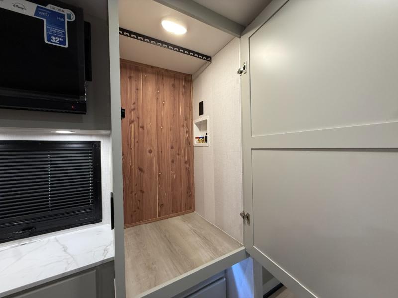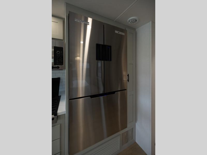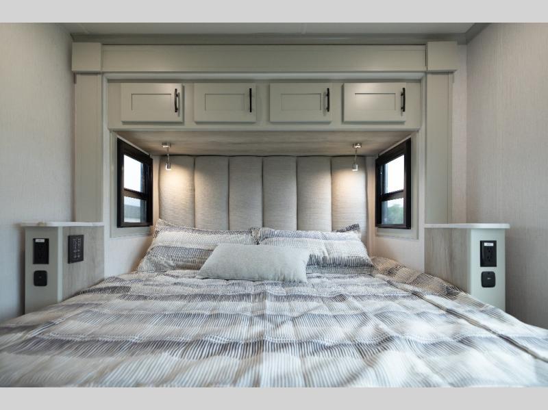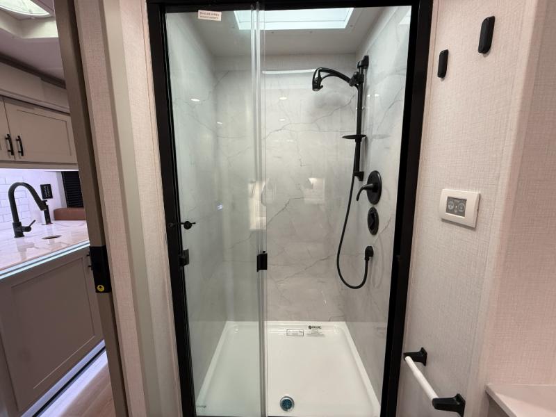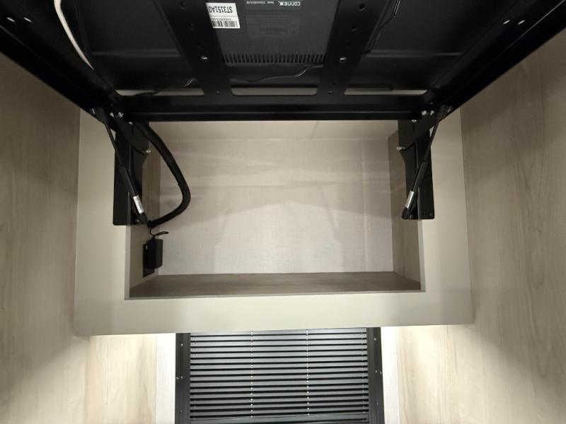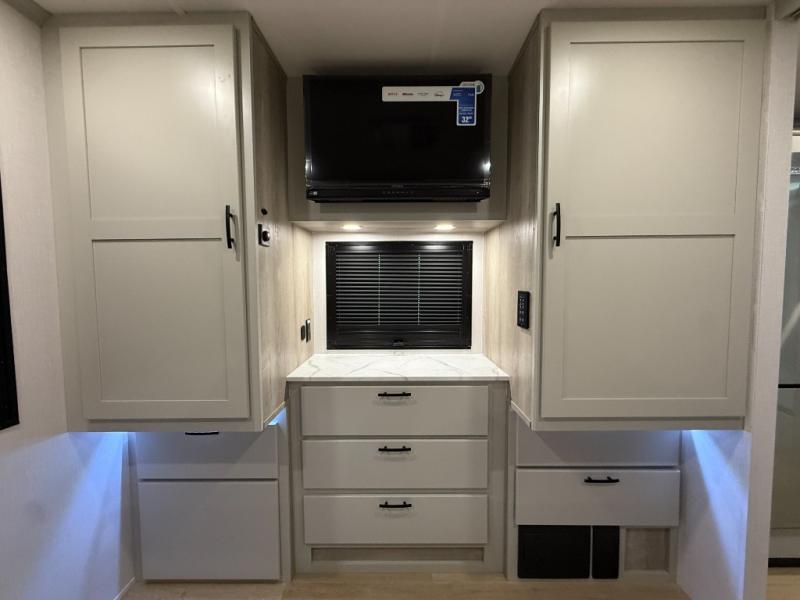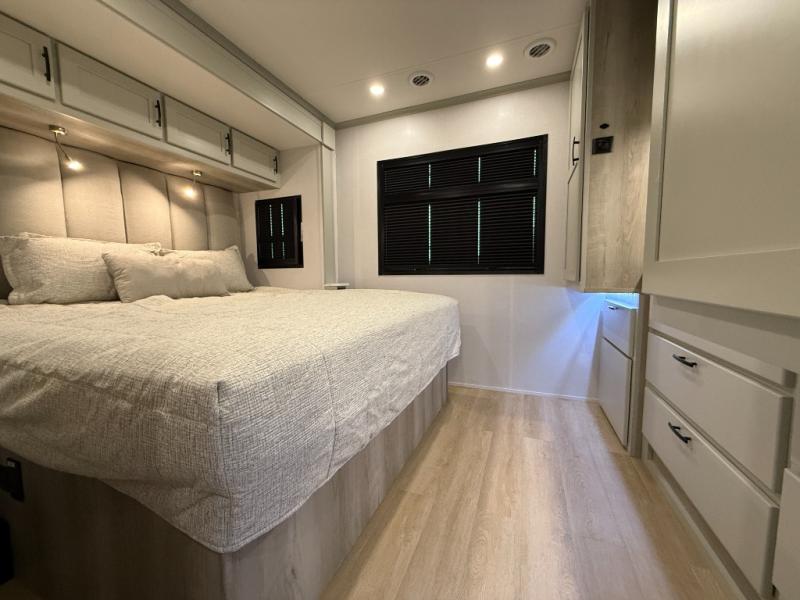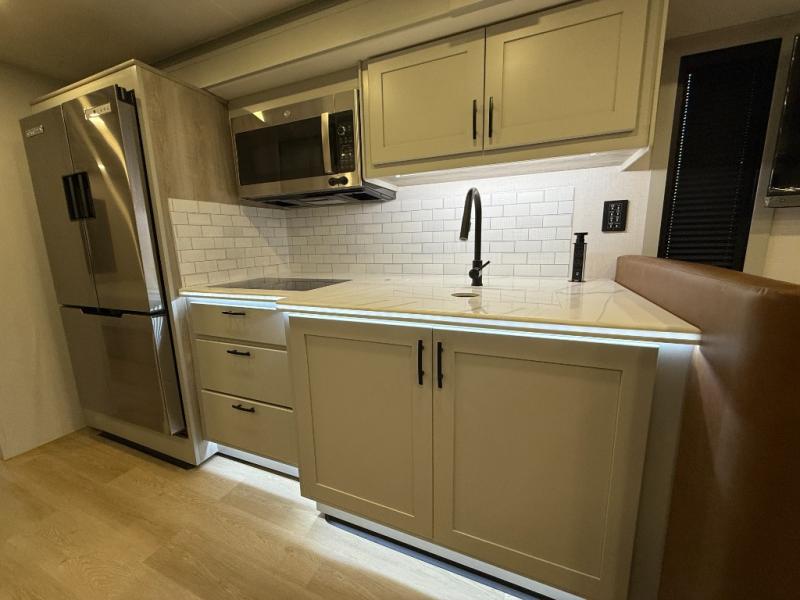 Whether you plan to go near or far, you'll stay comfortable in this spacious coach! There is a king bed slide out in the rear bedroom, plus dual wardrobes, dual nightstands, and your own 32" TV. Each morning, you can freshen up in the full bath that includes a glass shower door, then head to the kitchen for breakfast. There is a convection microwave, a gas range, plus a 16 cu. ft. residential refrigerator with an ice maker for convenience. The 64" sofa sleeper and Dream Dinette provide a place to dine, relax, and sleep additional guest, and you might want to add the cab-over bunk option for the little ones. Spend your evenings outdoors under the armless patio awning with LED lighting and watch a movie on the exterior 32" TV!