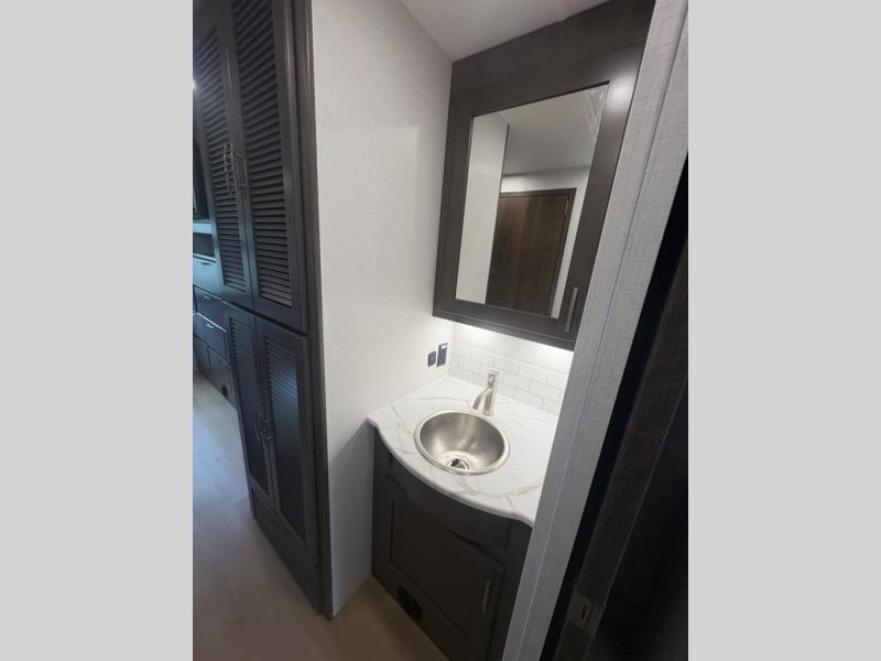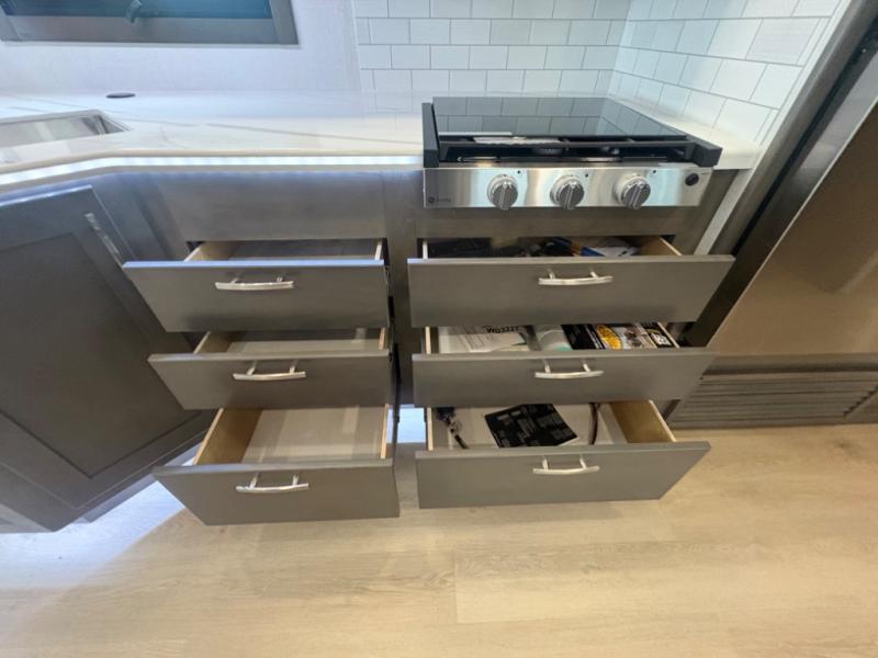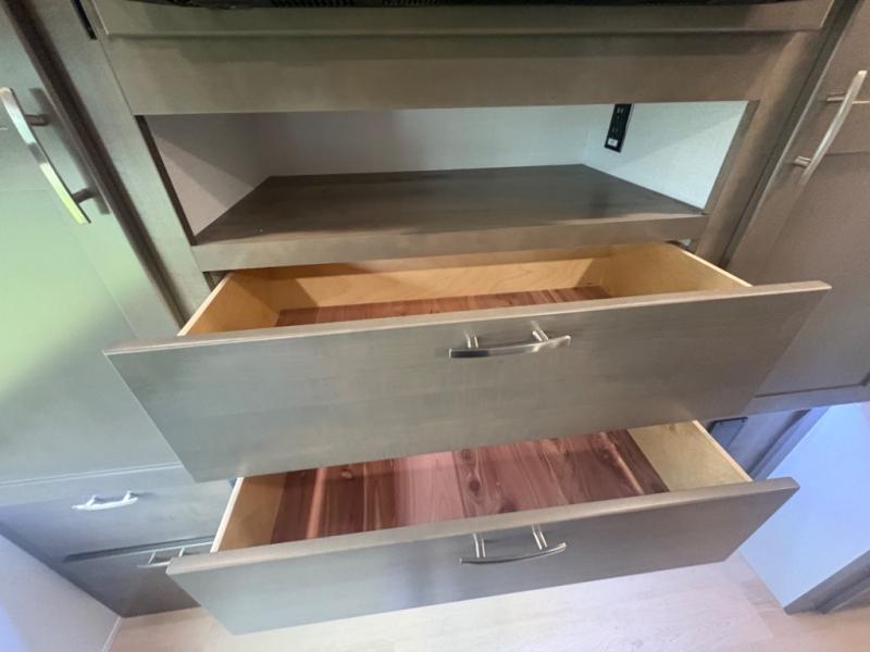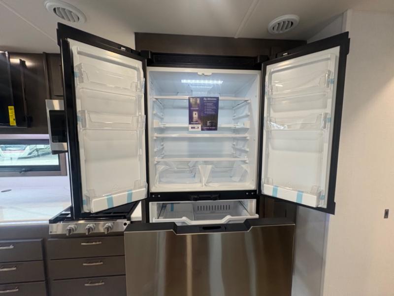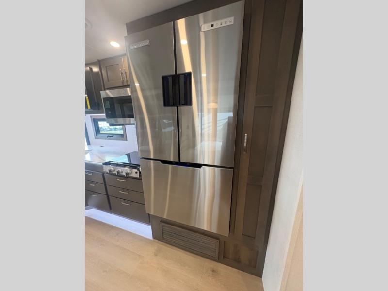 This double slide out coach is perfect for any vacation. Once you arrive at your destination, you can relax on the tri-fold sleeper sofa or play a game at the dream dinette. There is also a 39" LED Smart TV across from the sofa for easy viewing. You will enjoy cooking in the kitchen on the three-burner range or in the convection microwave, plus there is a 15 cu. ft. 12V 3-door compressor-driven refrigerator for perishables. This Europa also features a rear master suite with a king bed slide out, a 32" LED Smart TV, and dual bedroom wardrobes. The full bath includes washer/dryer prep and a hallway sink for additional convenience. If you need more space, consider the cab-over bunk option to sleep more guests!