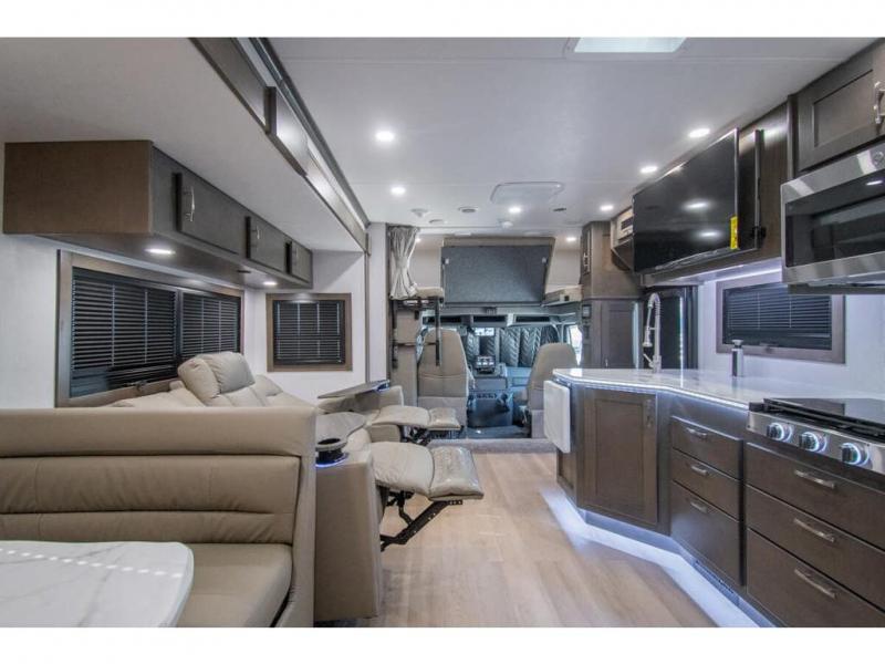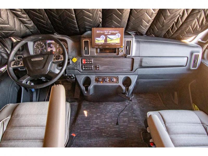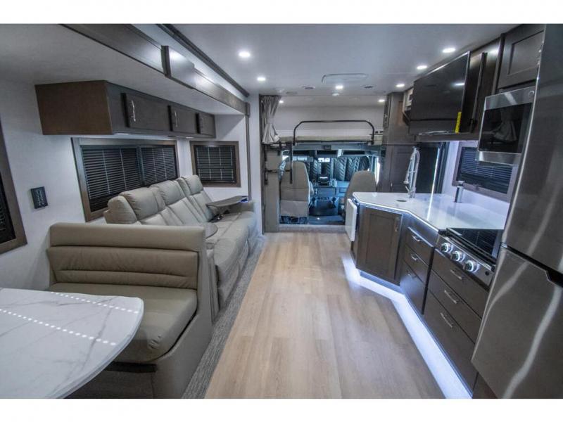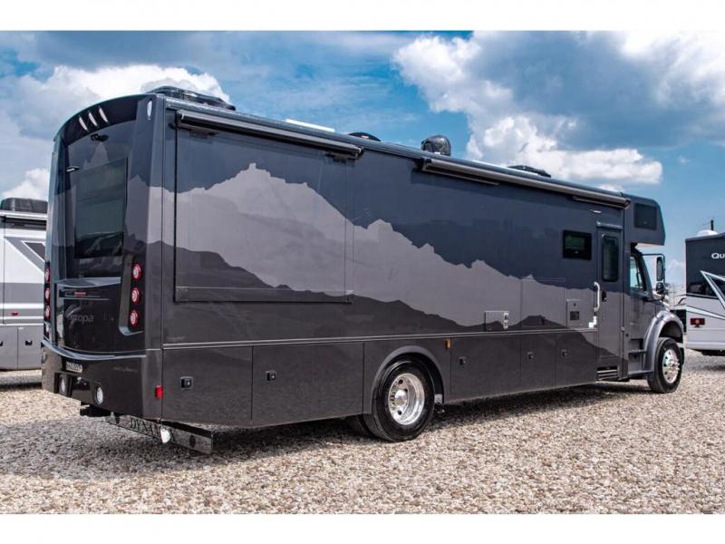 This RV is a magnificent example of luxury and power in the realm of Class C diesel motorhomes. Measuring approximately 36 feet 8 inches in length, this model is designed to elevate your travel experience with its exceptional features such as having 2 slides and a king sized bed and stunning design. Built on a robust Freightliner M2 chassis, the Europa houses a formidable Cummins 6.7L Turbo Diesel engine, delivering 360 horsepower and an impressive 800 ft.-lbs. of torque. The dual air conditioning units provide comfort in any climate, making this RV perfect for any adventure, wherever the road may take you. The Europa 34SS comes equipped with numerous high-end features designed for both functionality and comfort. Enjoy the elegance of a custom full body paint package, complemented by durable Diamond Shield paint protection.