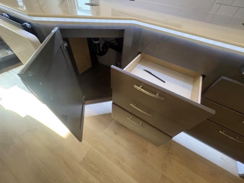 Inside, the Europa 34SS impresses with an open and inviting floorplan that blends sophisticated design with practical functionality. Plush seating, premium cabinetry, and designer finishes create a warm, residential feel that makes every moment on board feel like home. From the moment you step inside, you’ll notice a level of refinement that distinguishes this model from others in its class.