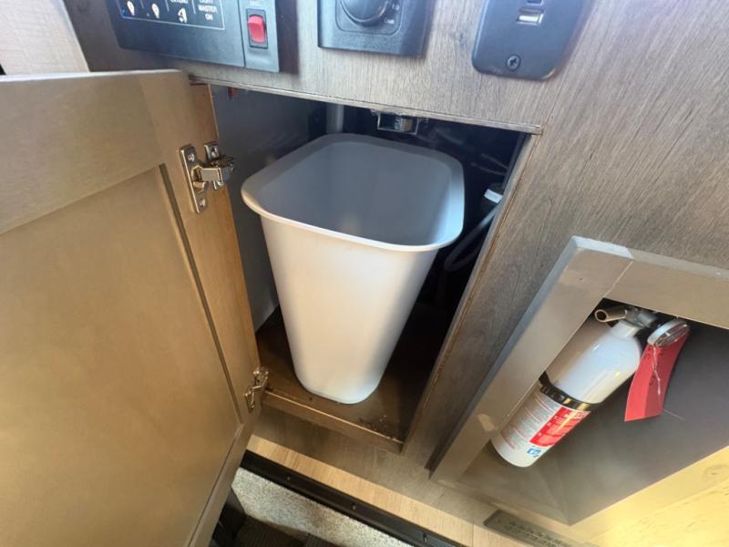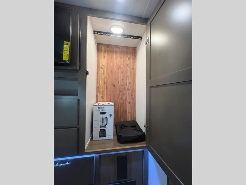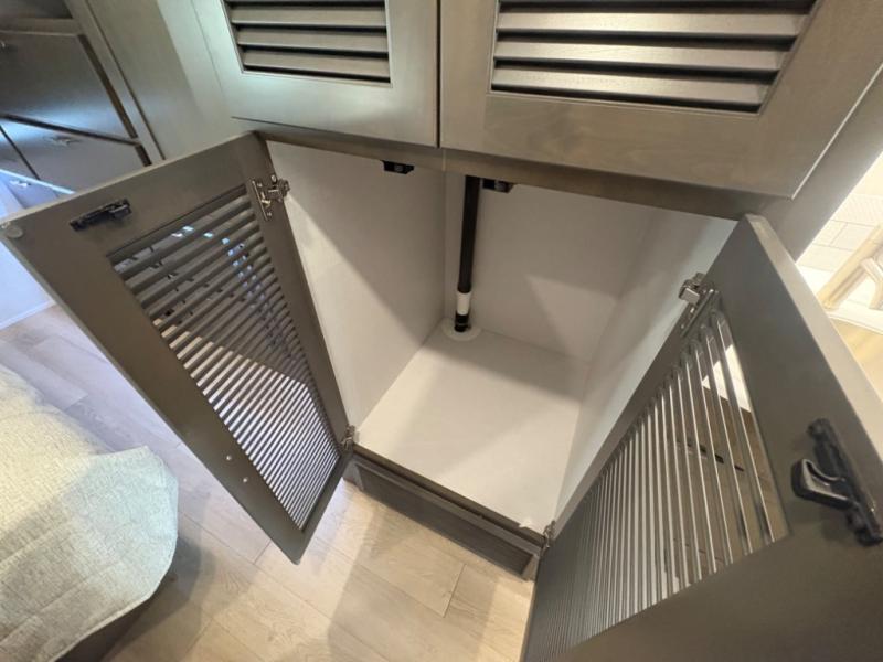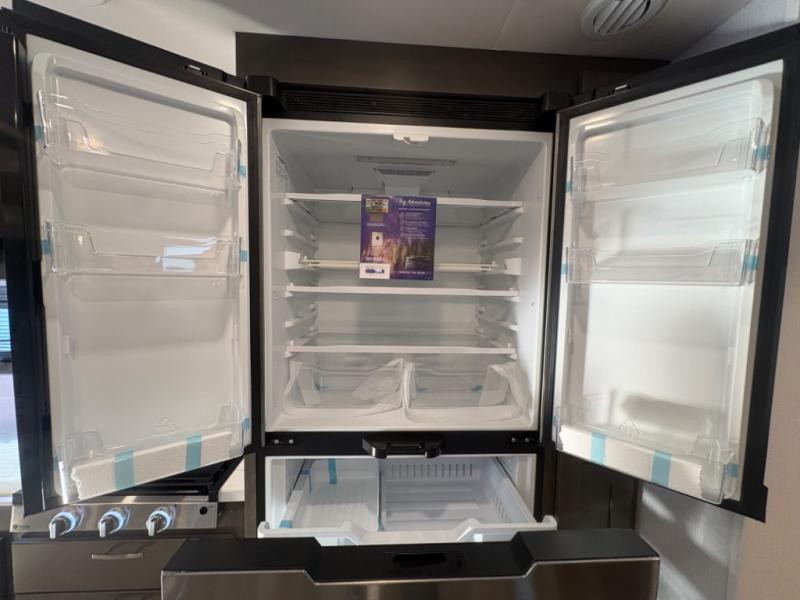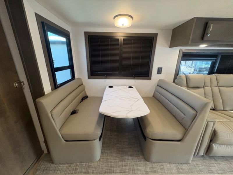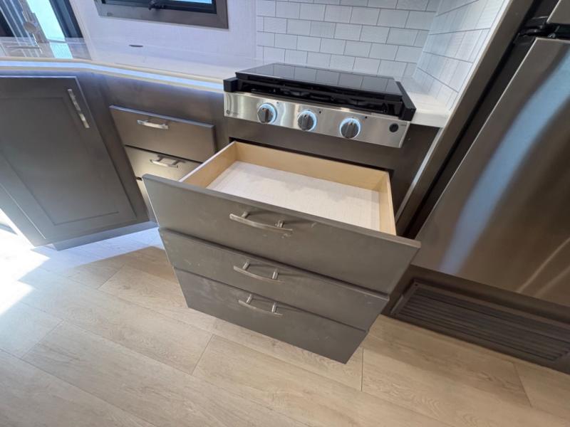 The heart of the coach is a beautifully appointed kitchen equipped for real meal preparation on the road. With residential-style appliances, abundant counter space, a large refrigerator, and smart storage solutions, the kitchen makes it easy to cook breakfast before a hike or dinner after exploring a new destination. The adjacent dining area provides comfortable seating where family and friends can enjoy meals, games, or conversation.