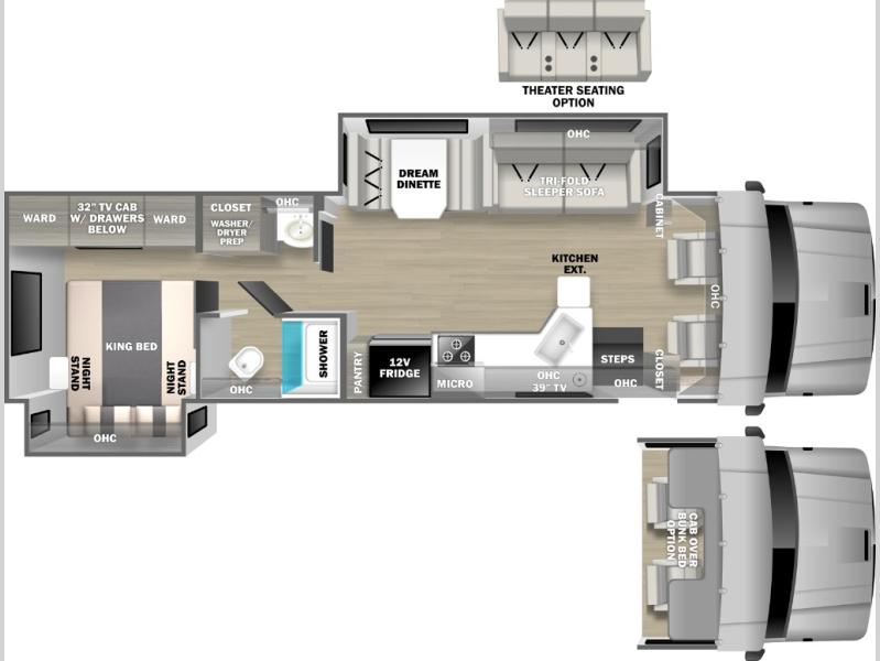 The Europa 34SS offers a private sleeping area with a king-size bed, ample wardrobe storage, and a spa-inspired bathroom designed to bring residential comfort to the road. With Dynamax’s renowned construction—laminated sidewalls, a one-piece fiberglass roof, and an insulated heated basement—this coach is built for four-season travel and long-term durability.