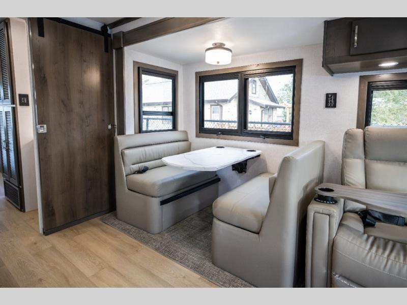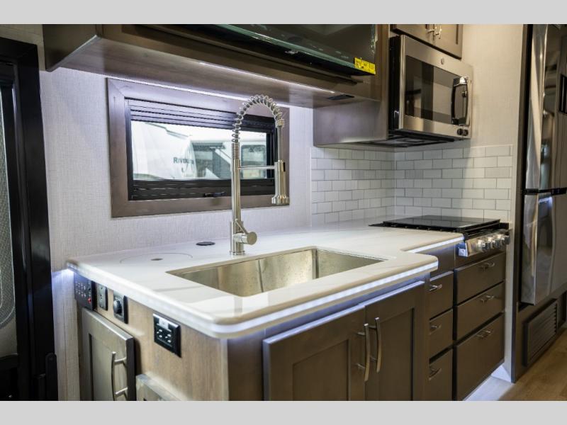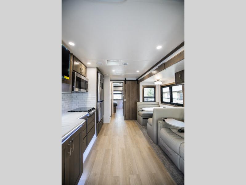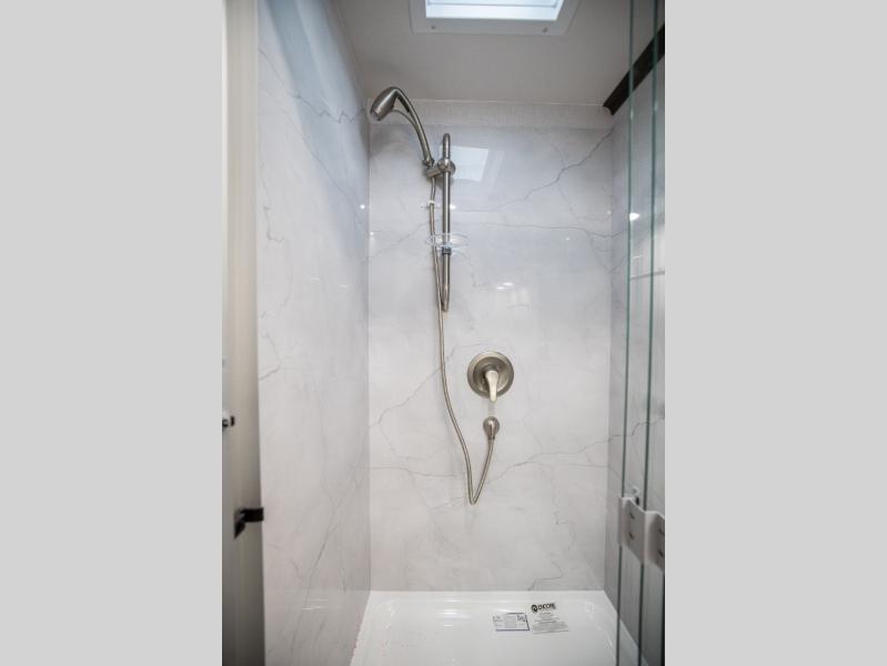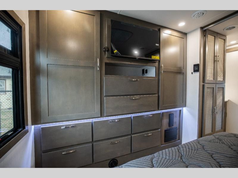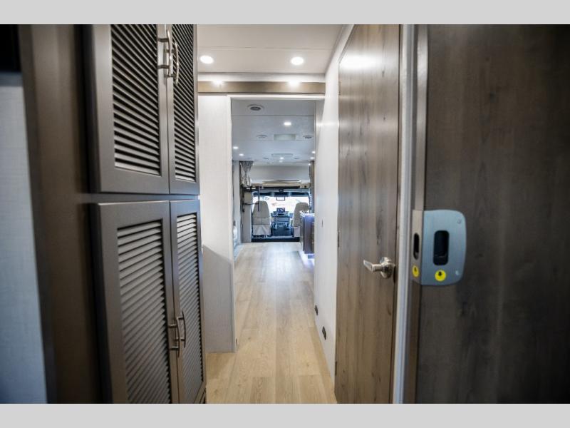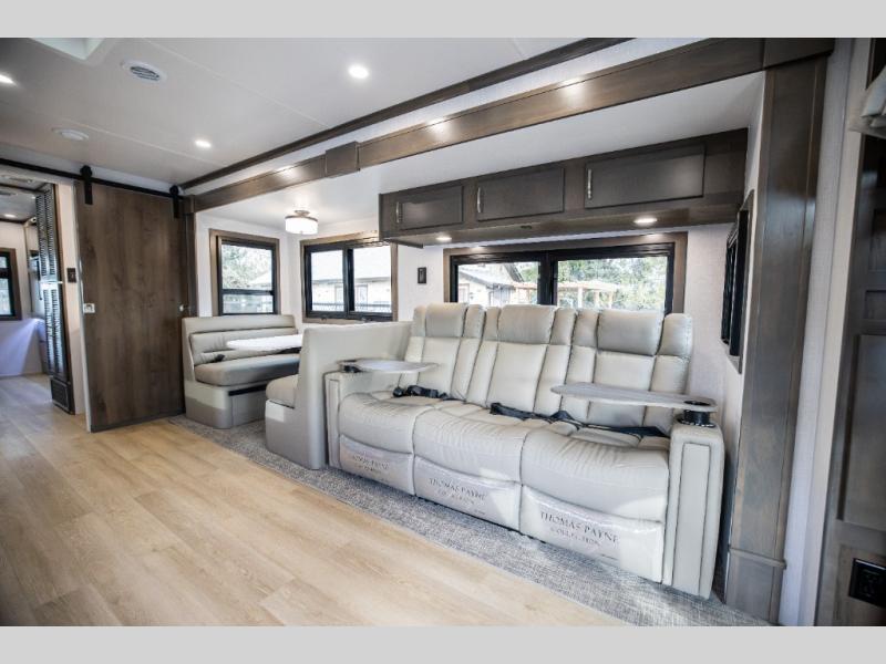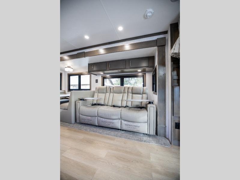 The Europa Super C diesel motorhome by Dynamax is coming to you with all the power, durability, and luxury you need for your adventurous lifestyle. You will love the solid surface countertop with LED edge lighting in the kitchen, the premium vinyl flooring throughout, and the clean, contemporary styling. The on-demand water heater is a luxury you won't want to travel without, and the multiplex wiring with a touch screen command center includes switch panels, and Bluetooth Smart Phone app control for ease of use. There are dual 12V 8D AGM deep-cycle maintenance-free house batteries and a single 200-watt solar panel to go off-grid if you choose, and the 12,000 lb. trailer hitch will allow you to bring along the off-road toys. Some of the exterior features that make this coach great are the armless patio awning with LED lighting, the automatic four-point hydraulic leveling jacks, and the eye-catching custom full-body paint package!