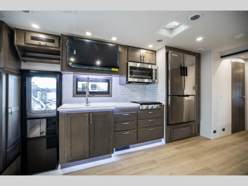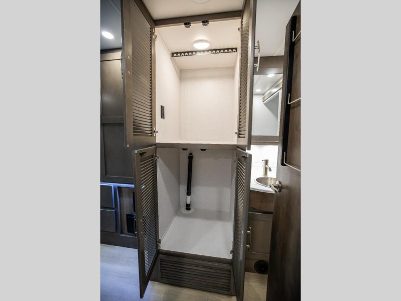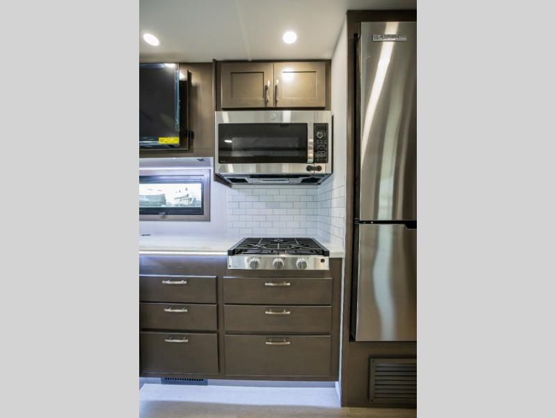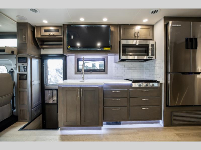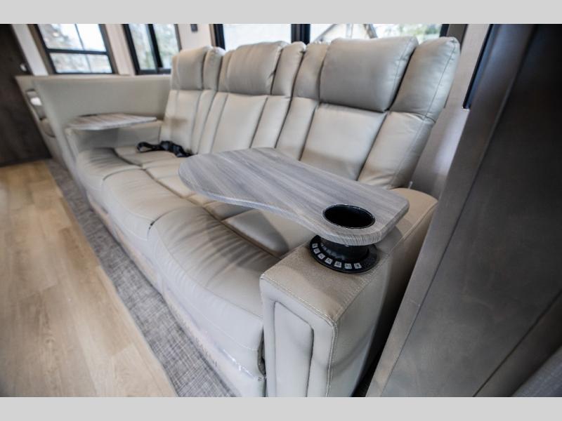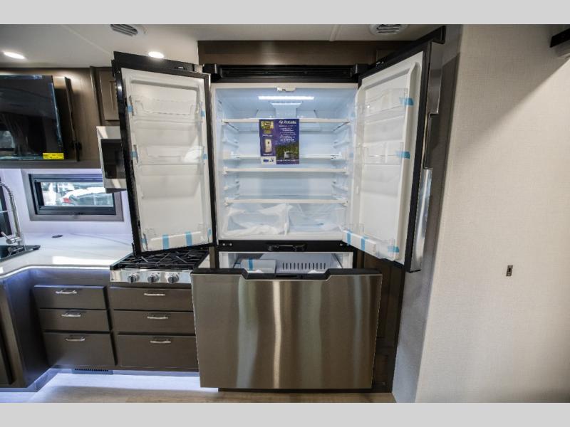 This double slide out coach is perfect for any vacation. Once you arrive at your destination, you can relax on the tri-fold sleeper sofa or play a game at the dream dinette. There is also a 39" LED Smart TV across from the sofa for easy viewing. You will enjoy cooking in the kitchen on the three-burner range or in the convection microwave, plus there is a 15 cu. ft. 12V 3-door compressor-driven refrigerator for perishables. This Europa also features a rear master suite with a king bed slide out, a 32" LED Smart TV, and dual bedroom wardrobes. The full bath includes washer/dryer prep and a hallway sink for additional convenience. If you need more space, consider the cab-over bunk option to sleep more guests!