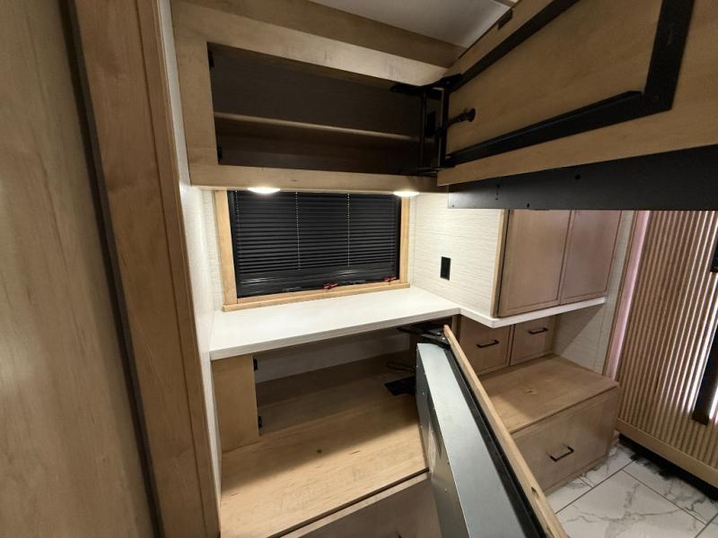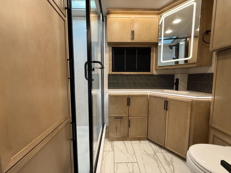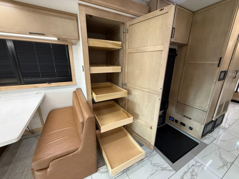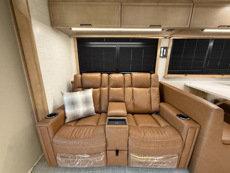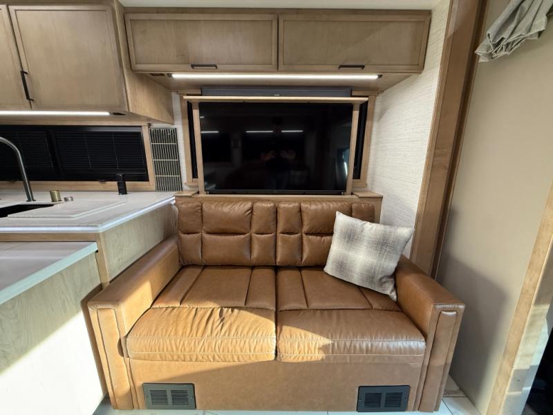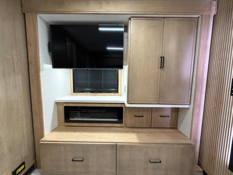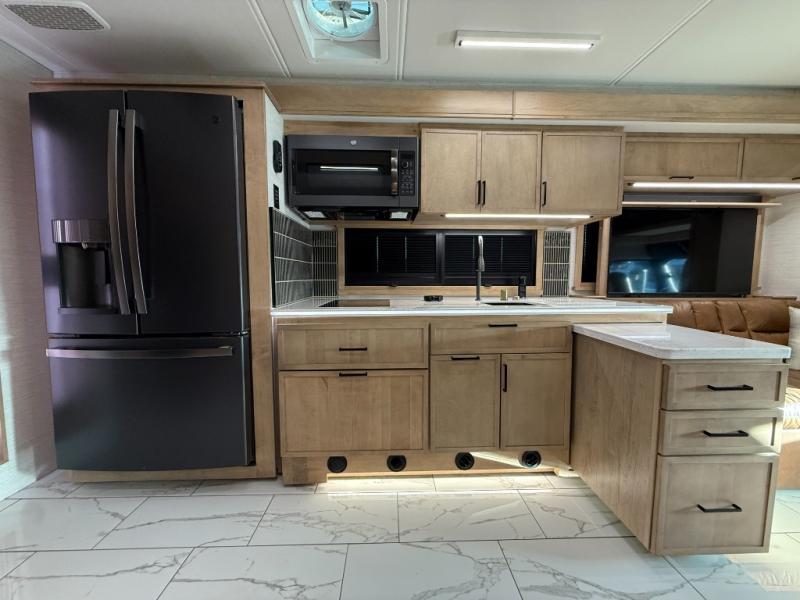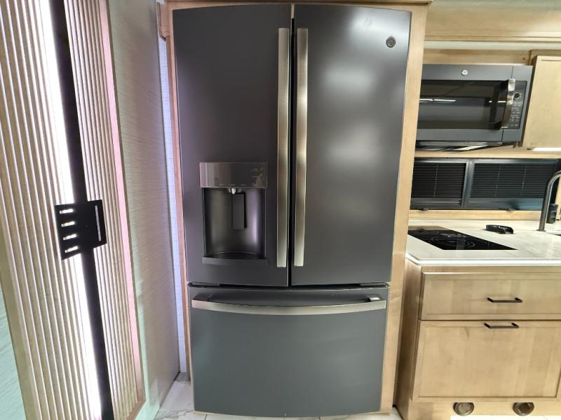 Bring the crew along in the Grand Sport 45CA and still feel like you’re in a luxury condo, not just a motorhome. Up front, the cab-over bunk, home theater lounge with USB ports, love seat, and soft-touch dinette with lift-up storage will give everyone a place to relax while you enjoy the 50" LED smart TV with Sonos sound bar. The chef-friendly galley offers a 22 cu. ft. residential refrigerator with ice maker, induction range, convection microwave with air fryer, solid surface countertops, dishwasher, and a power countertop extension plus pantry. At the rear, a king bed suite with fireplace, 43" smart TV with Bose sound bar, wardrobe with digital safe, and a spa-like bath featuring a 38" x 40" solid-surface shower with teak seat and deluxe multi-head system turns travel days into resort stays.