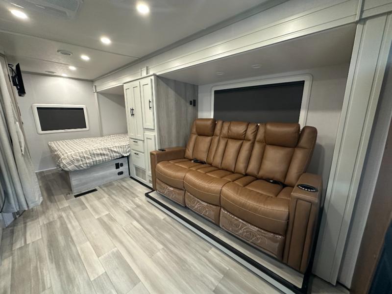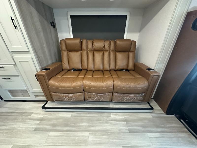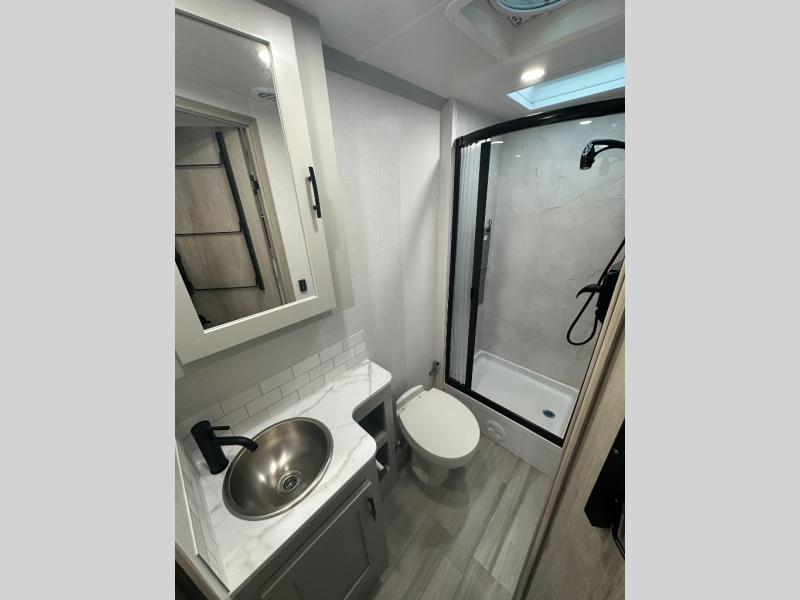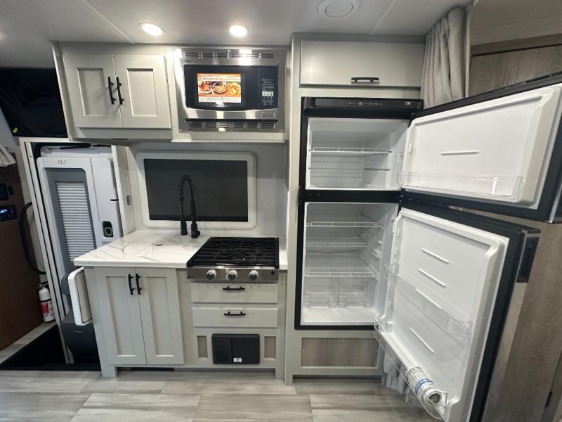 Take this motorhome on your greatest adventures yet! Start each morning feeling well rested after sleeping on the corner queen bed then head to the rear corner bathroom to freshen up in the shower with an Oxygenics body spa RV shower head and a skylight above for added headroom and natural lighting. Now that you're ready for the day, you can grab some eggs from the 8 cu. ft. two-door compressor-driven refrigerator and fry them up on the three burner cooktop, then enjoy them at the booth dinette. The kitchen also has a countertop extension for more meal prepping space and a convection microwave. This unit also includes a living room 32" LED Smart TV and a 32" LED smart TV across from the bed. You could even switch things up by replacing the booth dinette with an optional 3-seat power recliner, and adding a cab over bunk option!