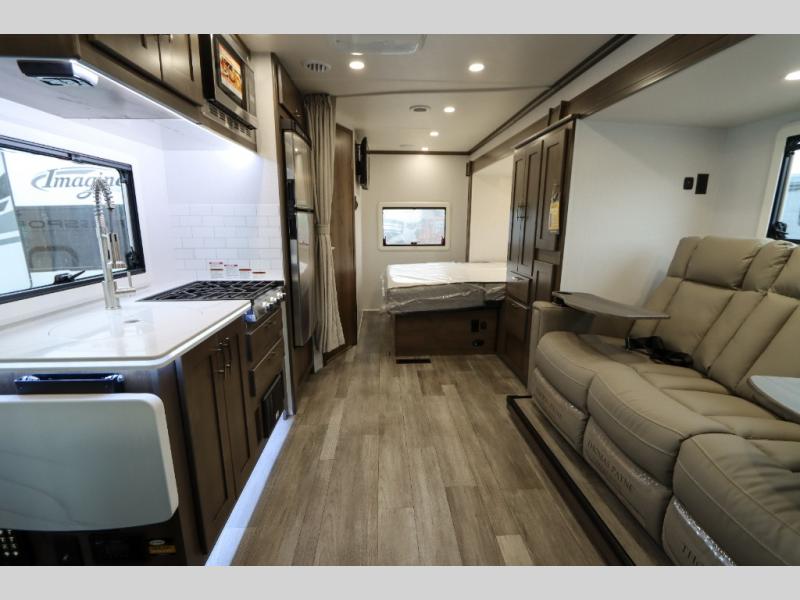 Take this motorhome on your greatest adventures yet! Start each morning feeling well rested after sleeping on the corner queen bed then head to the rear corner bathroom to freshen up in the shower with an Oxygenics body spa RV shower head and a skylight above for added headroom and natural lighting. Now that you're ready for the day, you can grab some eggs from the 8 cu. ft. two-door compressor-driven refrigerator and fry them up on the three burner cooktop, then enjoy them at the booth dinette. The kitchen also has a countertop extension for more meal prepping space and a convection microwave. This unit also includes a living room 32" LED Smart TV and a 32" LED smart TV across from the bed. You could even switch things up by replacing the booth dinette with an optional 3-seat power recliner, and adding a cab over bunk option!