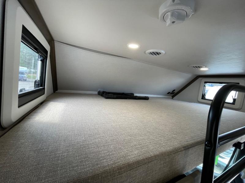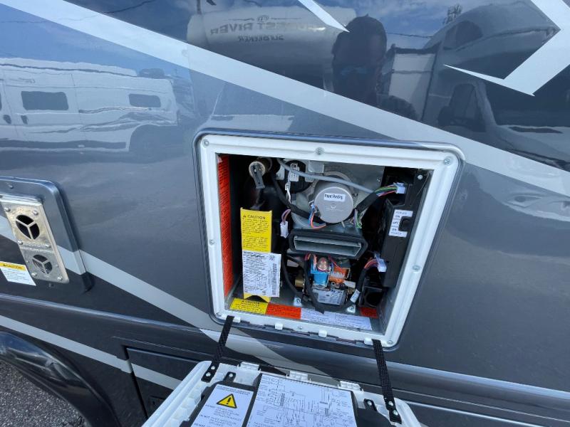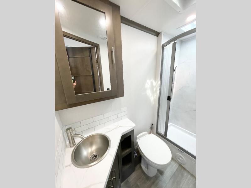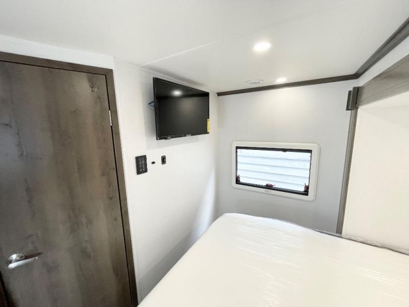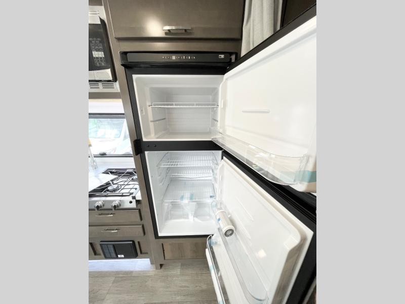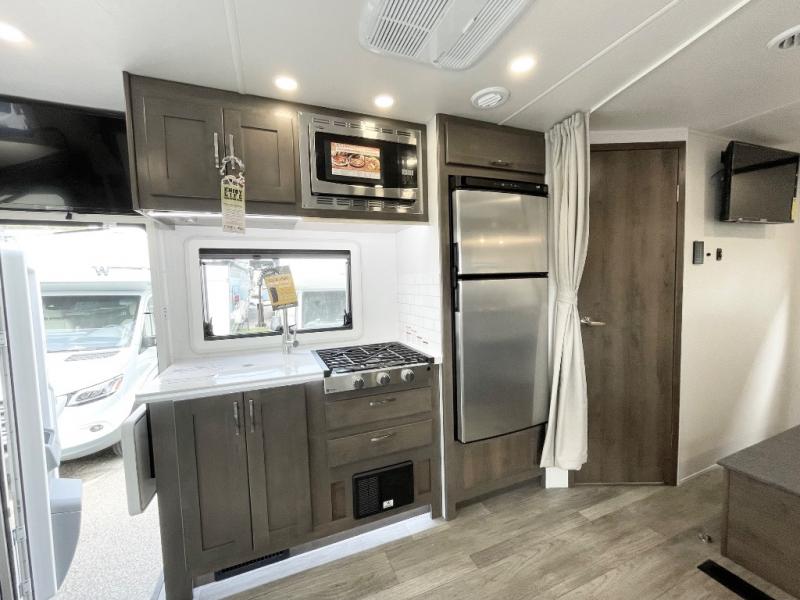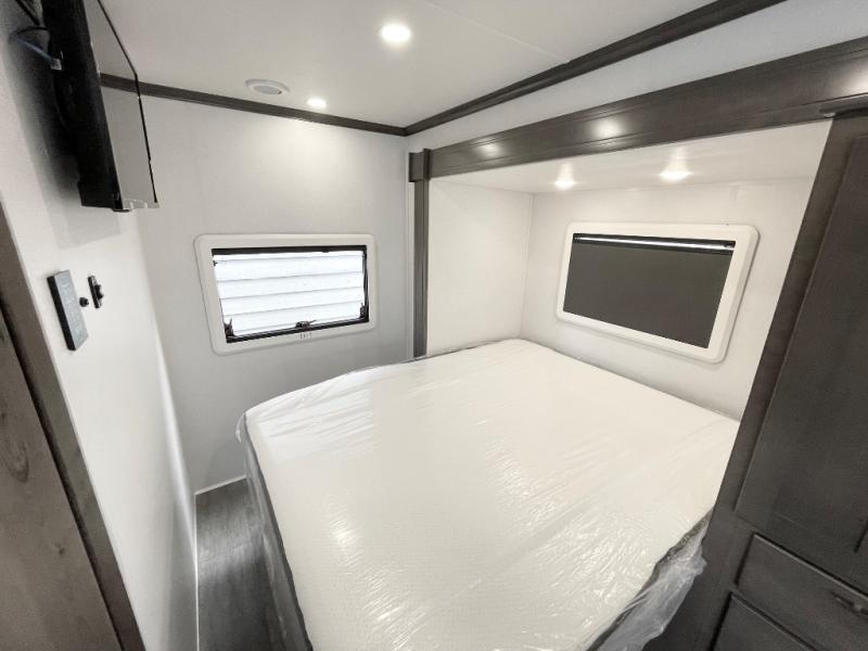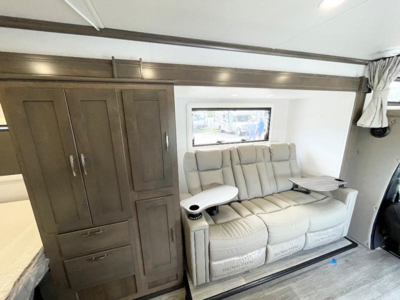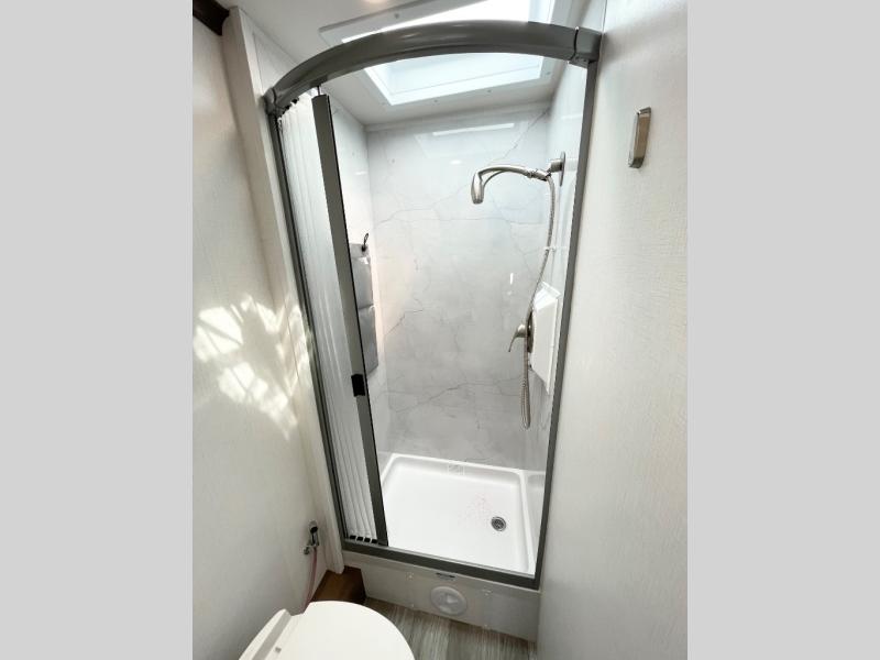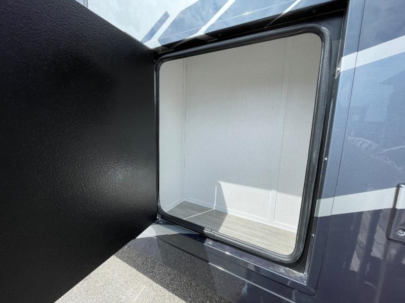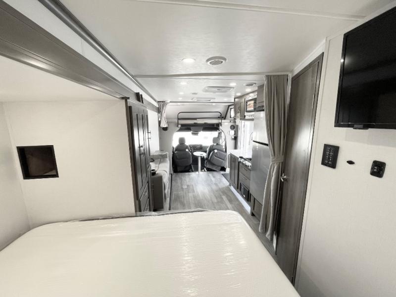 Take this motorhome on your greatest adventures yet! Start each morning feeling well rested after sleeping on the corner queen bed then head to the rear corner bathroom to freshen up in the shower with an Oxygenics body spa RV shower head and a skylight above for added headroom and natural lighting. Now that you're ready for the day, you can grab some eggs from the 8 cu. ft. two-door compressor-driven refrigerator and fry them up on the three burner cooktop, then enjoy them at the booth dinette. The kitchen also has a countertop extension for more meal prepping space and a convection microwave. This unit also includes a living room 32" LED Smart TV and a 32" LED smart TV across from the bed. You could even switch things up by replacing the booth dinette with an optional 3-seat power recliner, and adding a cab over bunk option!
