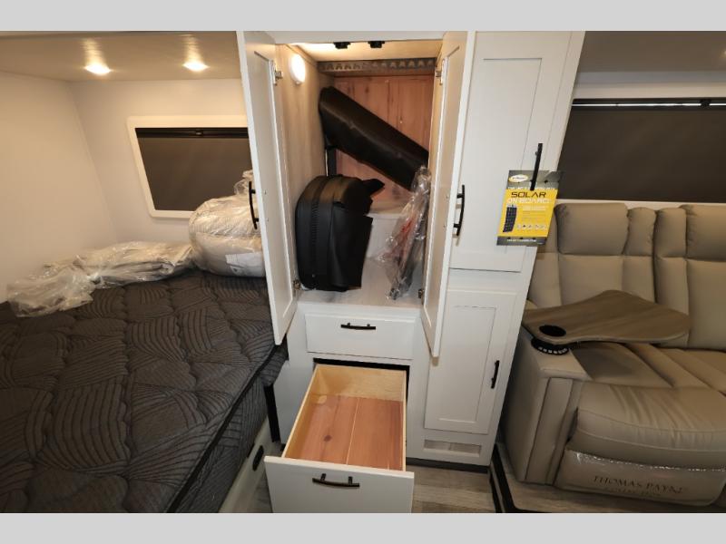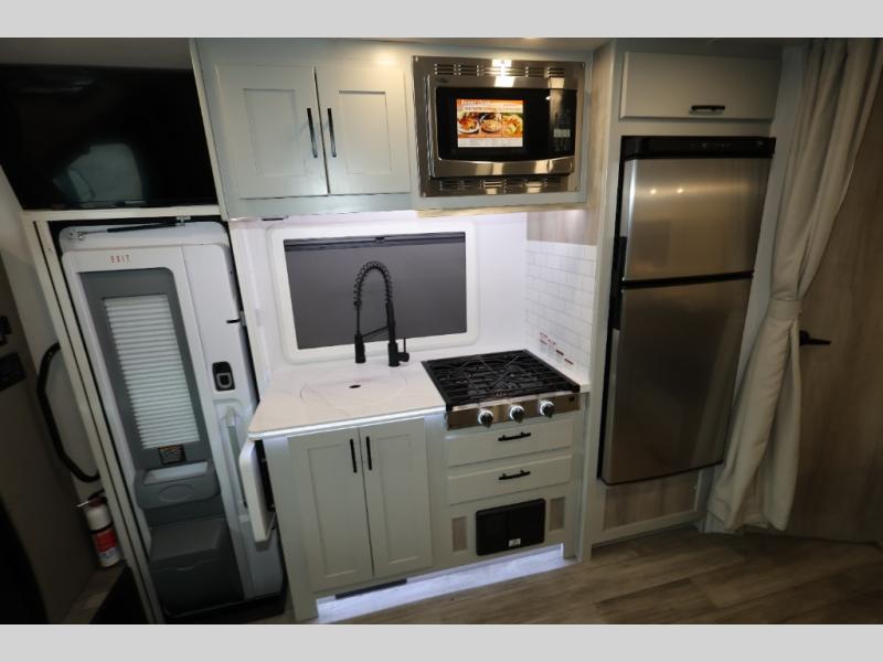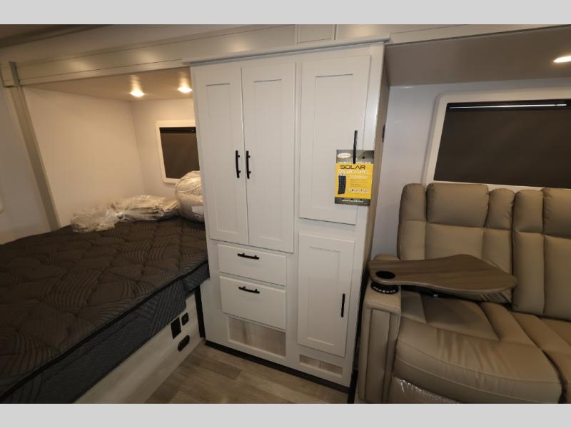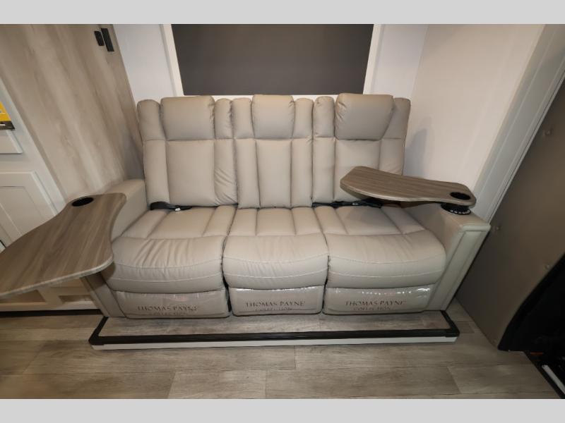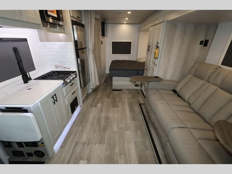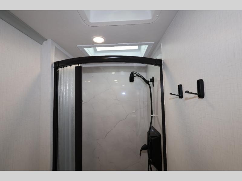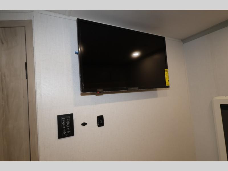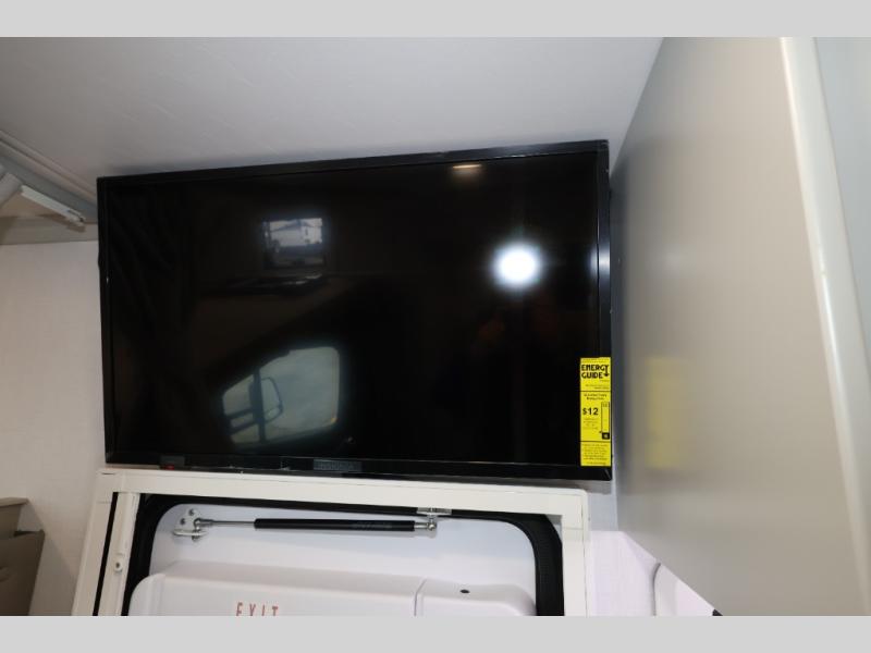 Take this motorhome on your greatest adventures yet! Start each morning feeling well rested after sleeping on the corner queen bed then head to the rear corner bathroom to freshen up in the shower with an Oxygenics body spa RV shower head and a skylight above for added headroom and natural lighting. Now that you're ready for the day, you can grab some eggs from the 8 cu. ft. two-door compressor-driven refrigerator and fry them up on the three burner cooktop, then enjoy them at the booth dinette. The kitchen also has a countertop extension for more meal prepping space and a convection microwave. This unit also includes a living room 32" LED Smart TV and a 32" LED smart TV across from the bed. You could even switch things up by replacing the booth dinette with an optional 3-seat power recliner, and adding a cab over bunk option!