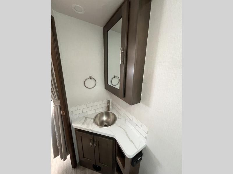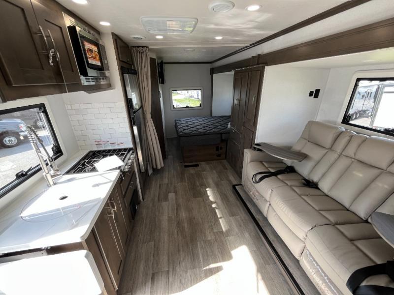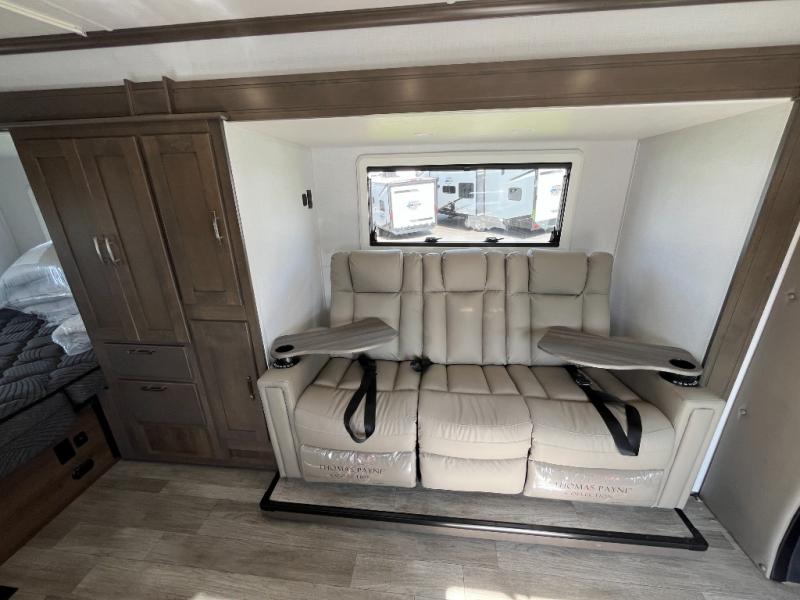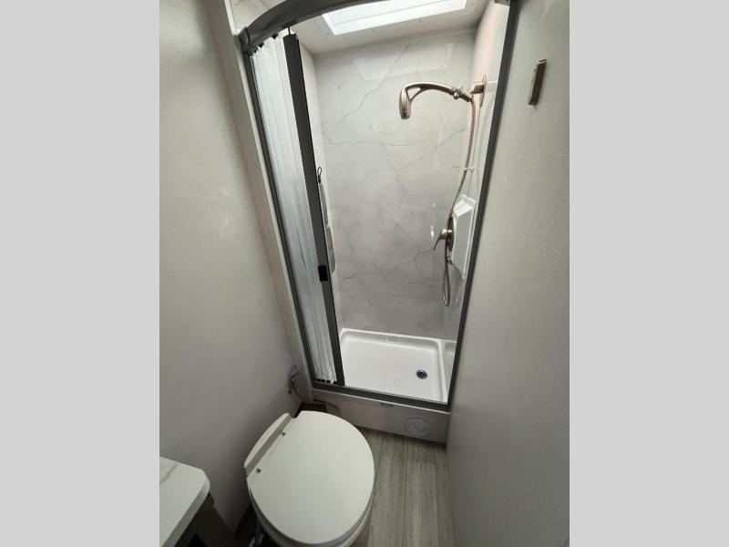 Take this motorhome on your greatest adventures yet! Start each morning feeling well rested after sleeping on the corner queen bed then head to the rear corner bathroom to freshen up in the shower with an Oxygenics body spa RV shower head and a skylight above for added headroom and natural lighting. Now that you're ready for the day, you can grab some eggs from the 8 cu. ft. two-door compressor-driven refrigerator and fry them up on the three burner cooktop, then enjoy them at the booth dinette. The kitchen also has a countertop extension for more meal prepping space and a convection microwave. This unit also includes a living room 32" LED Smart TV and a 32" LED smart TV across from the bed. You could even switch things up by replacing the booth dinette with an optional 3-seat power recliner, and adding a cab over bunk option!