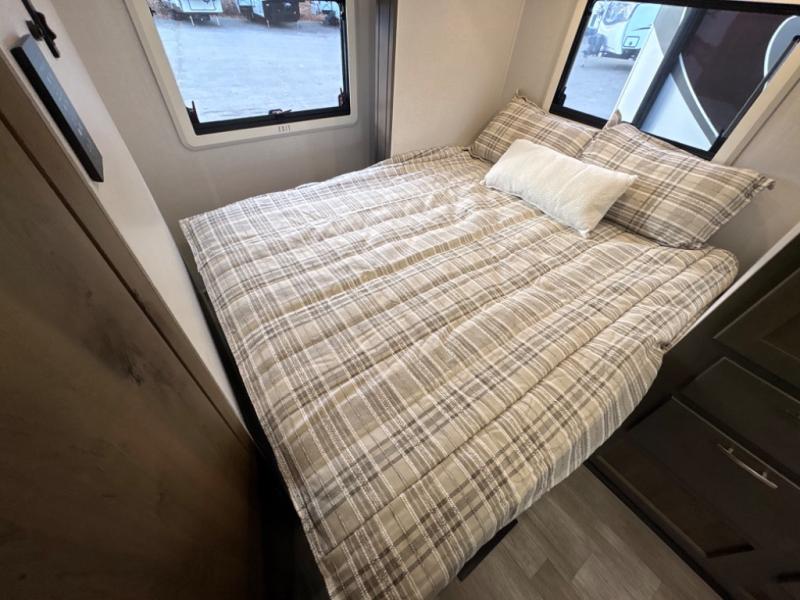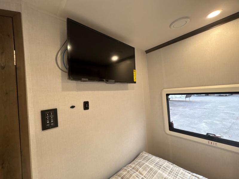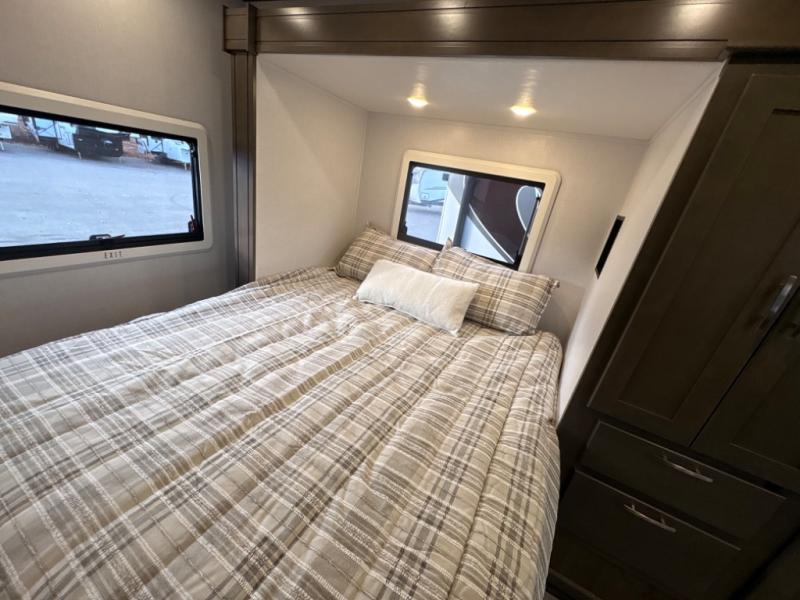 Take this motorhome on your greatest adventures yet! Start each morning feeling well rested after sleeping on the corner queen bed then head to the rear corner bathroom to freshen up in the shower with an Oxygenics body spa RV shower head and a skylight above for added headroom and natural lighting. Now that you're ready for the day, you can grab some eggs from the 8 cu. ft. two-door compressor-driven refrigerator and fry them up on the three burner cooktop, then enjoy them at the booth dinette. The kitchen also has a countertop extension for more meal prepping space and a convection microwave. This unit also includes a living room 32" LED Smart TV and a 32" LED smart TV across from the bed. You could even switch things up by replacing the booth dinette with an optional 3-seat power recliner, and adding a cab over bunk option!