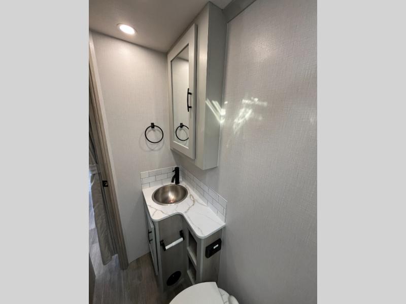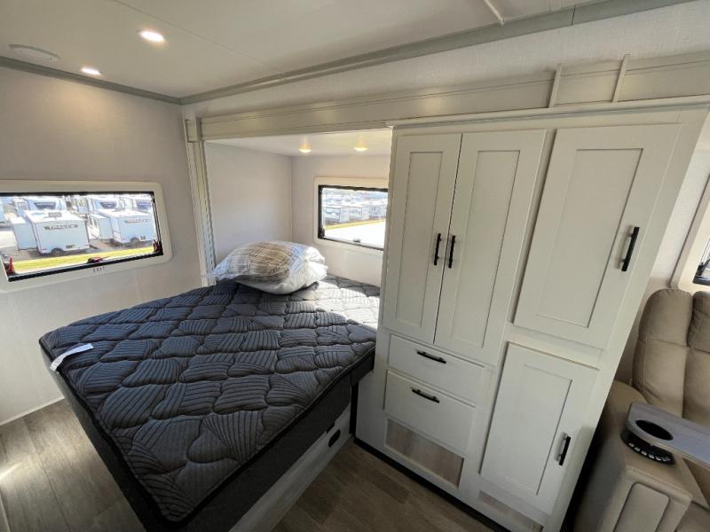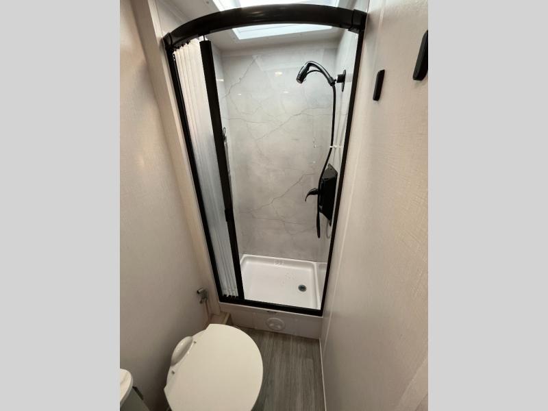 Take this motorhome on your greatest adventures yet! Start each morning feeling well rested after sleeping on the corner queen bed then head to the rear corner bathroom to freshen up in the shower with an Oxygenics body spa RV shower head and a skylight above for added headroom and natural lighting. Now that you're ready for the day, you can grab some eggs from the 8 cu. ft. two-door compressor-driven refrigerator and fry them up on the three burner cooktop, then enjoy them at the booth dinette. The kitchen also has a countertop extension for more meal prepping space and a convection microwave. This unit also includes a living room 32" LED Smart TV and a 32" LED smart TV across from the bed. You could even switch things up by replacing the booth dinette with an optional 3-seat power recliner, and adding a cab over bunk option!
