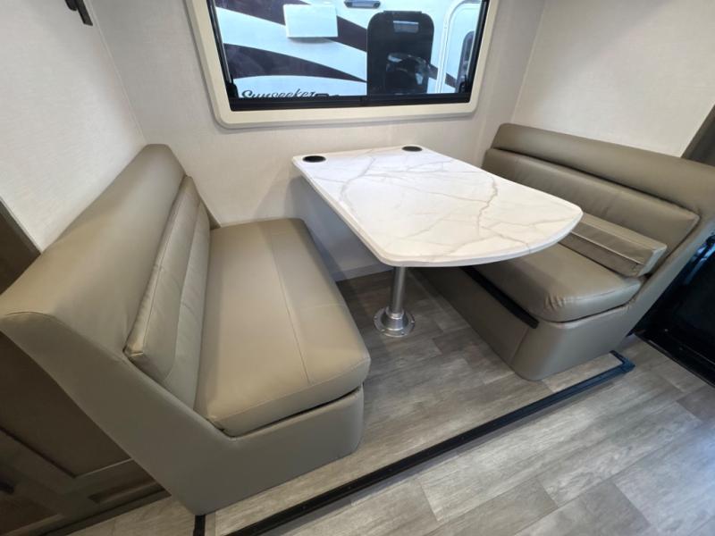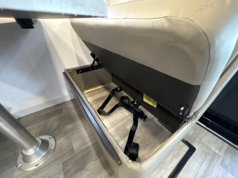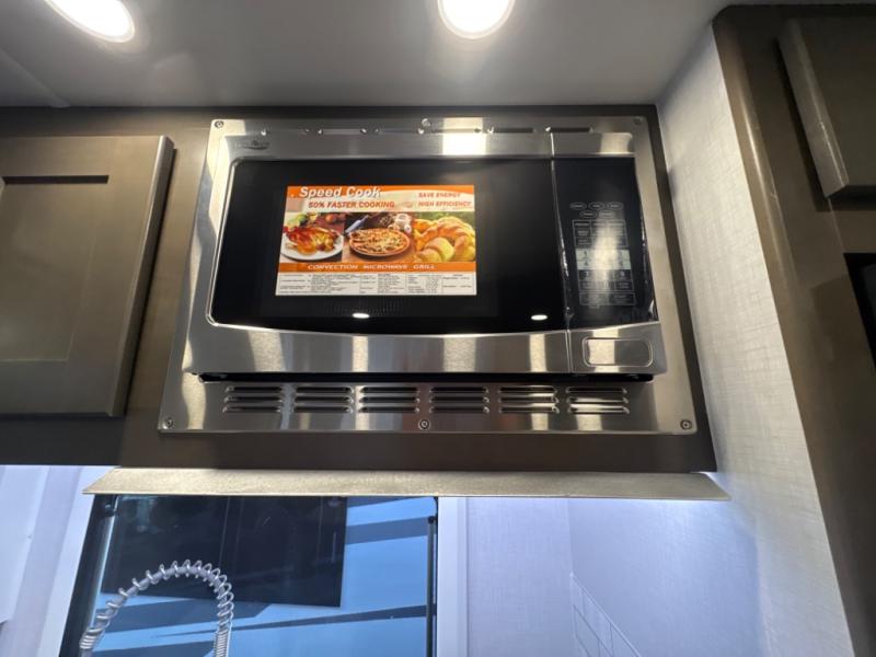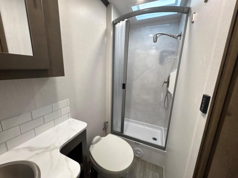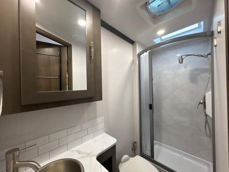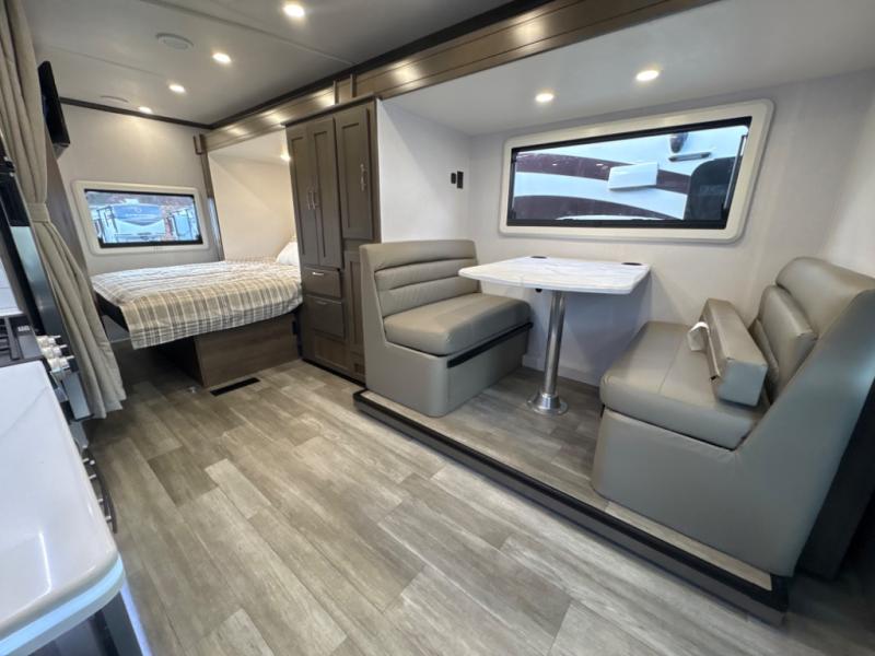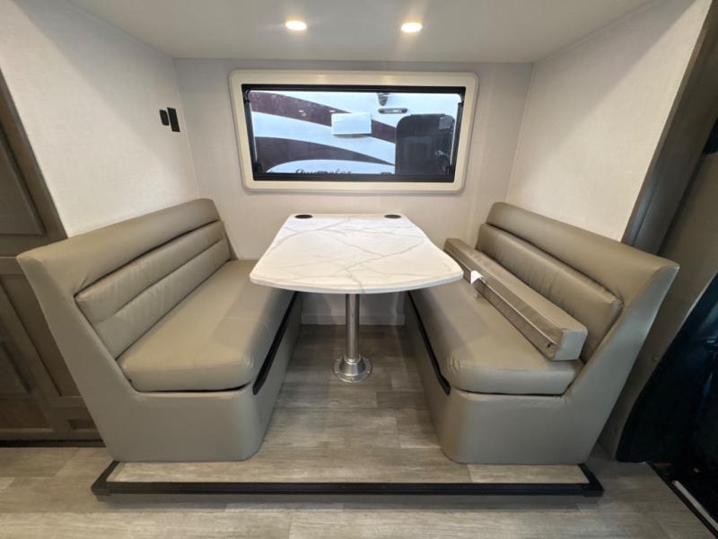 Take this motorhome on your greatest adventures yet! Start each morning feeling well rested after sleeping on the corner queen bed then head to the rear corner bathroom to freshen up in the shower with an Oxygenics body spa RV shower head and a skylight above for added headroom and natural lighting. Now that you're ready for the day, you can grab some eggs from the 8 cu. ft. two-door compressor-driven refrigerator and fry them up on the three burner cooktop, then enjoy them at the booth dinette. The kitchen also has a countertop extension for more meal prepping space and a convection microwave. This unit also includes a living room 32" LED Smart TV and a 32" LED smart TV across from the bed. You could even switch things up by replacing the booth dinette with an optional 3-seat power recliner, and adding a cab over bunk option!