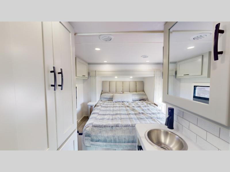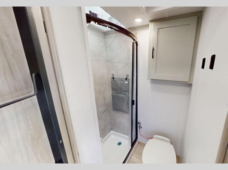 Enjoy a home away from home with this motorhome! The rear private bedroom has a queen bed slide for more interior space and privacy curtains to draw at night. If you need more sleeping space, just add the optional cab over bunk. The booth dinette slide is not only great for enjoying meals and play card games, but can also transform into an extra sleeping space. You could also switch it out for the optional theater seating to meet your specific needs. The bathroom has a shower with a skylight above for added natural lighting and an Oxygenics body spa RV shower head for a relaxing shower, and the vanity sink is just outside the bathroom so one person can get ready while another washes up. Store all of your outdoor gear in the exterior seamless rotocast storage compartment with LED lighting to see clearly at night too!