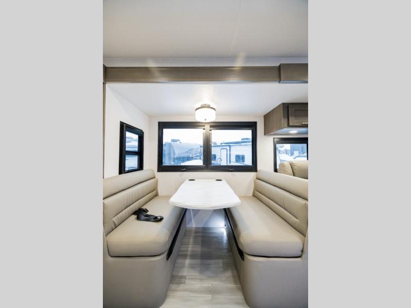 Fall in love with this motorhome bedroom's features, starting with a comfortable queen bed, perfect for a restful night's sleep. Ample storage is provided by the wardrobe and drawers, keeping your belongings organized. You can also enjoy your favorite shows and movies on the TV, or unwind in the full bathroom, complete with all the essentials. Moving to the kitchen area, the booth dinette offers a cozy spot for meals or relaxation, while the pantry provides convenient storage for snacks and supplies. The 12V refrigerator keeps your food and drinks fresh, and the convection microwave makes meal prep an easy and enjoyable task. The tri-fold sleeper sofa offers additional sleeping space for guests, and overhead cabinets provide extra storage for linens, cleaning supplies, and more. More sleeping space can be found in the bunk over the cab, which is perfect for kids or adults alike, offering a cozy sleeping nook with plenty of natural light, and when it's time to relax outside, the exterior awning provides shade and protection, allowing you to focus just on creating new memories.