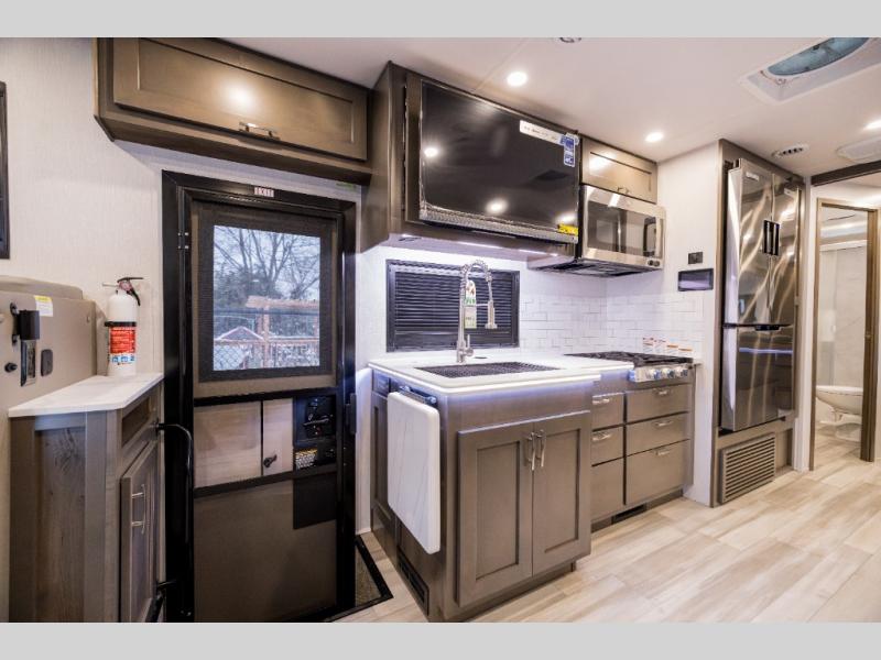 Get on the road again with the amazing Isata 6 Class C diesel motorhomes by Dynamax, built on the rugged Ford F600 XLT Chassis with factory 4-wheel drive. This powerhouse features a responsive TorqueShift 10-Speed Automatic Transmission and an advanced 8" touch screen dash radio with SYNC 4, offering seamless connectivity and entertainment on the go. The exterior boasts durable 2" aluminum-framed, laminated sidewalls with high-density block foam insulation, ensuring a comfortable and quiet ride. A keyless entry touch pad at the entry door provides secure and convenient entry. Inside, enjoy premium vinyl flooring throughout, perfect for withstanding the demands of travel. The interior design exudes warmth and sophistication, featuring exquisite hardwood shaker-style cabinetry and stunning solid surface countertops with LED edge lighting and a backsplash in the kitchen area.