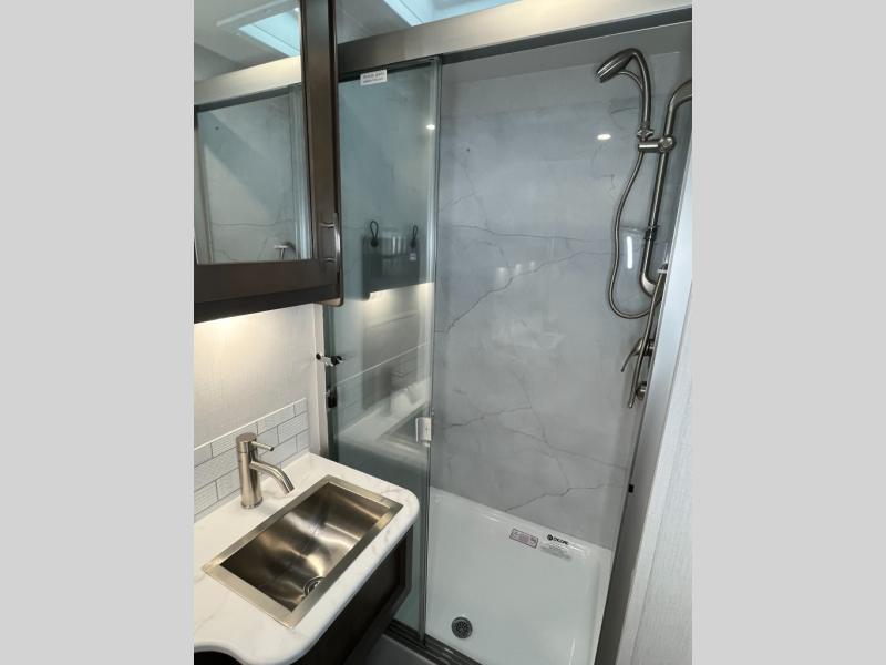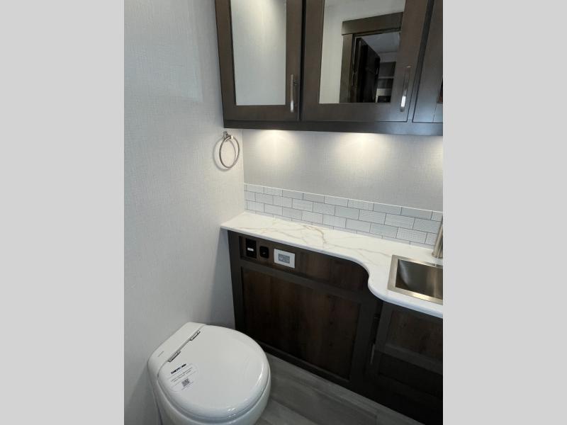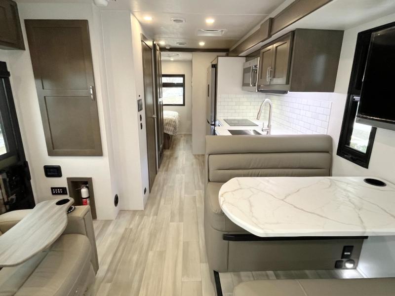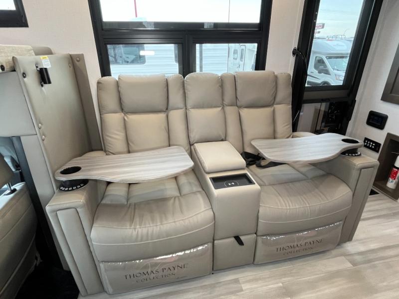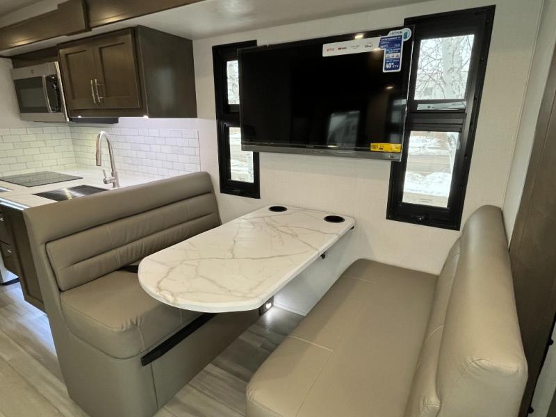Escape to freedom and adventure in our luxurious motorhome, featuring a serene rear bedroom with a plush queen bed, a dresser and TV, and dual wardrobes. There is even washer and dryer prep if you choose to add these appliances. The full bathroom is a tranquil oasis, complete with premium fixtures and amenities. The pantry and efficient 12V refrigerator ensure that your favorite snacks and beverages are always within reach. Whip up a gourmet meal with ease in the convection microwave and take advantage of additional overhead cabinets for storing cookware, dishes, and more. Gather around the cozy booth dinette, perfect for meals, games, or relaxation. Enjoy your favorite shows or movies in the comfortable theater seating area, complete with a stunning TV in perfect view. The charming bunk over the cab is ideal for kids or adults alike, offering a peaceful sleeping nook with plenty of natural light. When it's time to relax outside, the durable 16' exterior awning provides reliable shade and protection from the elements.