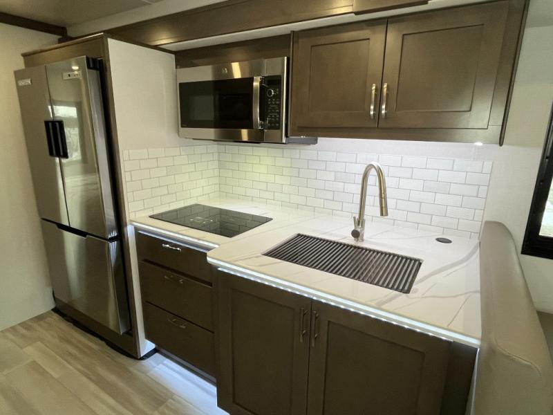Get on the road again with the amazing Isata 6 Super C diesel motorhomes by Dynamax, built on the rugged Ford F600 XLT Chassis with factory 4-wheel drive. This powerhouse features a responsive TorqueShift 10-Speed Automatic Transmission and an advanced 8" touch screen dash radio with SYNC 4, offering seamless connectivity and entertainment on the go. The exterior boasts durable 2" aluminum-framed, laminated sidewalls with high-density block foam insulation, ensuring a comfortable and quiet ride. A keyless entry touch pad at the entry door provides secure and convenient entry. Inside, enjoy premium vinyl flooring throughout, perfect for withstanding the demands of travel. The interior design exudes warmth and sophistication, featuring exquisite hardwood shaker-style cabinetry and stunning solid surface countertops with LED edge lighting and a backsplash in the kitchen area.