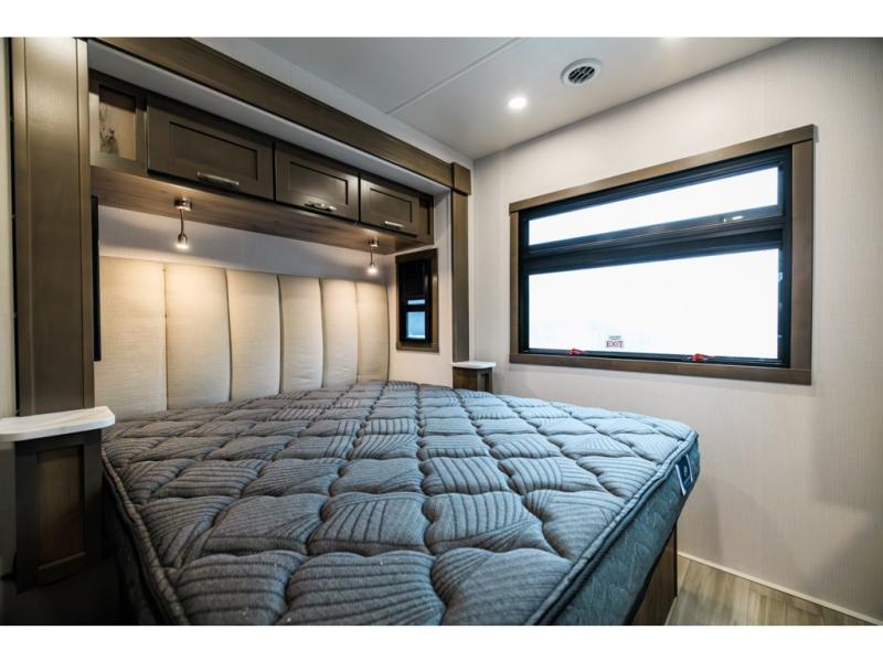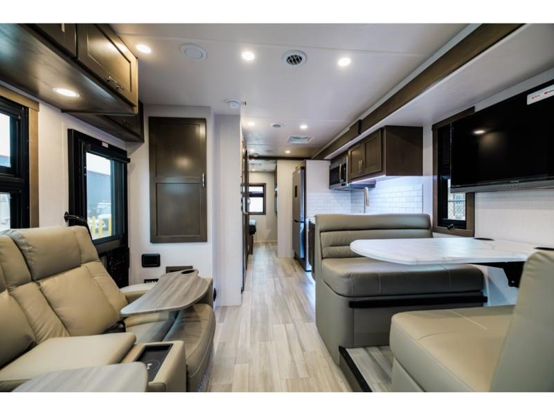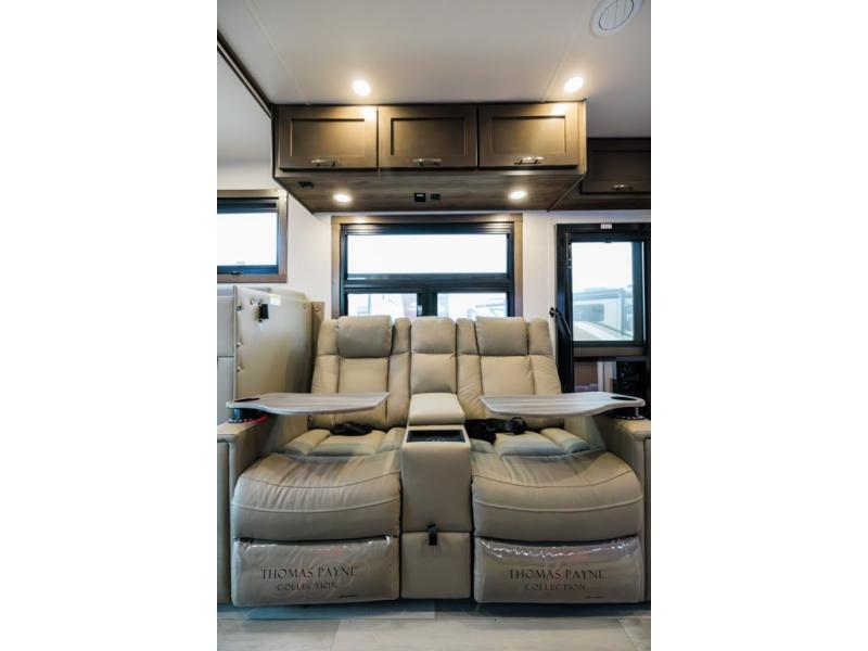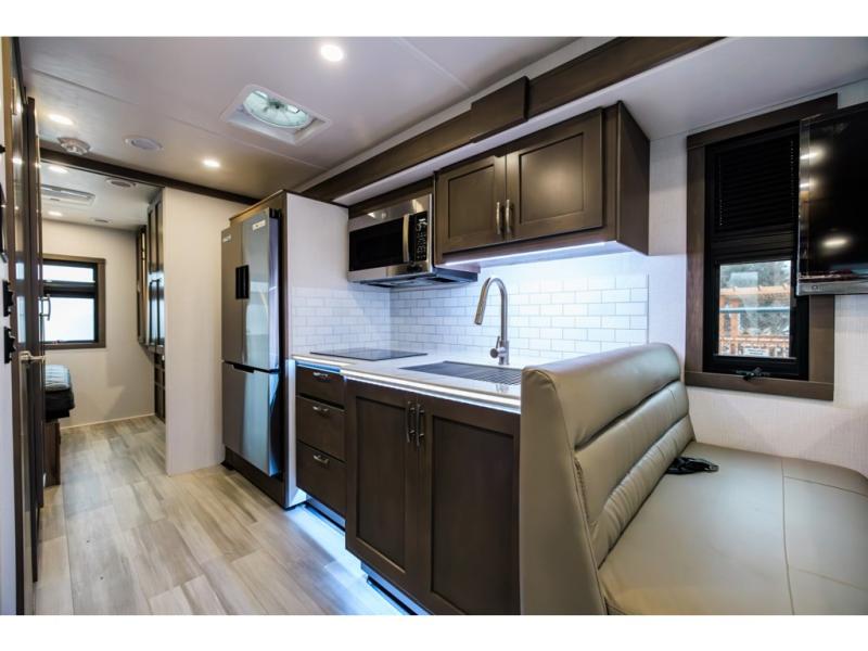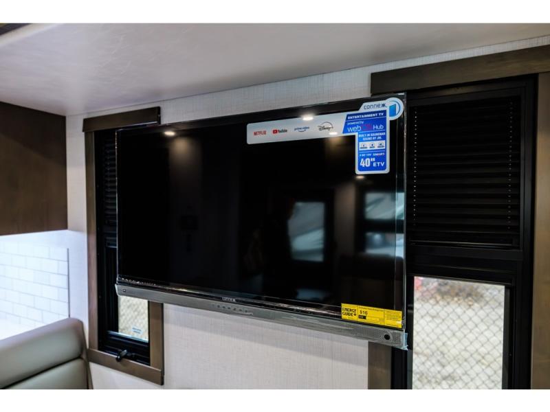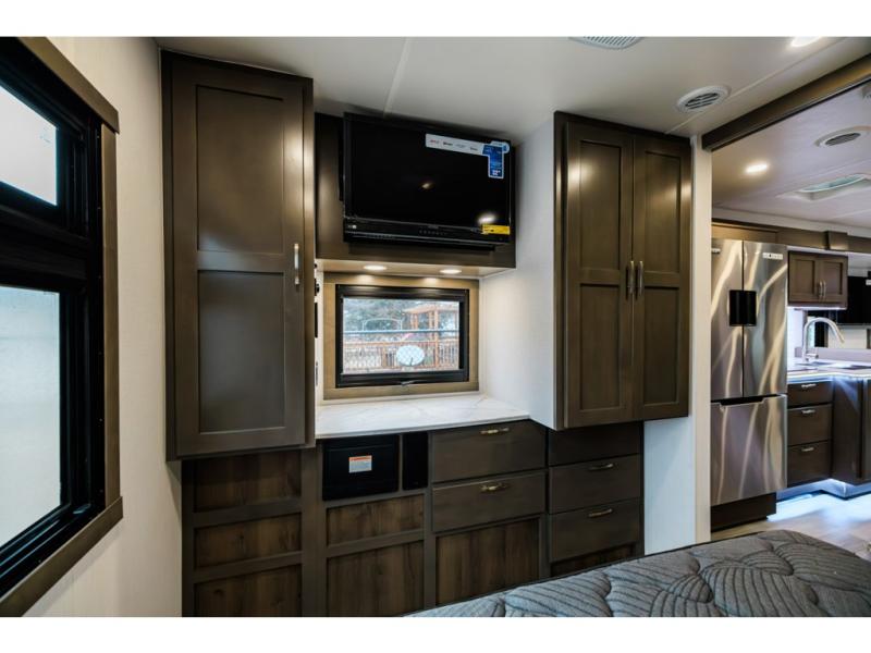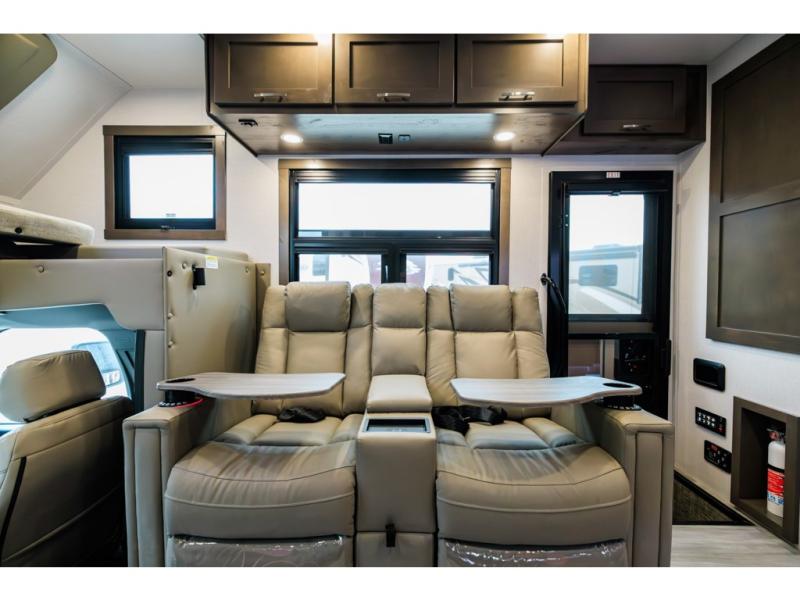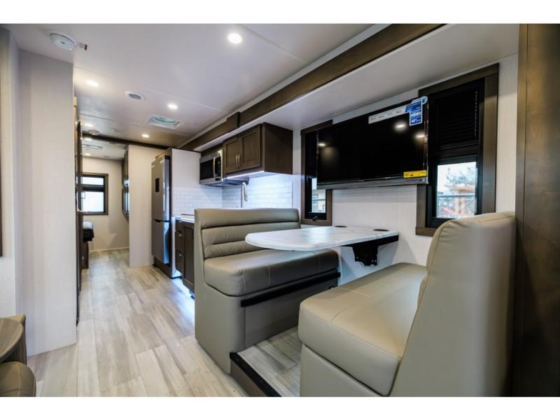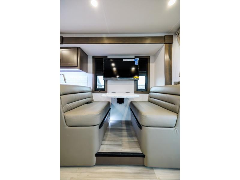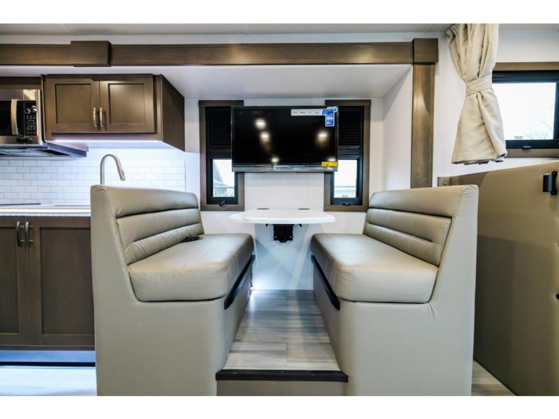 Escape to freedom and adventure in our luxurious motorhome, featuring a serene rear bedroom with a plush queen bed, a dresser and TV, and dual wardrobes. There is even washer and dryer prep if you choose to add these appliances. The full bathroom is a tranquil oasis, complete with premium fixtures and amenities. The pantry and efficient 12V refrigerator ensure that your favorite snacks and beverages are always within reach. Whip up a gourmet meal with ease in the convection microwave and take advantage of additional overhead cabinets for storing cookware, dishes, and more. Gather around the cozy booth dinette, perfect for meals, games, or relaxation. Enjoy your favorite shows or movies in the comfortable theater seating area, complete with a stunning TV in perfect view. The charming bunk over the cab is ideal for kids or adults alike, offering a peaceful sleeping nook with plenty of natural light. When it's time to relax outside, the durable 16' exterior awning provides reliable shade and protection from the elements.