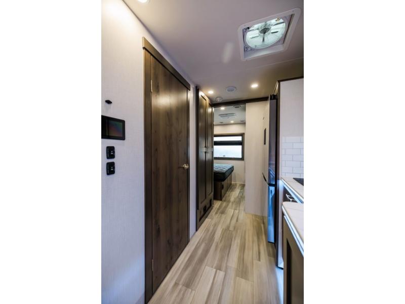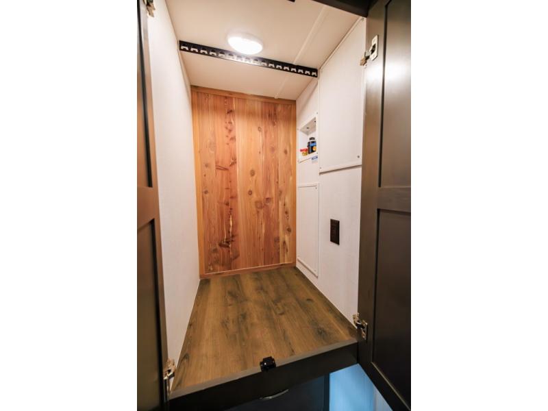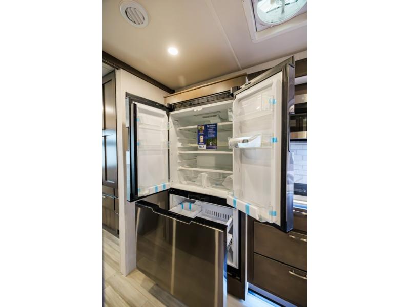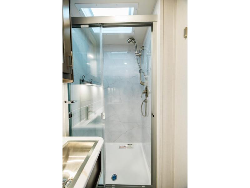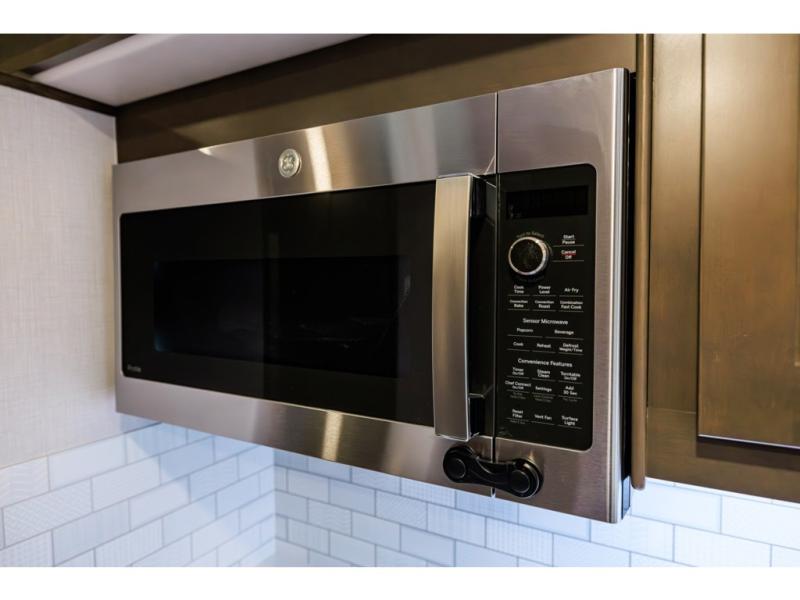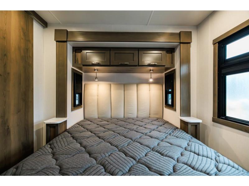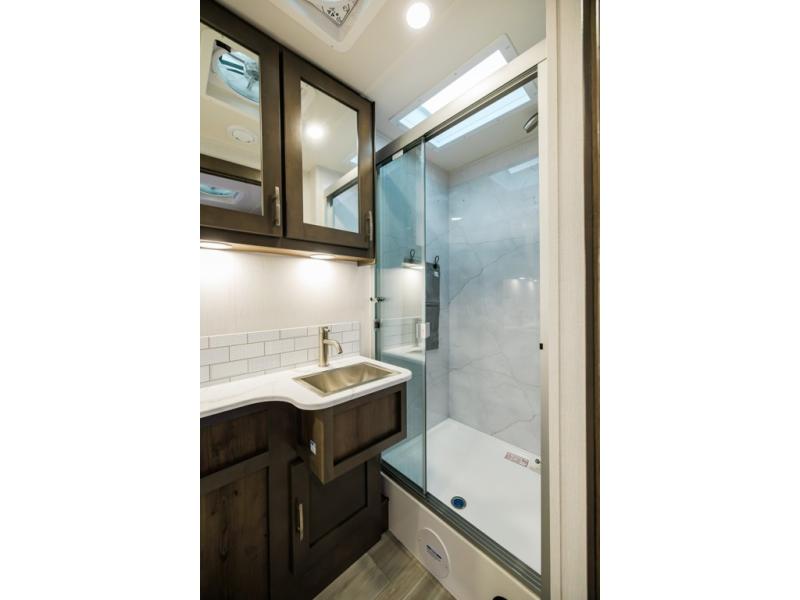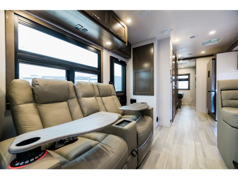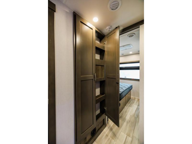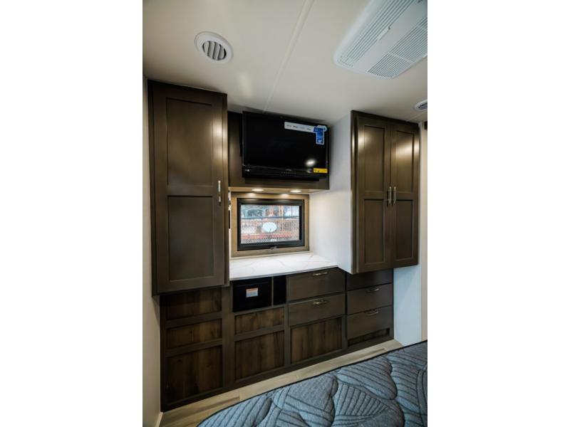 Escape to freedom and adventure in our luxurious motorhome, featuring a serene rear bedroom with a plush queen bed, a dresser and TV, and dual wardrobes. There is even washer and dryer prep if you choose to add these appliances. The full bathroom is a tranquil oasis, complete with premium fixtures and amenities. The pantry and efficient 12V refrigerator ensure that your favorite snacks and beverages are always within reach. Whip up a gourmet meal with ease in the convection microwave and take advantage of additional overhead cabinets for storing cookware, dishes, and more. Gather around the cozy booth dinette, perfect for meals, games, or relaxation. Enjoy your favorite shows or movies in the comfortable theater seating area, complete with a stunning TV in perfect view. The charming bunk over the cab is ideal for kids or adults alike, offering a peaceful sleeping nook with plenty of natural light. When it's time to relax outside, the durable 16' exterior awning provides reliable shade and protection from the elements.