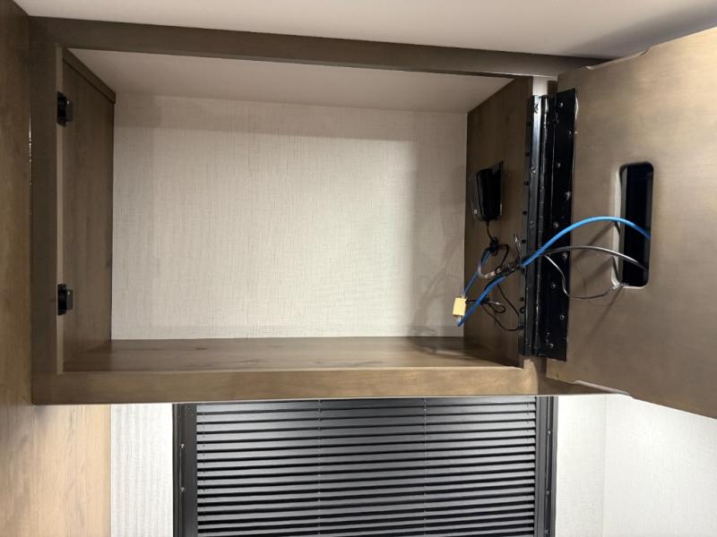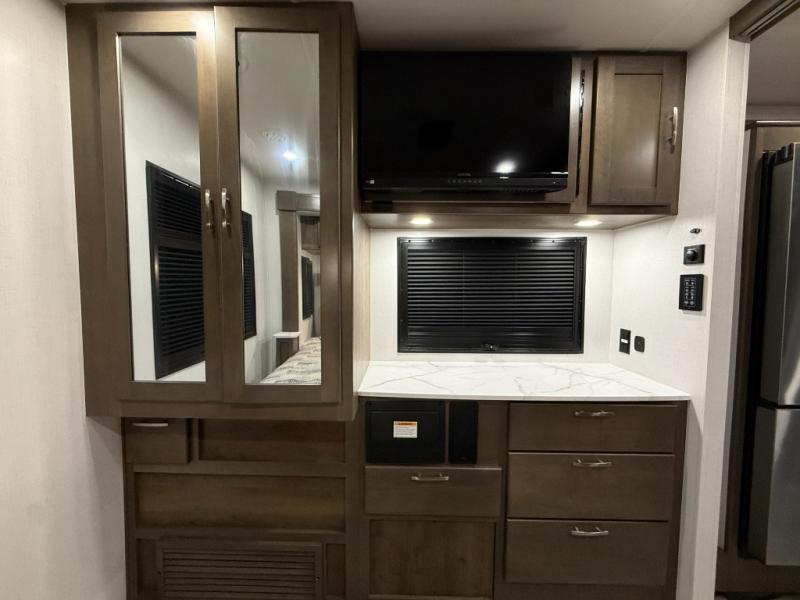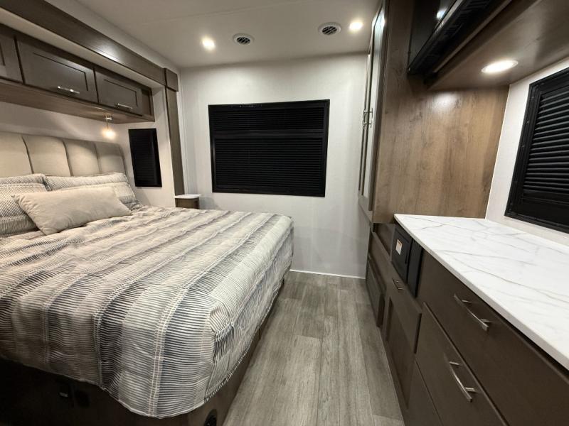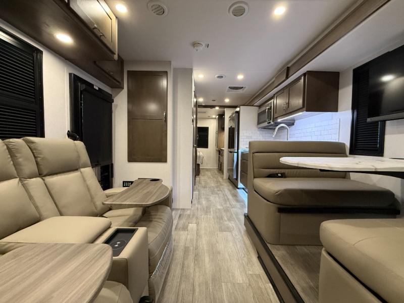 Escape to freedom and adventure in our luxurious motorhome, featuring a serene rear bedroom with a plush queen bed, spacious wardrobe, and elegant dresser. Unwind in front of the TV, surrounded by convenient overhead cabinets for storing your favorite books, games, or decorative items. The full bathroom is a tranquil oasis, complete with premium fixtures and amenities. The pantry and efficient 12V refrigerator ensure that your favorite snacks and beverages are always within reach. Whip up a gourmet meal with ease in the convection microwave, and take advantage of additional overhead cabinets for storing cookware, dishes, and more. The expansive countertop extension provides ample space for food preparation, workspace, or socializing. Gather around the cozy booth dinette, perfect for meals, games, or relaxation. Enjoy your favorite shows or movies in the comfortable theater seating area, complete with a stunning TV. The charming bunk over the cab is ideal for kids or adults alike, offering a peaceful sleeping nook with plenty of natural light. When it's time to relax outside, the durable exterior awning provides reliable shade and protection from the elements.