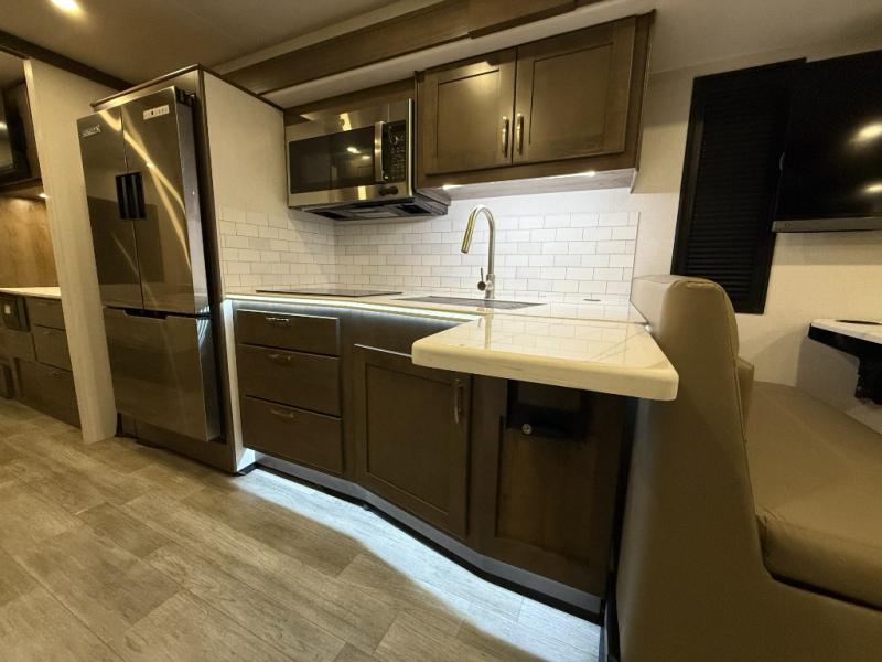 Get on the road again with the amazing Isata 6 Class C diesel motorhomes by Dynamax, built on the rugged Ford F600 XLT Chassis with factory 4-wheel drive. This powerhouse features a responsive TorqueShift 10-Speed Automatic Transmission and an advanced 8" touch screen dash radio with SYNC 4, offering seamless connectivity and entertainment on the go. The exterior boasts durable 2" aluminum-framed, laminated sidewalls with high-density block foam insulation, ensuring a comfortable and quiet ride. A keyless entry touch pad at the entry door provides secure and convenient entry. Inside, enjoy premium vinyl flooring throughout, perfect for withstanding the demands of travel. The interior design exudes warmth and sophistication, featuring exquisite hardwood shaker-style cabinetry and stunning solid surface countertops with LED edge lighting and a backsplash in the kitchen area.