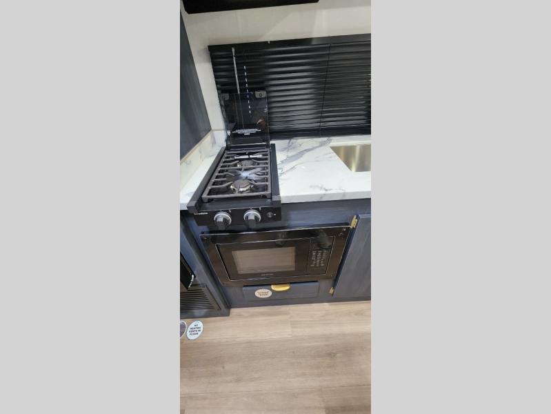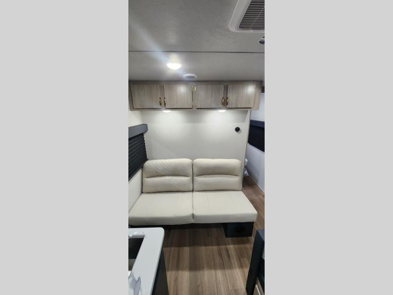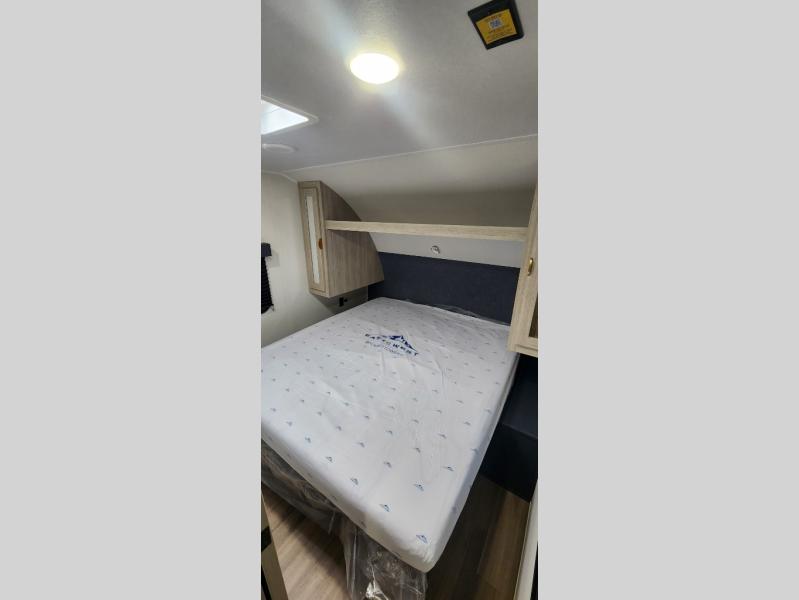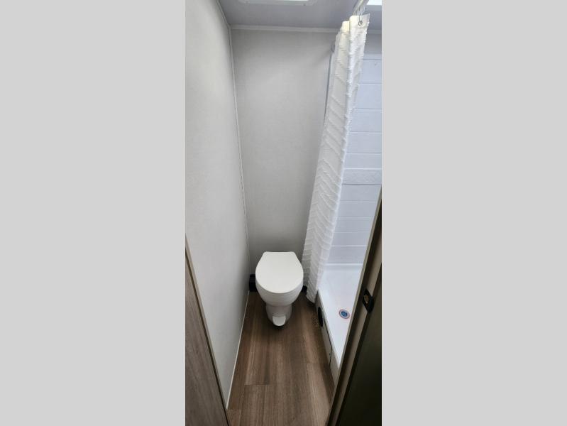 Gather around the booth dinette for meals, games, or planning your next adventure. The kitchen’s got the essentials: a refrigerator to keep snacks chilled, a two-burner cooktop for whipping up meals, and overhead cabinets for tidy storage. Plus, the jackknife sofa is perfect for lounging, movie nights, or just chillin’ with the crew. Bunk beds are perfect for the little adventurers, while the cozy front bedroom features a spacious king bed, ample wardrobes to stash gear, and handy nightstands for those midnight reads. The full bathroom is your private oasis where you can start and end each day feeling fresh and ready for more fun!