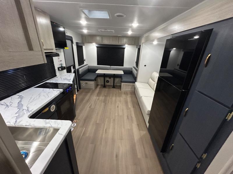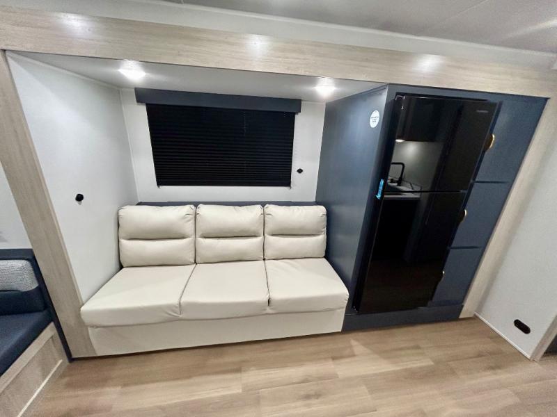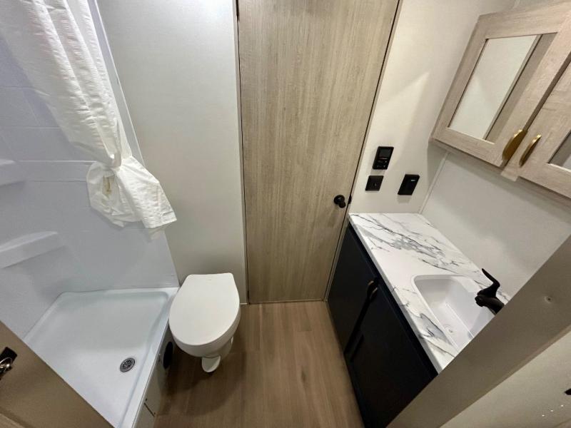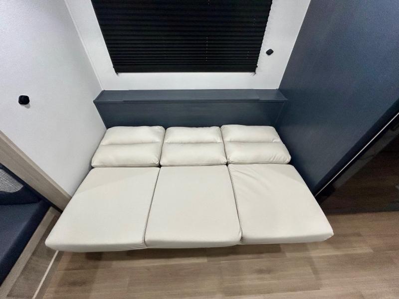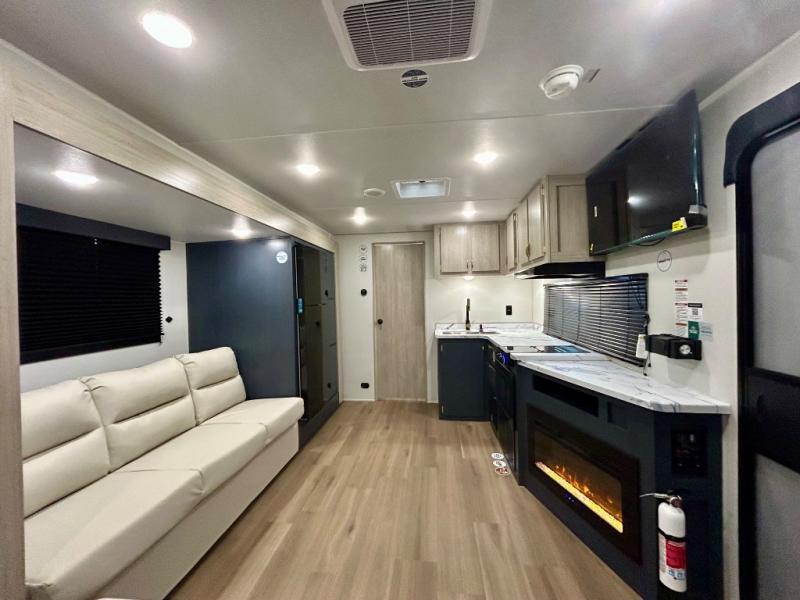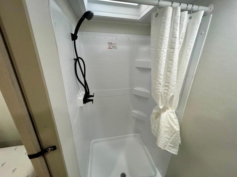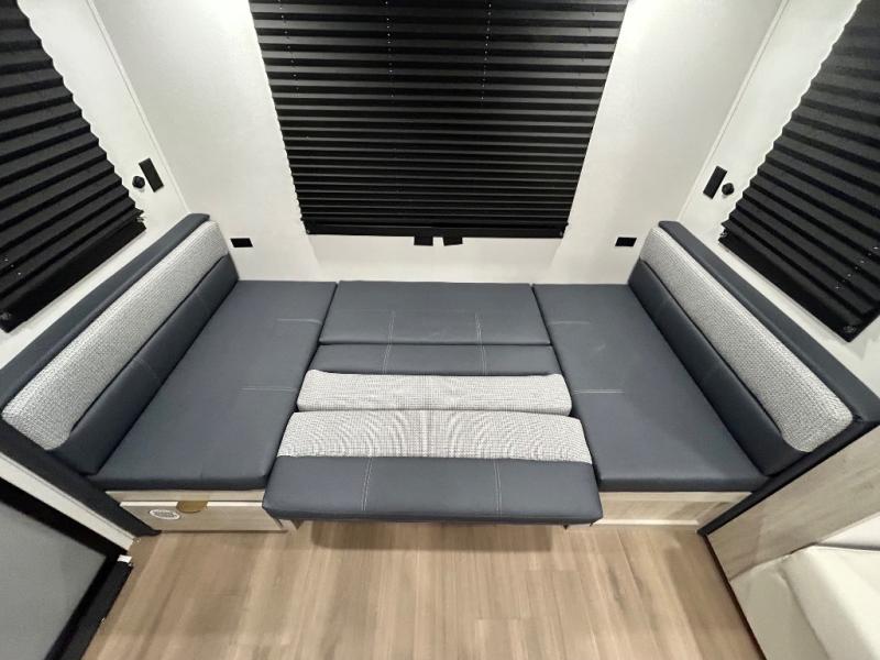 Gather around the U-shaped dinette, perfect for meals, games, or planning your next adventure. The jackknife sofa’s a comfy spot to lounge, binge-watch shows, or chill with the crew. The kitchen’s got you covered with a refrigerator to keep snacks chilled, a pantry for dry goods, plus a two-burner cooktop and microwave to prep meals. Plenty of overhead cabinets keep things tidy. Refresh and recharge in our convenient walk-through bathroom—no backtracking needed. Relax in the spacious front bedroom’s king bed, with ample wardrobes to stash your gear and handy nightstands for those midnight reads. Two entry doors allow for effortless flow in and out, perfect for grabbing gear or stretching your legs.