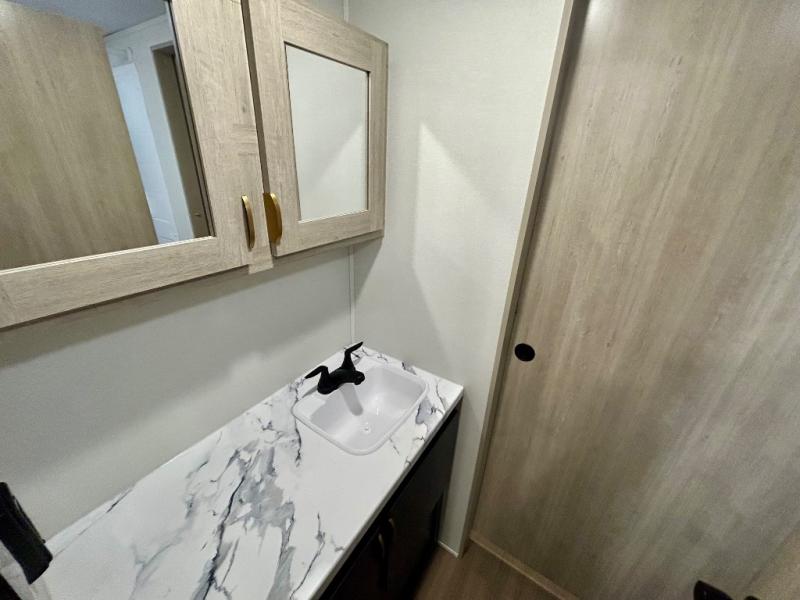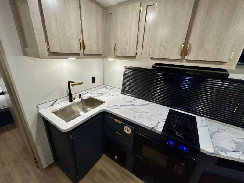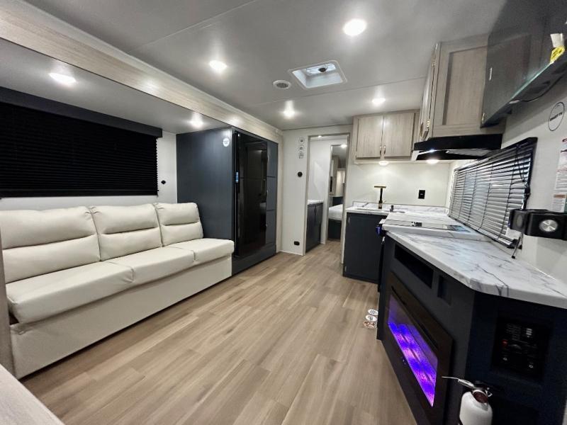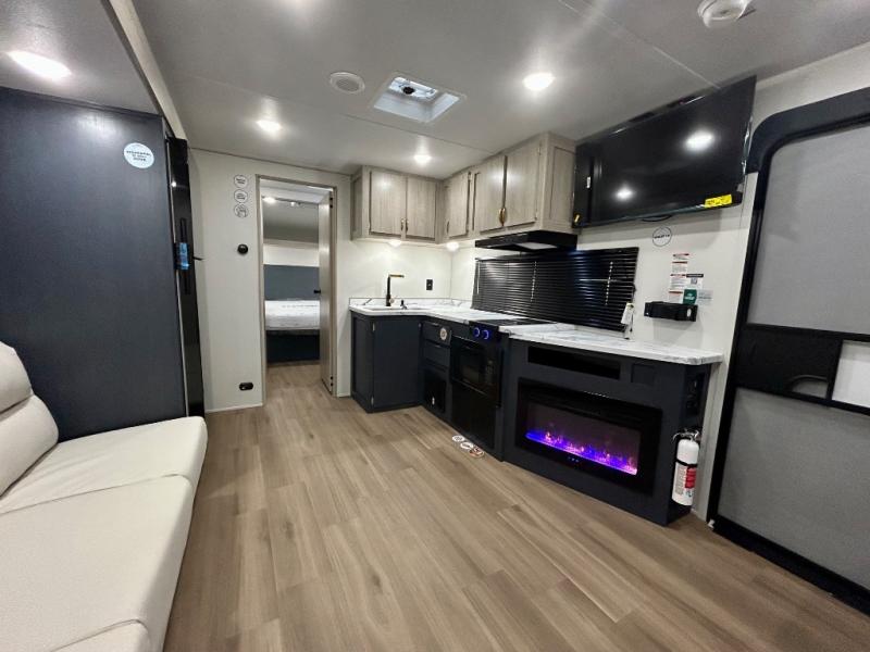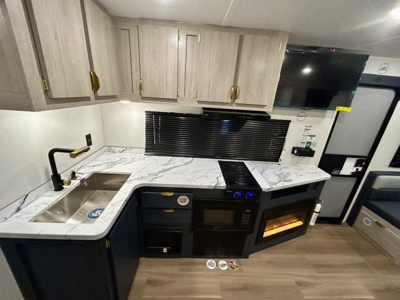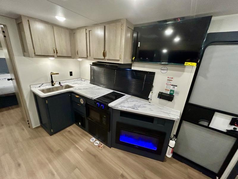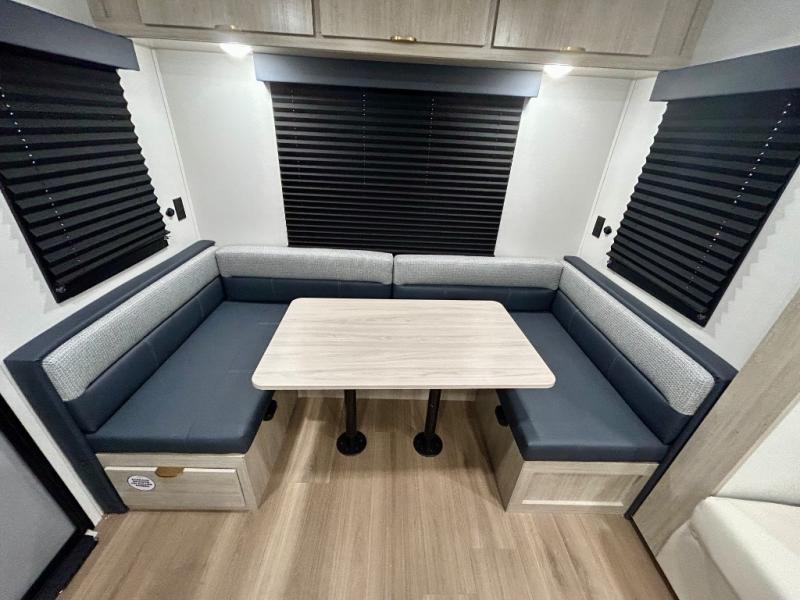 Gather around the U-shaped dinette, perfect for meals, games, or planning your next adventure. The jackknife sofa’s a comfy spot to lounge, binge-watch shows, or chill with the crew. The kitchen’s got you covered with a refrigerator to keep snacks chilled, a pantry for dry goods, plus a two-burner cooktop and microwave to prep meals. Plenty of overhead cabinets keep things tidy. Refresh and recharge in our convenient walk-through bathroom—no backtracking needed. Relax in the spacious front bedroom’s king bed, with ample wardrobes to stash your gear and handy nightstands for those midnight reads. Two entry doors allow for effortless flow in and out, perfect for grabbing gear or stretching your legs.