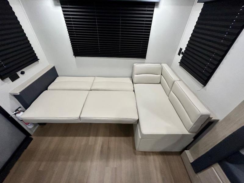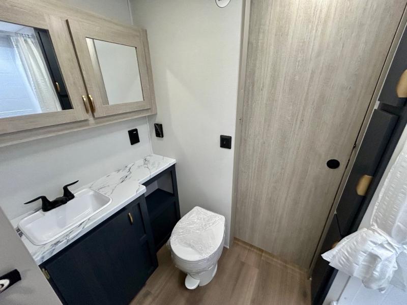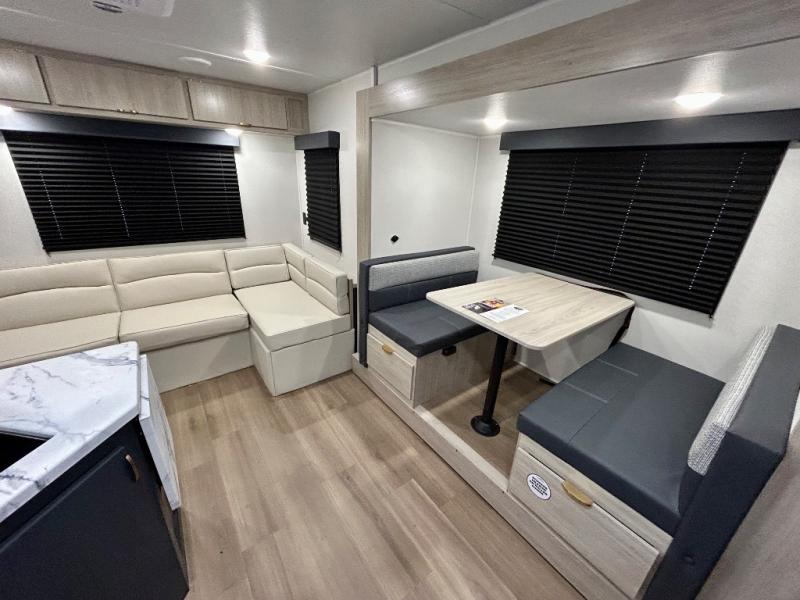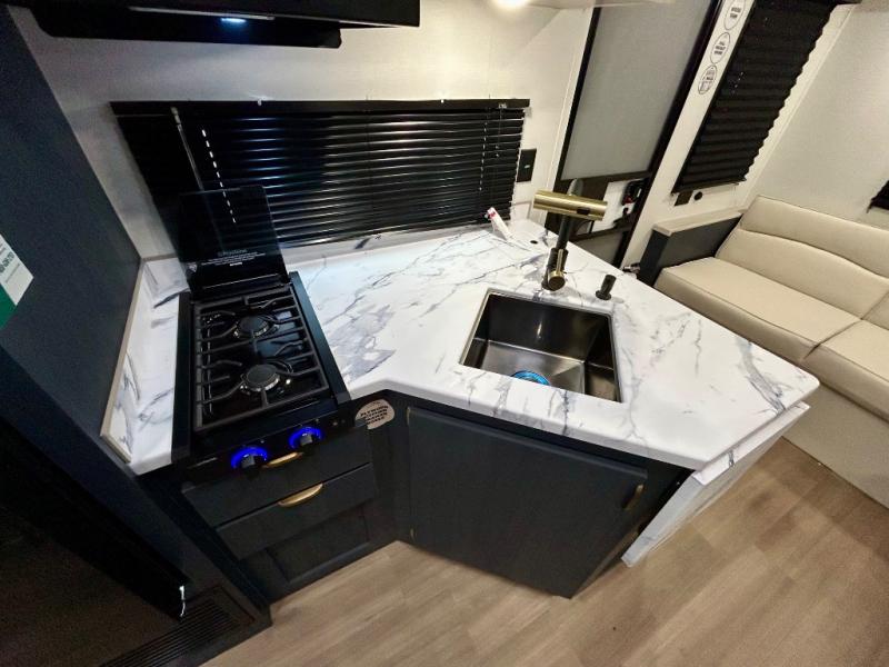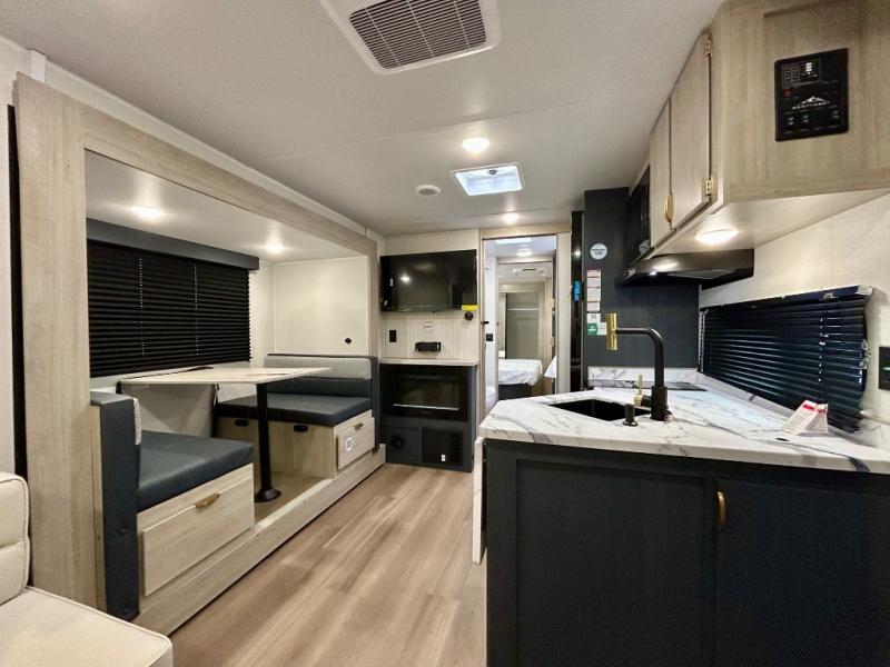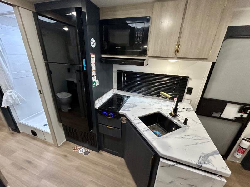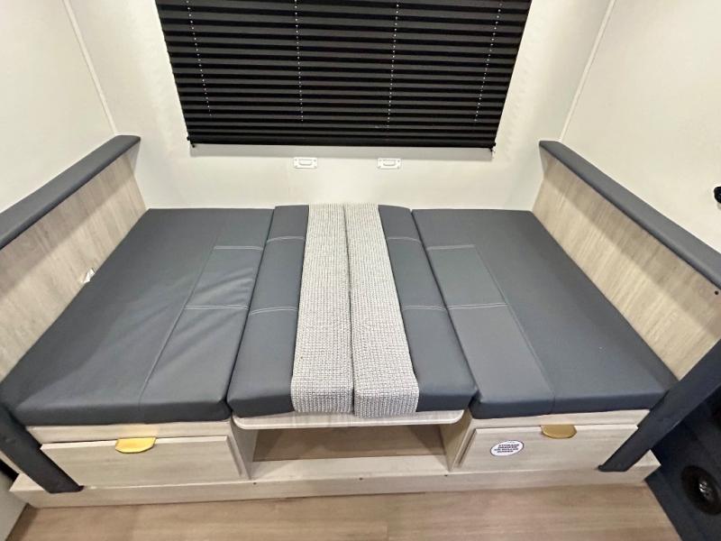 Chill in the plush jackknife sofa or gather around the booth dinette for epic game nights and laughter-filled meals. The countertop extension gives you extra space to whip up culinary masterpieces or tackle projects. The kitchen has everything you need: a sleek two-burner cooktop with a microwave below for speedy bites, a fridge to stash your faves, and overhead cabinets for clutter-free bliss. Furthermore, our walk-through bathroom is the perfect oasis, and you can get laundry sorted with washer/dryer prep and a handy hamper located in the bedroom. Also in the bedroom, you can sink into the front queen bed with heaps of storage underneath, and the wardrobe keeps your gear organized, so you can focus on making memories.